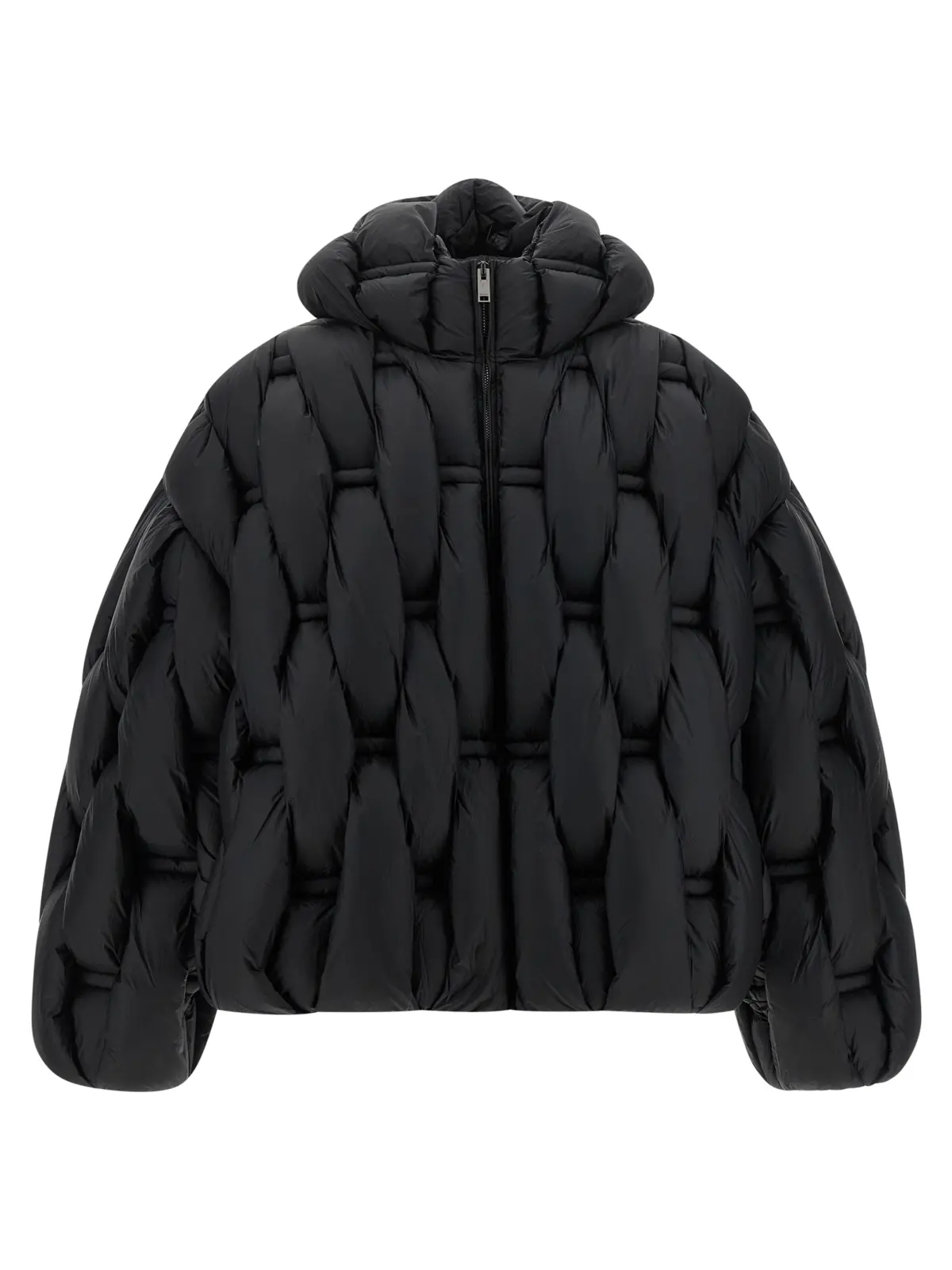 Пуховик 3D чорного кольору унісекс поєднує інноваційний плетений об’ємний дизайн із високоякісним нейлоном і наповнювачем із гусиного пір’я, забезпечуючи неперевершений комфорт і тепло. Модель з капюшоном, високим коміром та функціональними деталями підкреслює стиль і статус, ідеально пасуючи для витонченого міського образу.