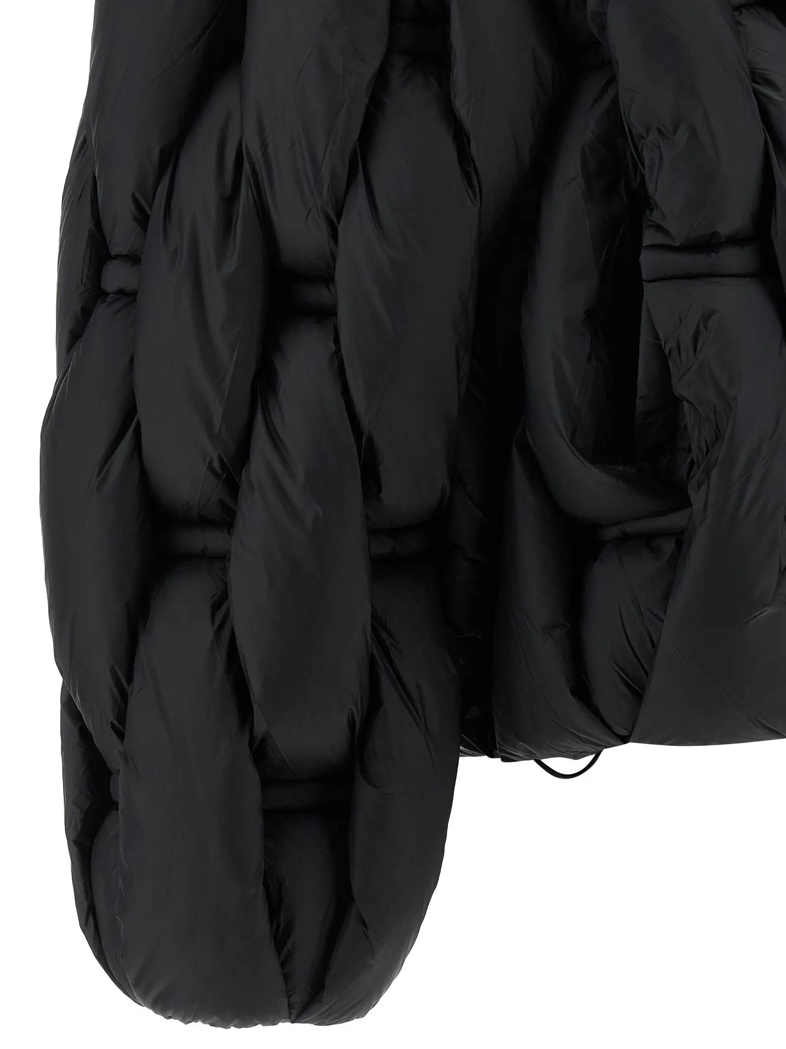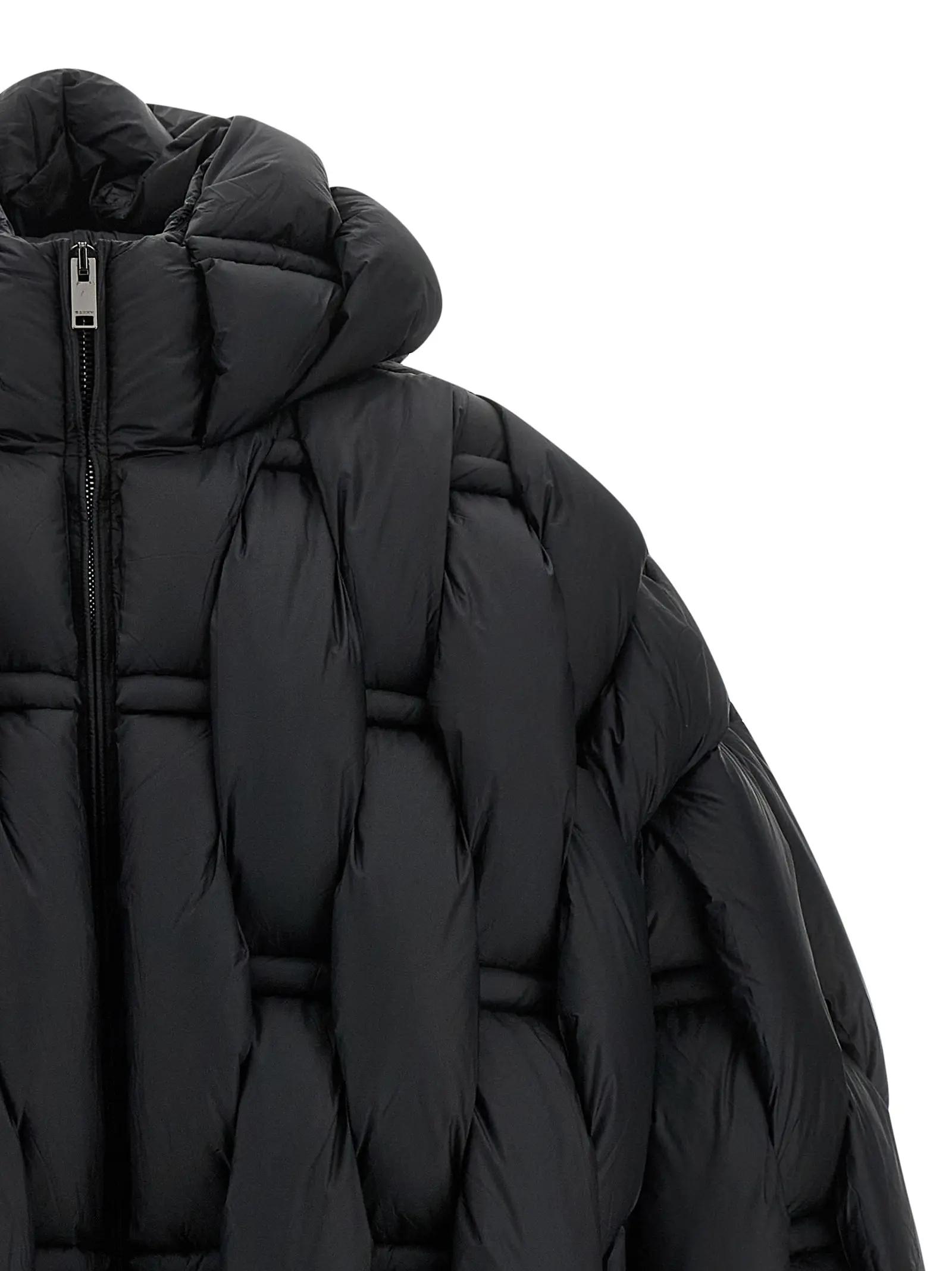 Виготовлений з 100 відсотків нейлону. Наповнювач з гусиного пір’я. Модель з капюшоном і високим коміром. Передня застібка на блискавку. Наявні кишені. Довгі рукави з манжетами і занижена лінія плечей. Регулювання по низу за допомогою шнурка. Об’ємна структура з плетеним 3D візерунком.