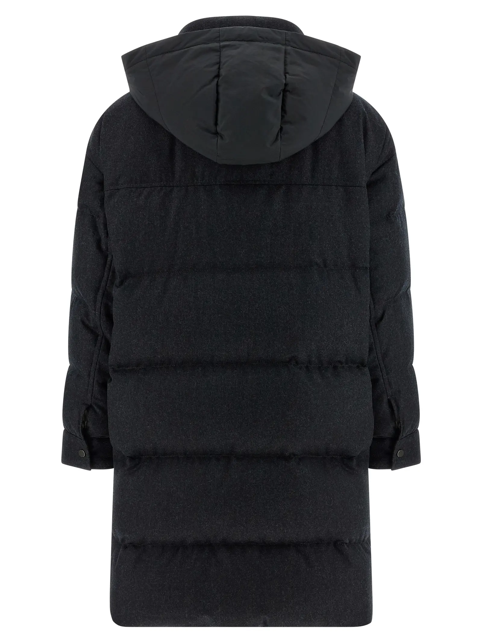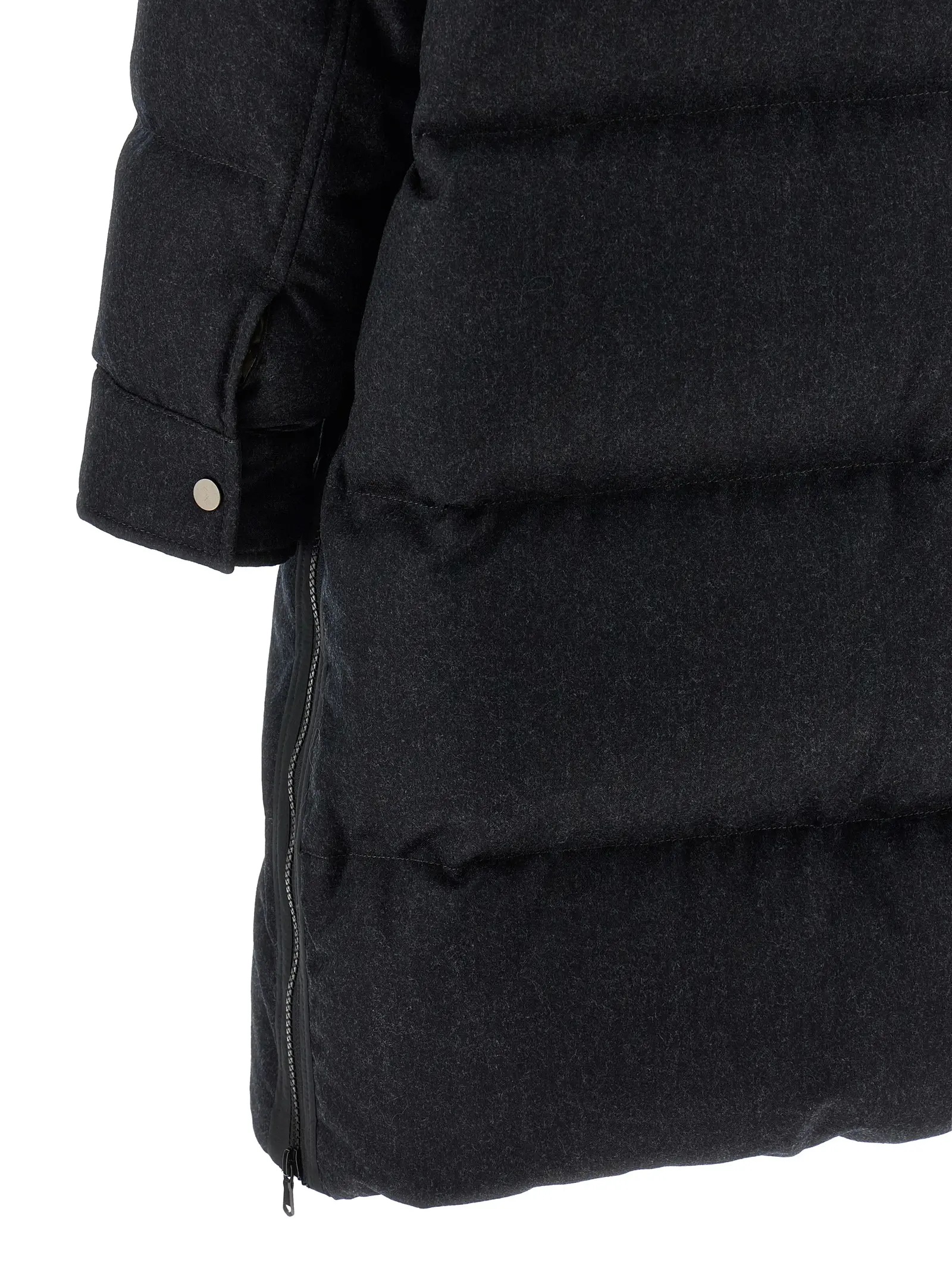 Довге стьобане пальто виконане з вовни. Має водовідштовхувальне покриття. Усередині підкладка з нейлону з гусячим пухом. Капюшон знімний. Комір стійка з в’язаною підкладкою. Застібається на блискавку з декоративним елементом. Є кишені. Рукави довгі з манжетами. З боків розрізи на блискавках. Склад матеріалу 100% нова вовна.