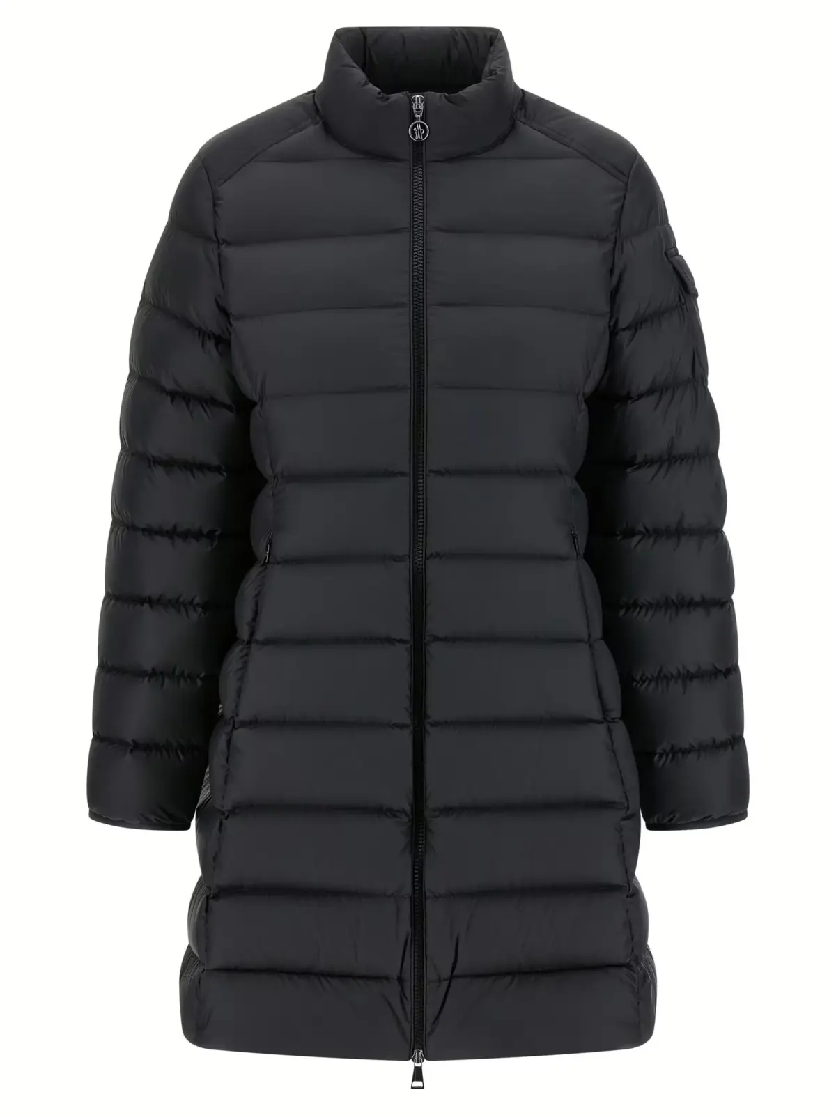 Чорний пуховик із мікрофібри з матовою фактурою та наповнювачем із гусиного пуху поєднує інноваційний дизайн із бездоганною якістю. Витончена розкльошена силуетність, високий комір і функціональні деталі створюють елегантний образ, що підкреслює статус і універсальність у будь-яких умовах.