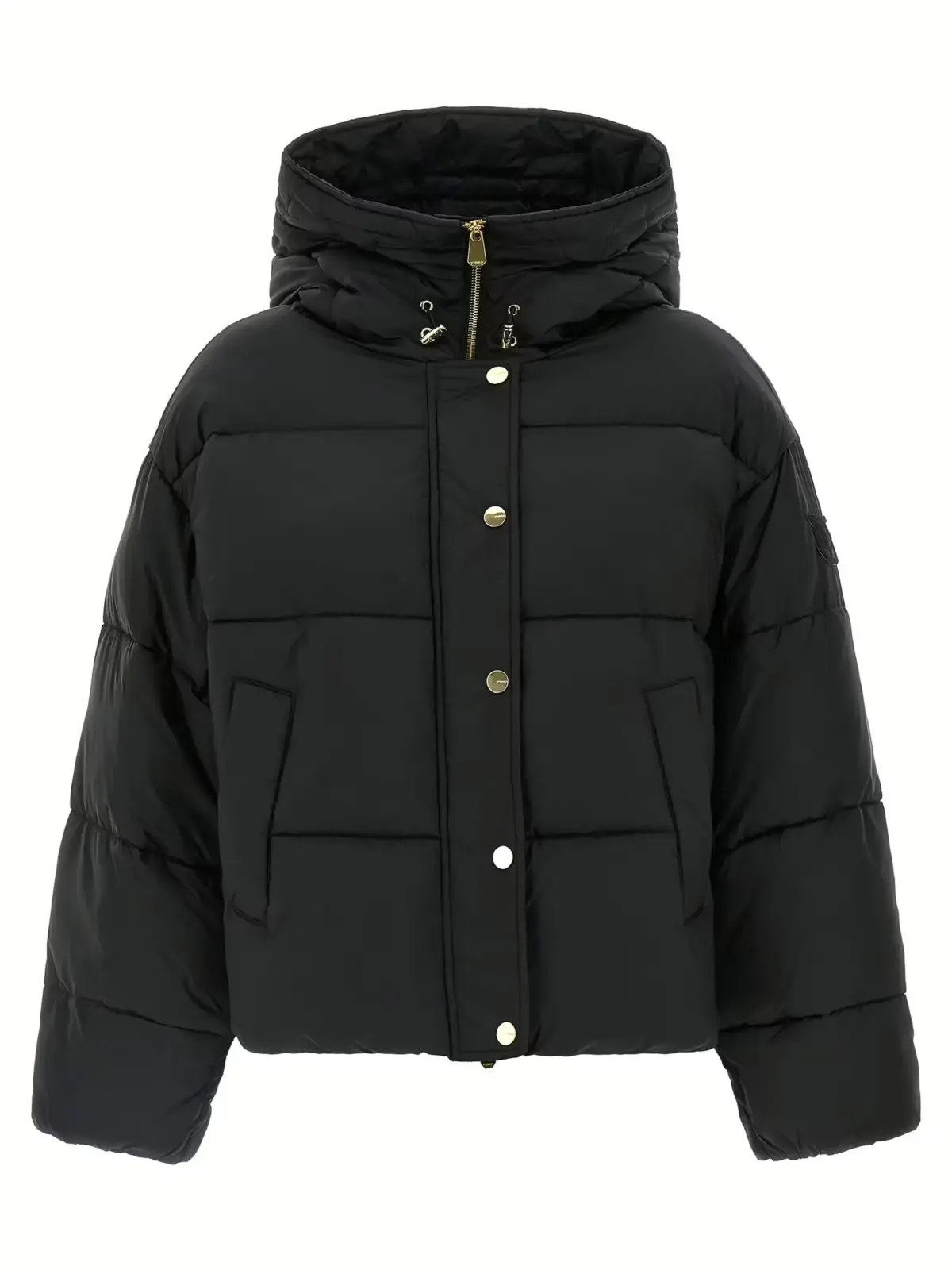 Жіночий пуховик Impasto від Pinko виконаний із технічного канвасу з наповнювачем пуху, має напівглянцеву поверхню, великий регульований капюшон, високий комір, застібку на блискавку та кнопки, елегантні довгі рукави з еластичними манжетами і тональну емблему Love Birds. Цей виріб поєднує інноваційність, комфорт і стиль, підкреслюючи статус і вишуканість власниці.