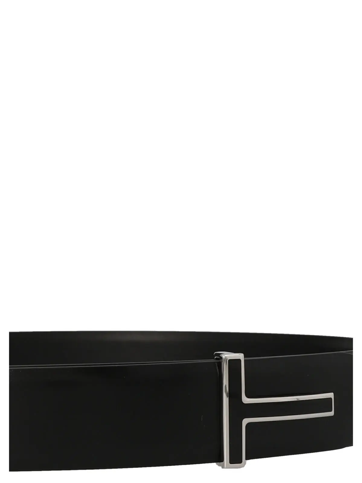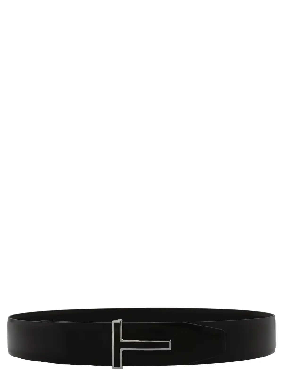 Чоловічий чорний ремінь від T Tom Ford, виготовлений із 100% телячої шкіри (bos taurus), вирізняється своєю унікальною пряжкою у формі металевої літери ‘T’.