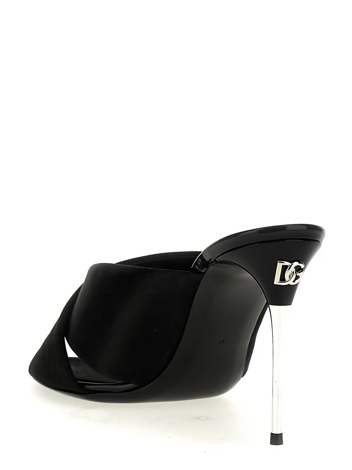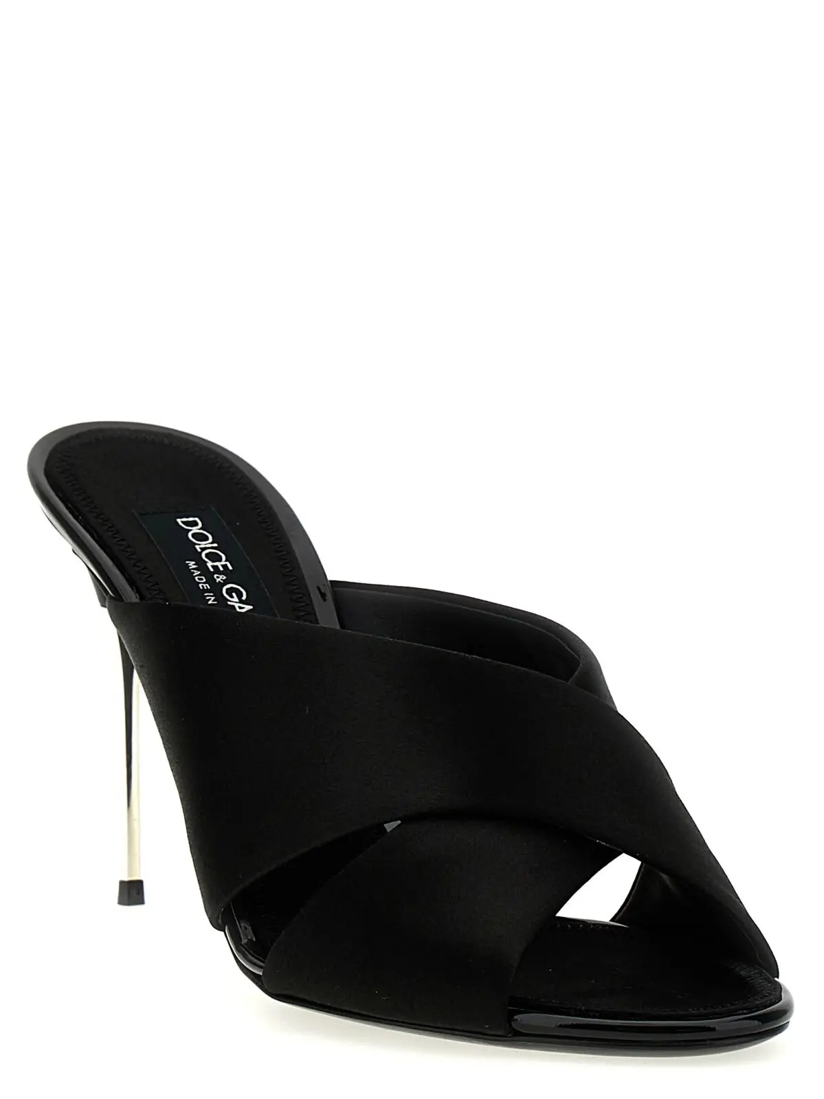 Жіночі чорні атласні сандалі Dolce & Gabbana з блискучими шкіряними деталями, перехресними ремінцями на передній частині та металевим брендованим підборами. Склад: 46% віскози, 32% льону, 22% шовку.