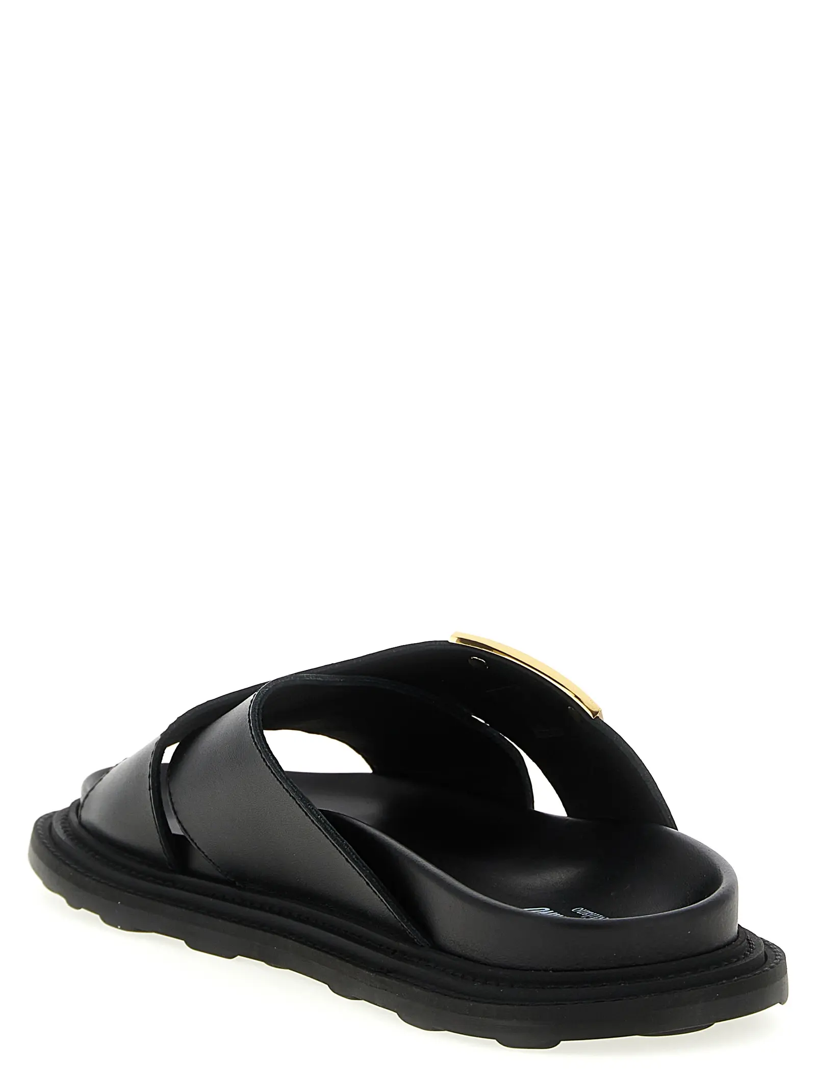 Чоловічі сандалії з натуральної шкіри чорного кольору поєднують вишуканий дизайн із сучасною функціональністю, оснащені металевою пластинкою з гравіюванням логотипу спереду та міцною гумовою підошвою, що забезпечує комфорт і довговічність, підкреслюючи статус і стиль власника.