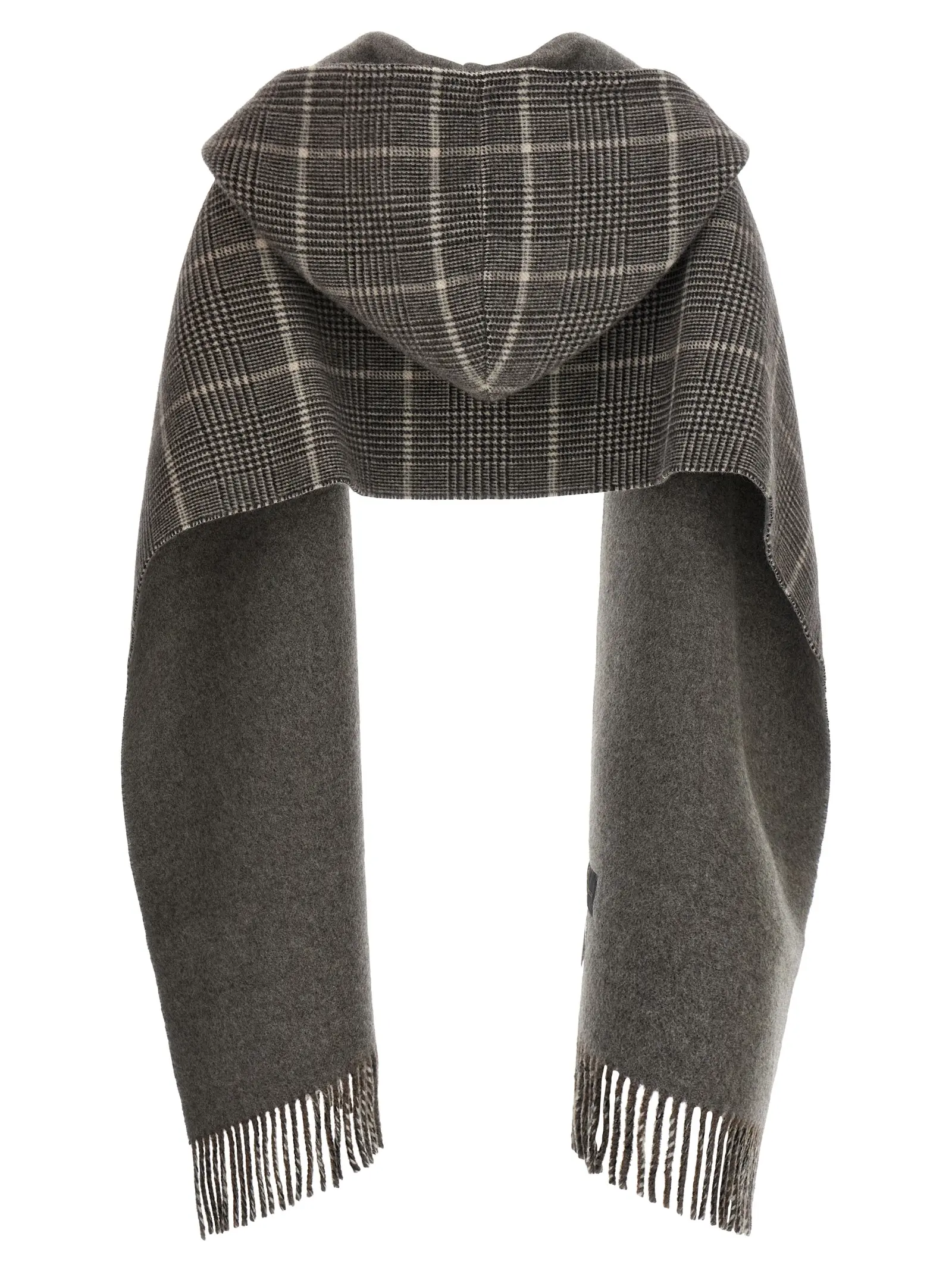 Витончений жіночий шарф із двостороннім дизайном поєднує ніжний кашеміровий капюшон у клітинку та однотонну бежеву поверхню з витонченими бахромами. Виготовлений із 100% кашеміру, цей аксесуар вирізняється бездоганною якістю, універсальністю та створює неперевершений стильний акцент для будь-якого образу.