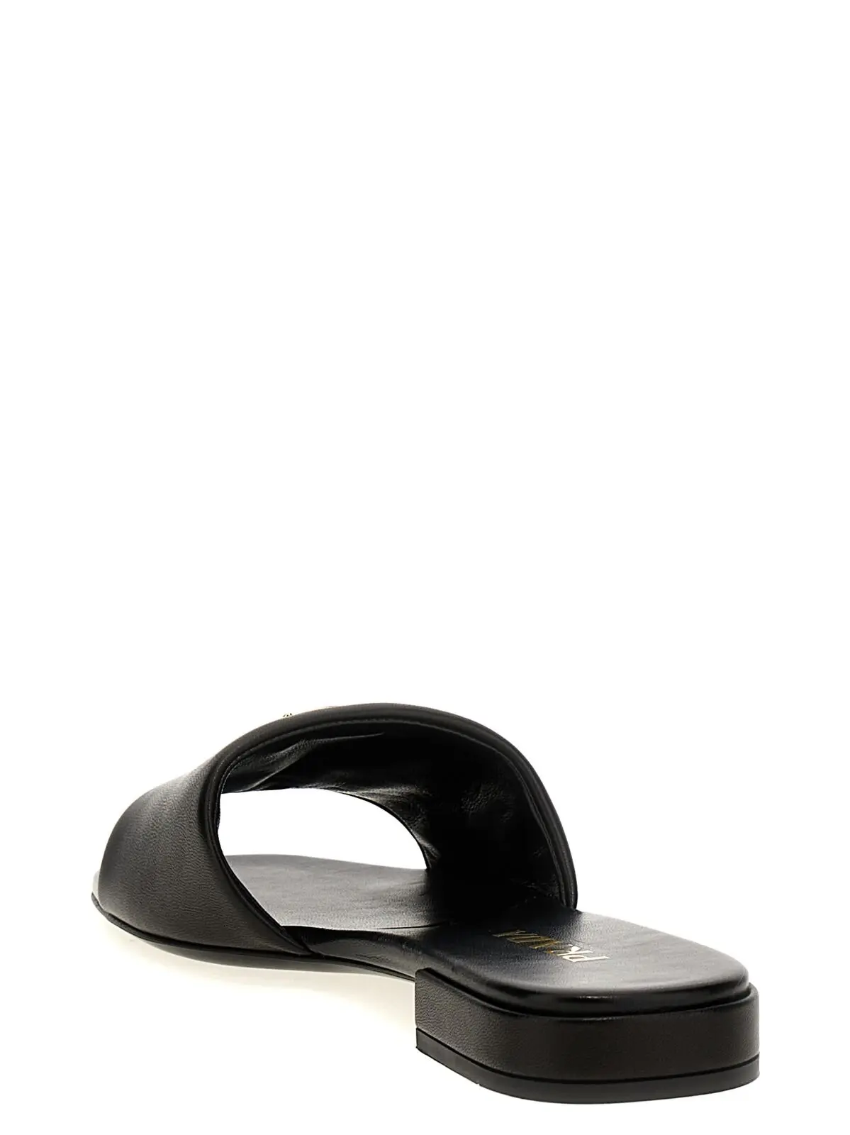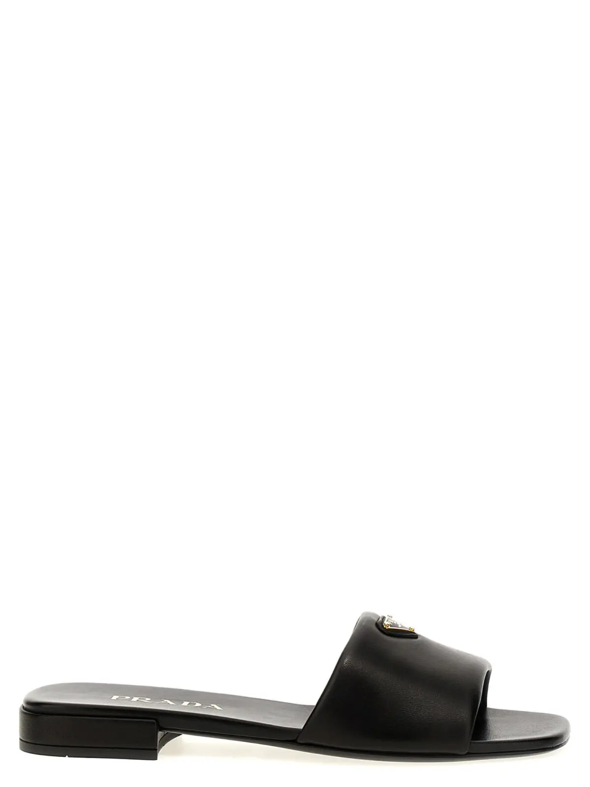 Шкіряні босоніжки Prada Logo в чорному кольорі — це втілення елегантності та сучасного стилю. Виготовлені з 100% ягнячої шкіри, ці босоніжки прикрашені емальованим металевим логотипом у формі трикутника, що додає їм унікальності. Інноваційний дизайн та висока якість матеріалів забезпечують не лише комфорт, а й довговічність. Цей стильний аксесуар чудово доповнить будь-який образ, підкреслюючи статус та витонченість власниці, а також демонструє прихильність до екологічності без шкоди для стилю.