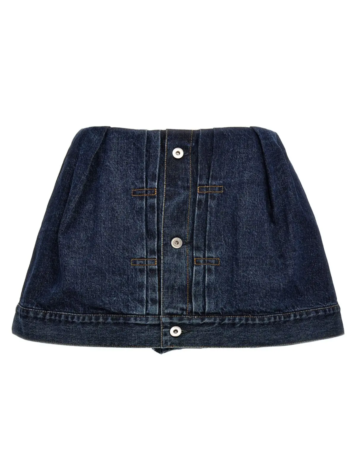 Жіночі шорти-спідниця Sacai у синьому кольорі виконані зі 100% бавовни. Модель відрізняється фронтальною застібкою на ґудзики, задньою блискавкою, контрастними швами та бічними кишенями.