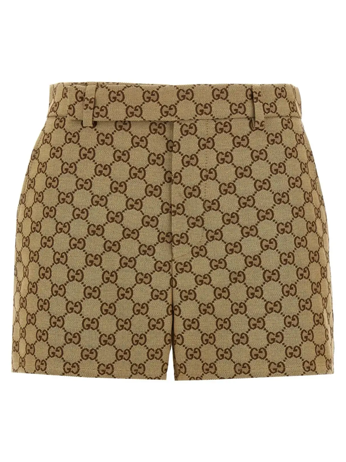 Вишукані жіночі шорти Gucci виготовлені з інноваційної жакардової тканини з бавовни та поліестеру, що забезпечує комфорт і довговічність. Елегантний бежевий відтінок, продуманий дизайн з поясними петлями, застібкою на ґудзик та блискавку підкреслюють статус і стиль, роблячи виріб універсальним вибором для вишуканого гардеробу.