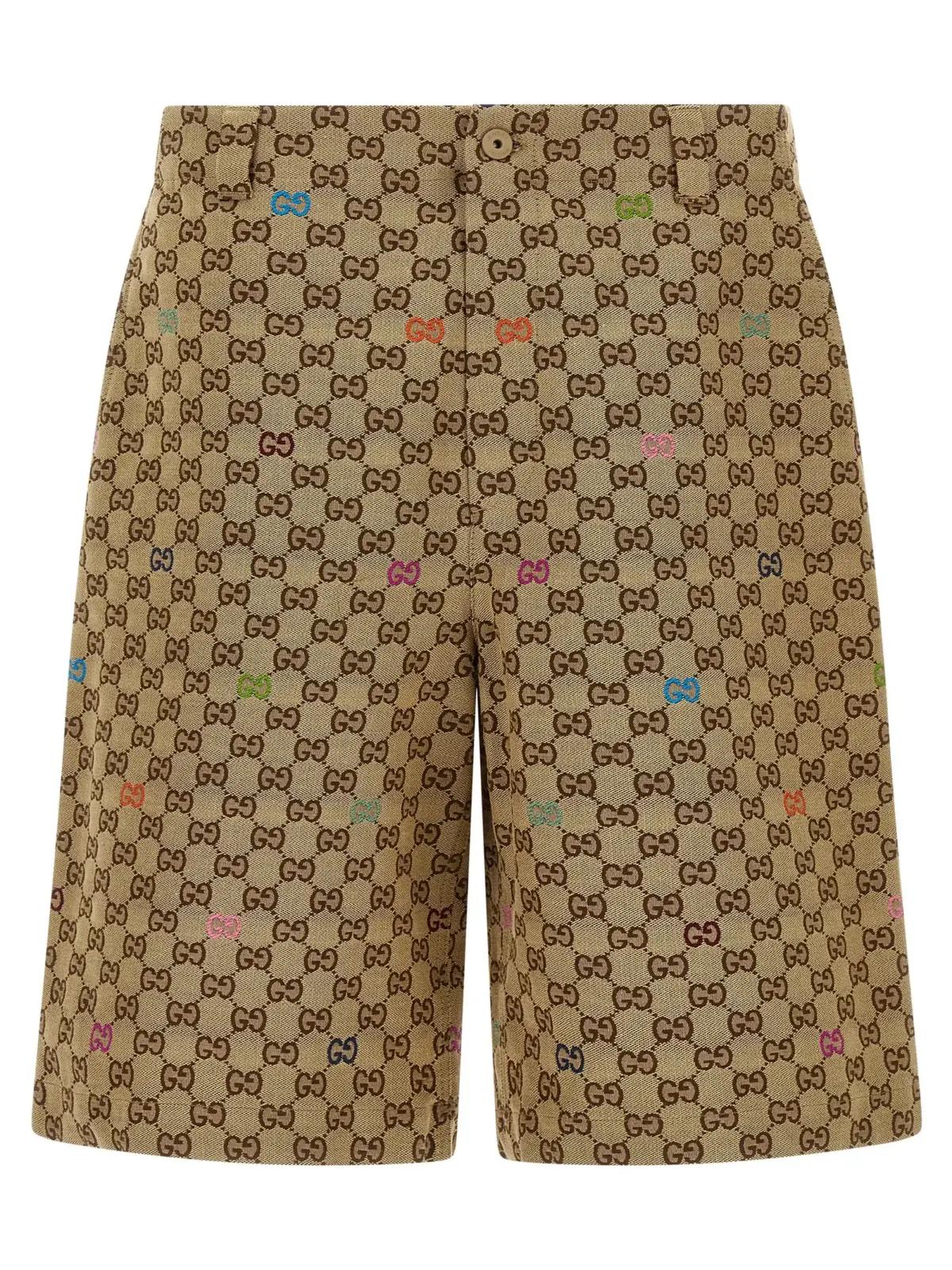 Чоловічі шорти Gucci виконані з високоякісної 100% бавовни з унікальним багатобарвним візерунком у техніці філь купе, що підкреслює вишуканість і інноваційність дизайну. Елегантна бежева палітра, класична застібка на блискавку та ґудзик, а також функціональні кишені створюють ідеальний баланс стилю та комфорту, підкреслюючи статус і неповторний смак власника.