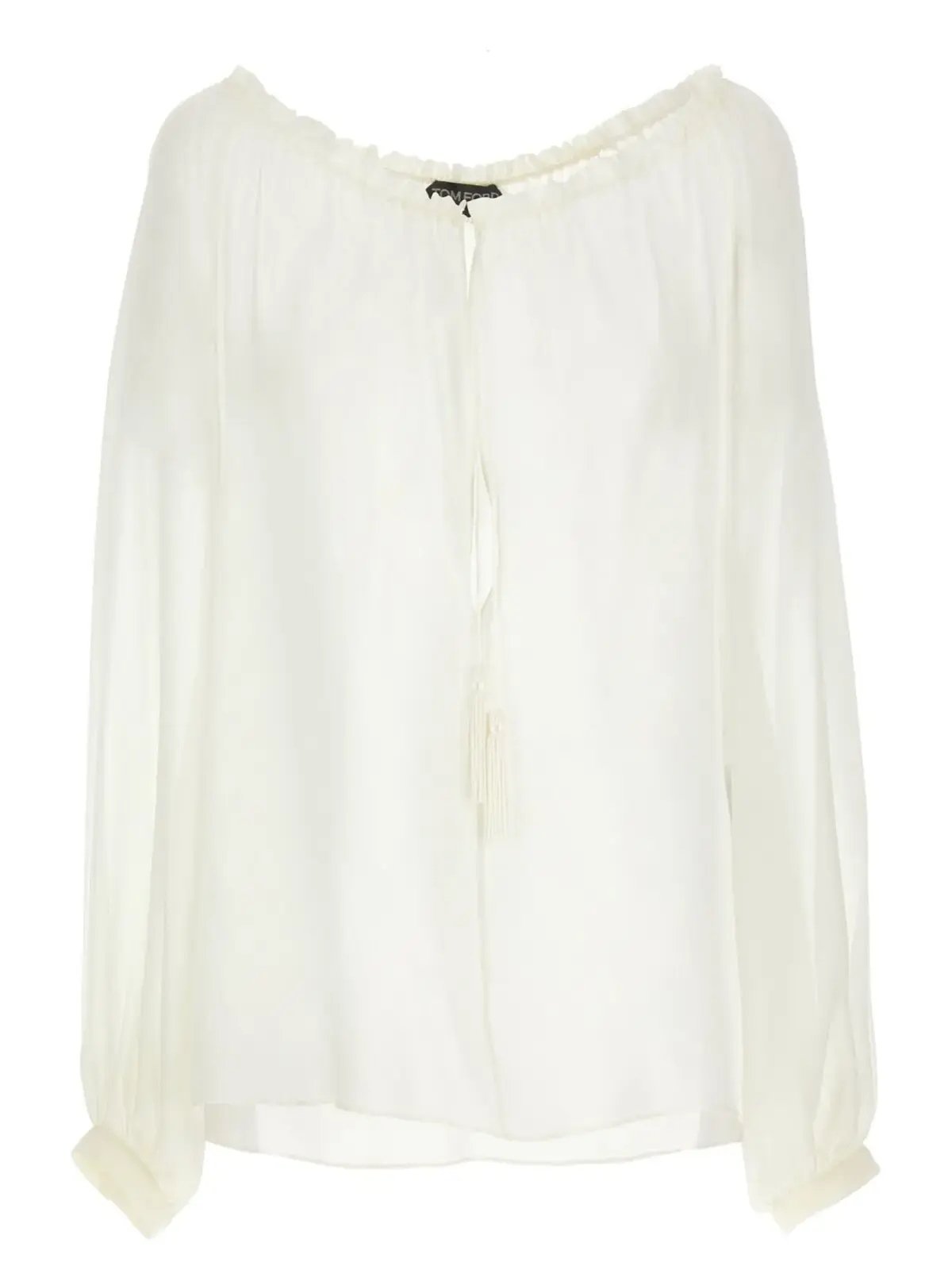 Шовкова блуза Tom Ford вишуканого білого кольору є втіленням елегантності та стилю. Виготовлена з 100% шовку, вона характеризується ніжною текстурою та легкістю. V-подібний виріз з регульованим шнурком дозволяє модулювати форму, підкреслюючи жіночність, а довгі рукави з манжетами додають елегантності. Ця блуза ідеально підходить для будь-якої нагоди, підкреслюючи статус та індивідуальність своєї власниці. Інноваційний дизайн поєднує в собі розкіш та функціональність, роблячи цей виріб універсальним елементом гардеробу.