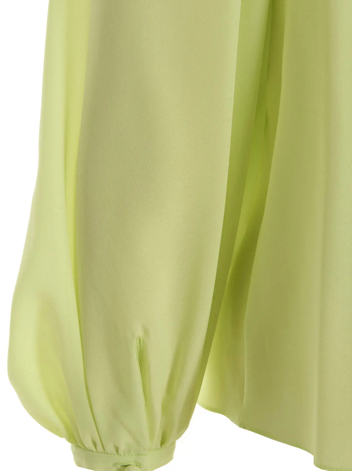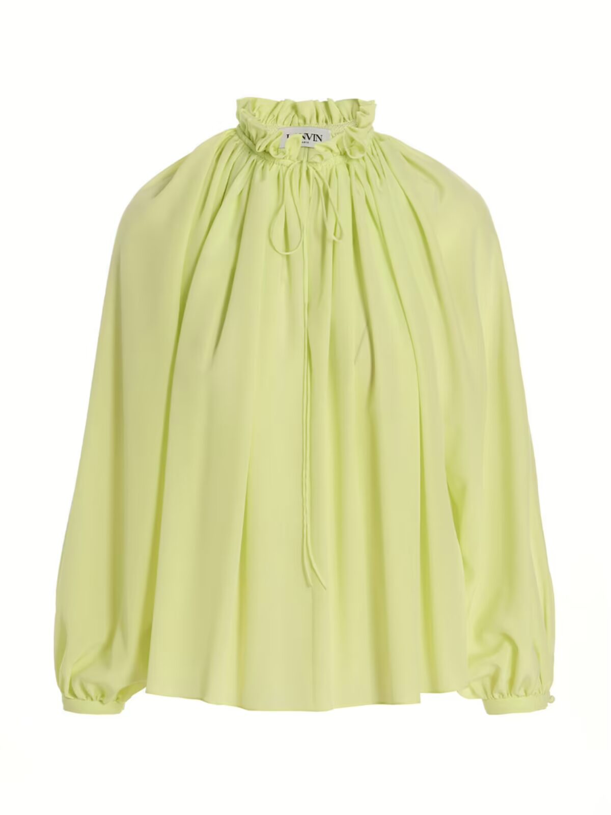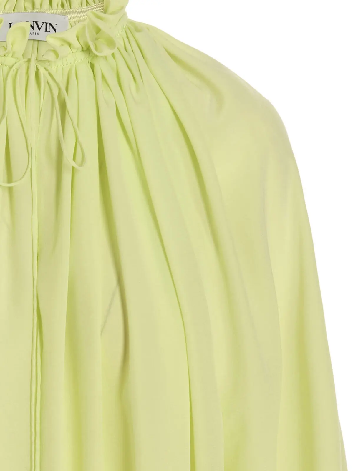 Жіноча шовкова блузка Bloshirt Lanvin в жовтому кольорі з високим комірцем з можливістю регулювання за допомогою завязок і довгими манжетами. Виготовлена з 100% шовку.