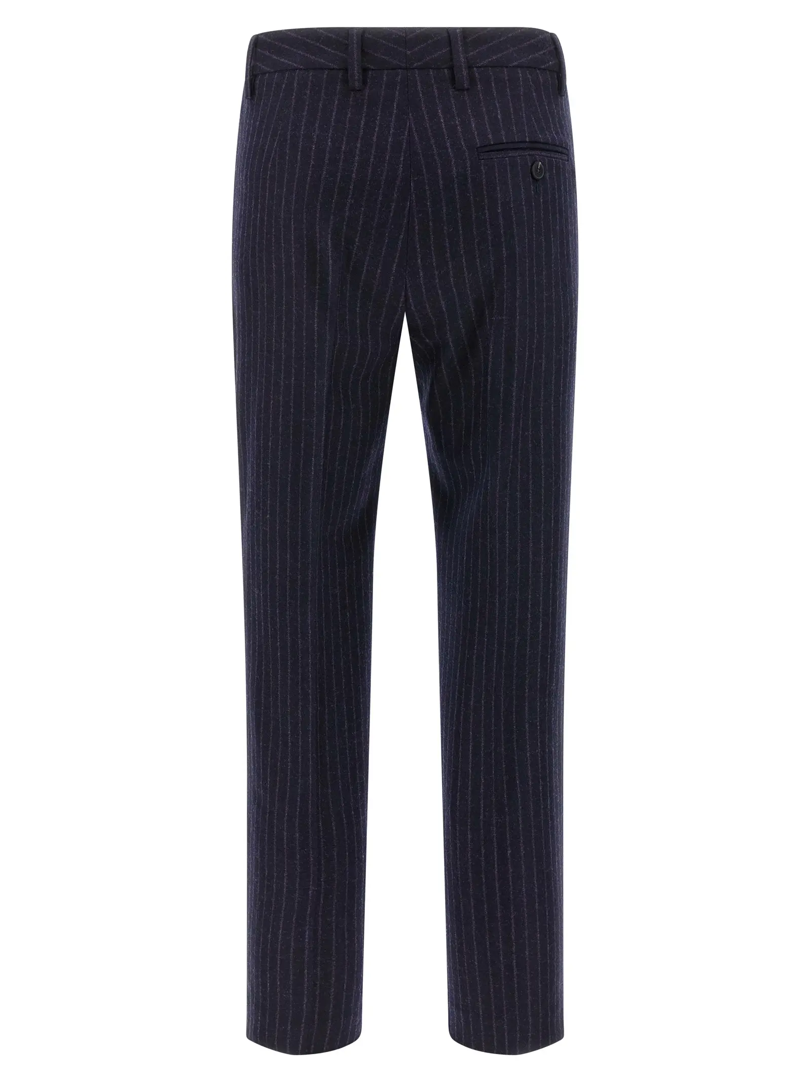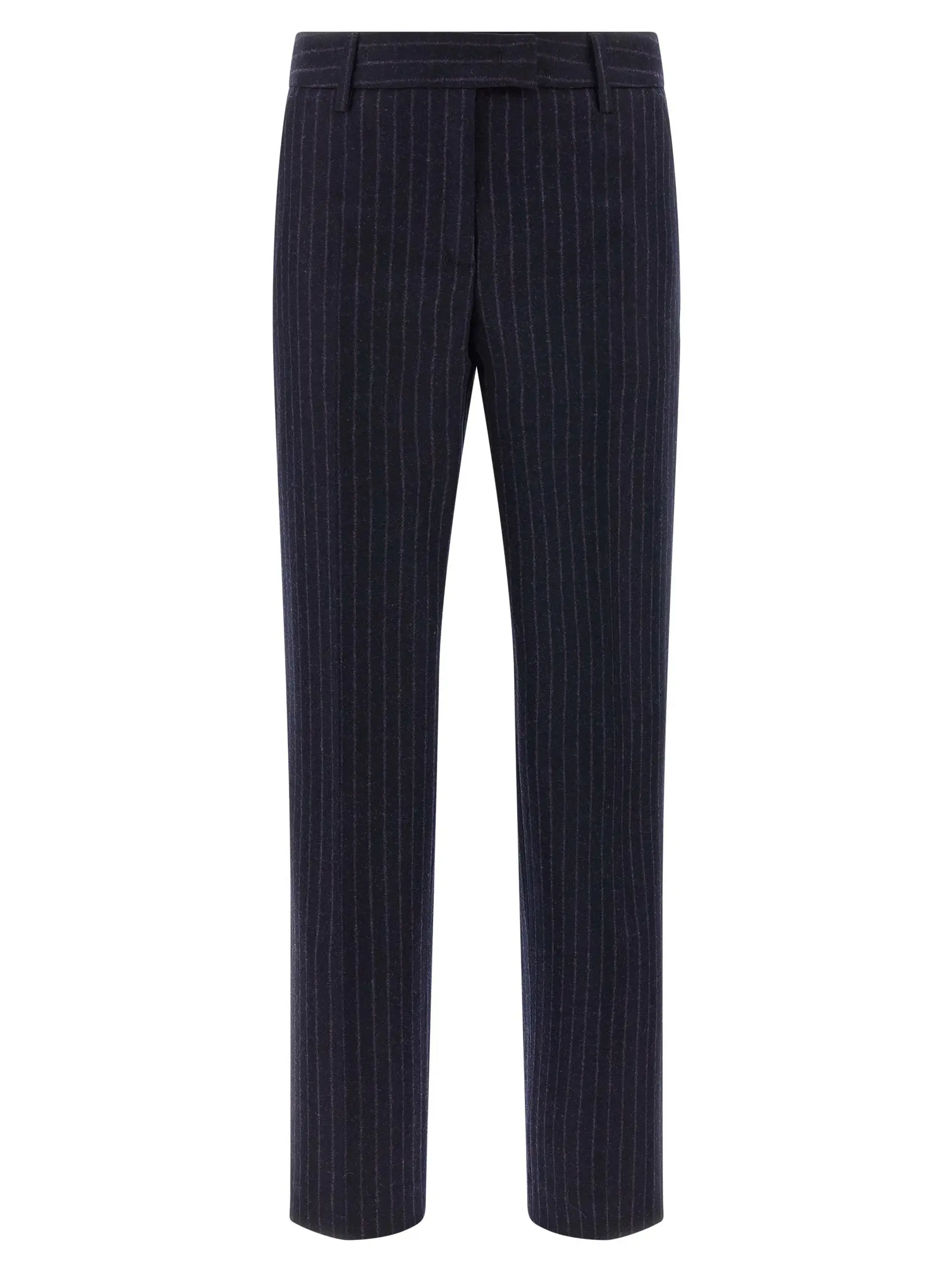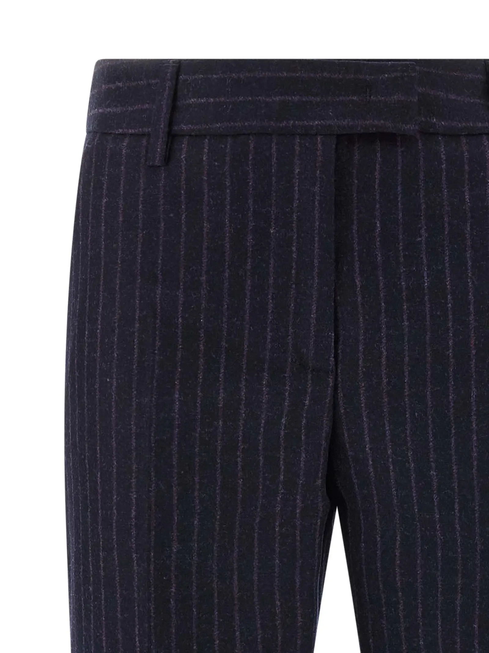 Вишукані жіночі штани синього кольору з тонким смугастим візерунком виготовлені з 100% первинної вовни, що забезпечує неперевершену м’якість і довговічність. Елегантний прямий крій із витонченими складками та функціональним застібанням підкреслює витонченість стилю, надаючи виробу статусності та універсальності для будь-яких випадків.
