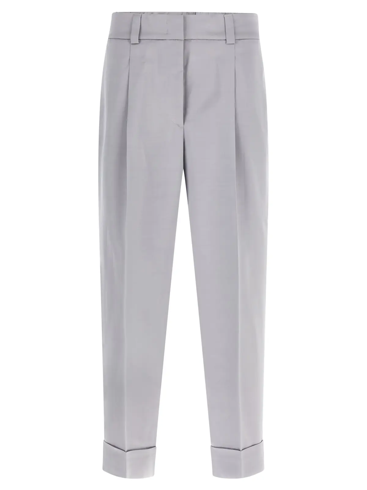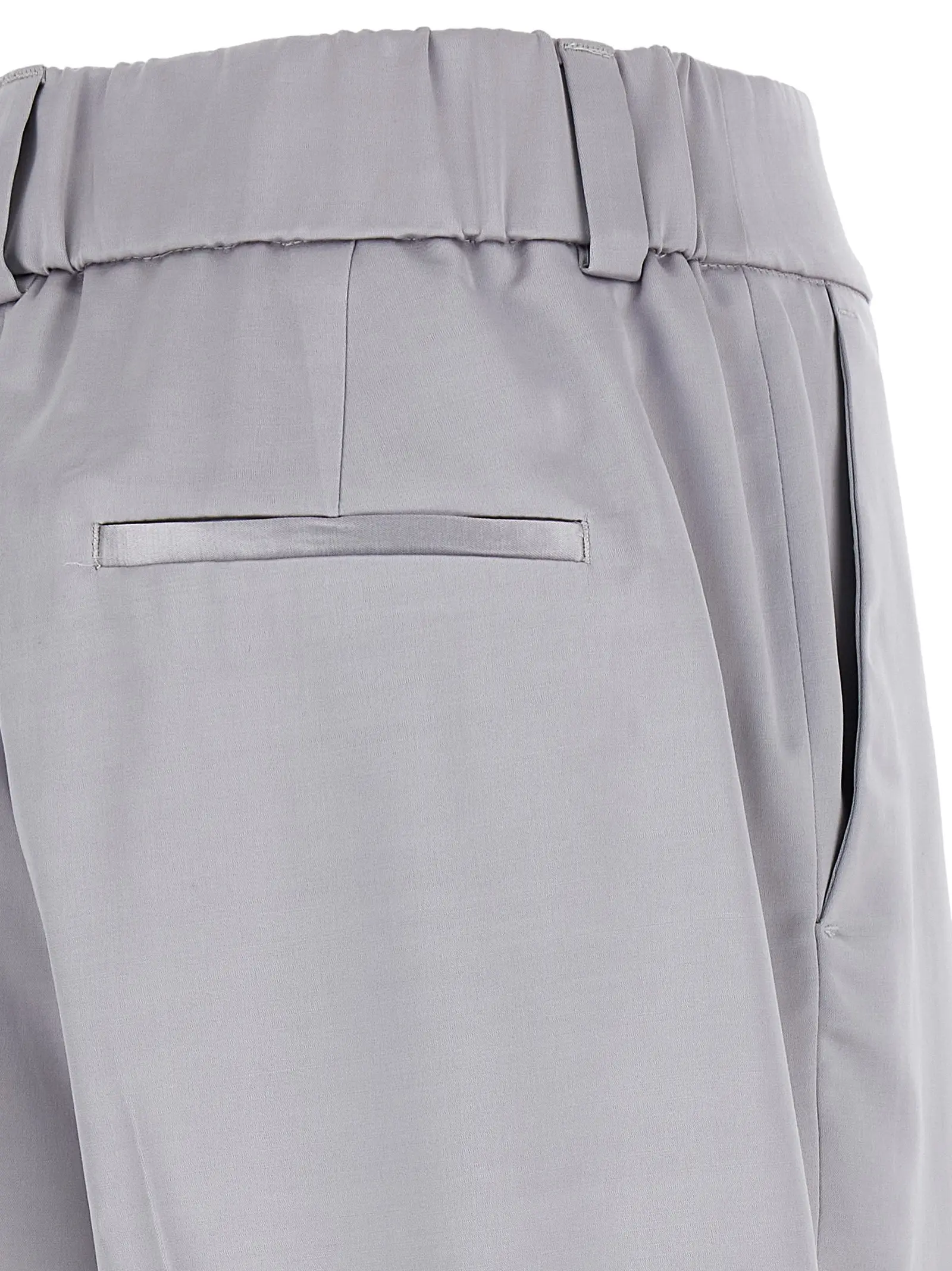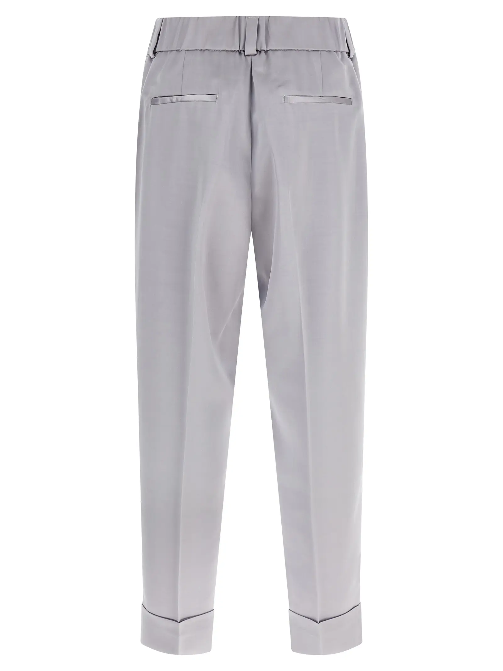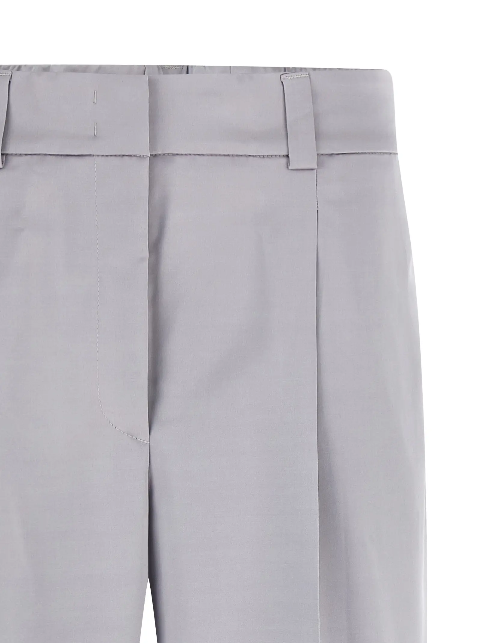 Штани укороченого крою. Виготовлені з віскози та вовни. Присутні плісе. Є прасована складка спереду. Застібаються на блискавку, гачок і ґудзик. Має кишені. Низ штанів оформлений відворотами.