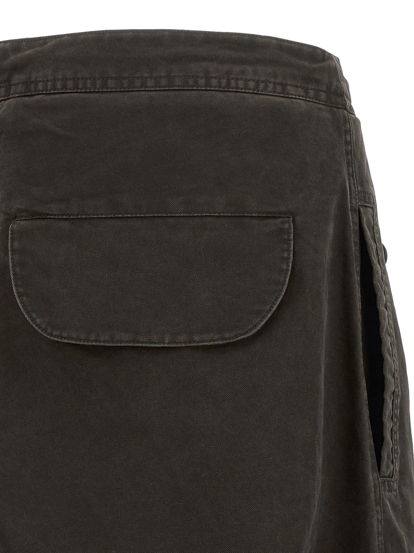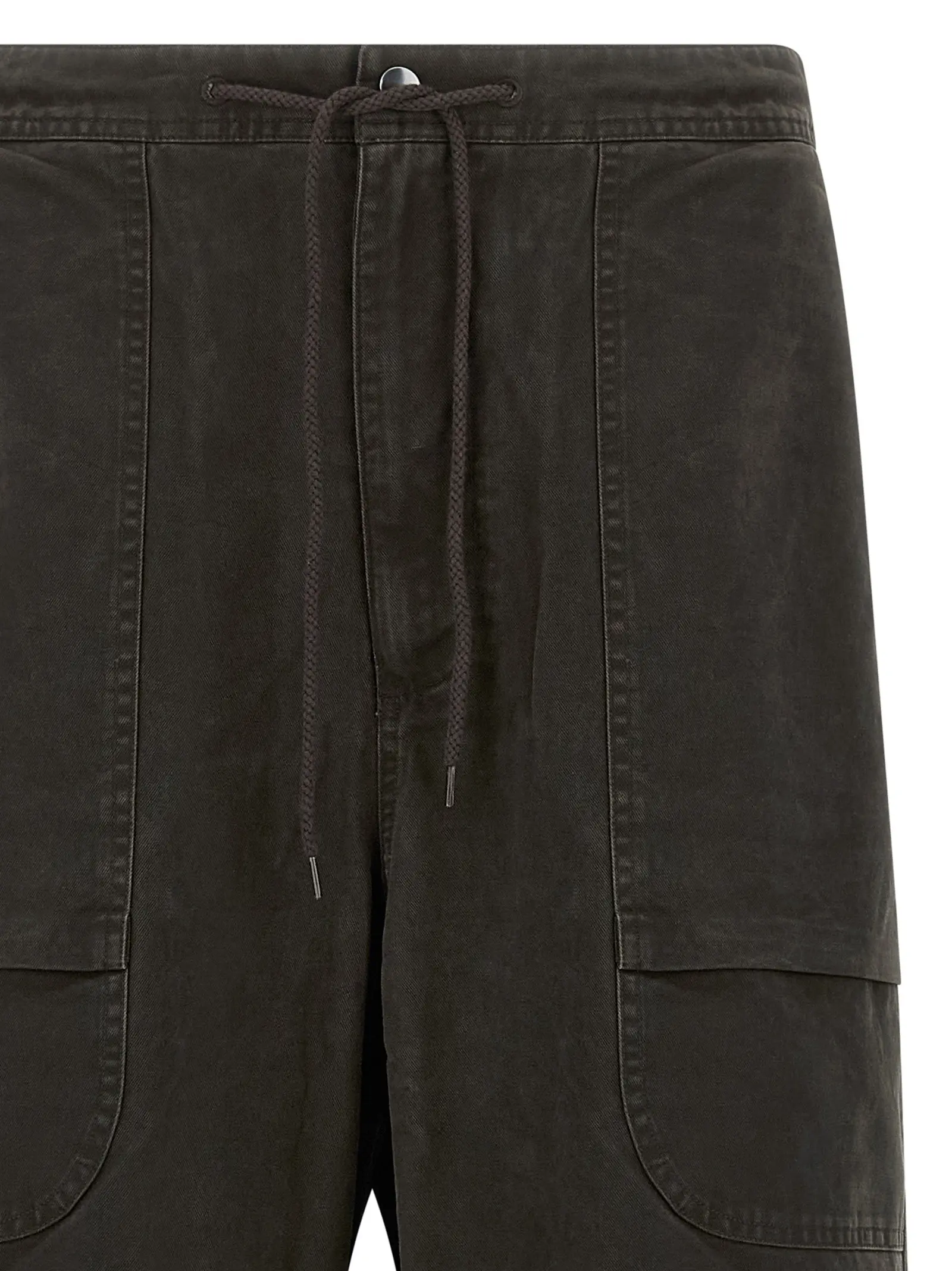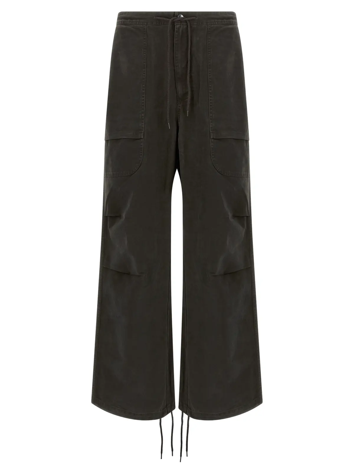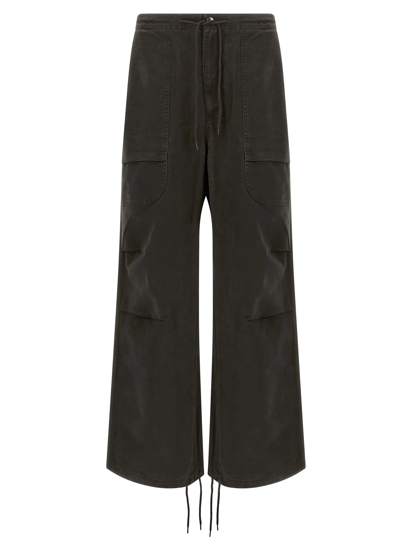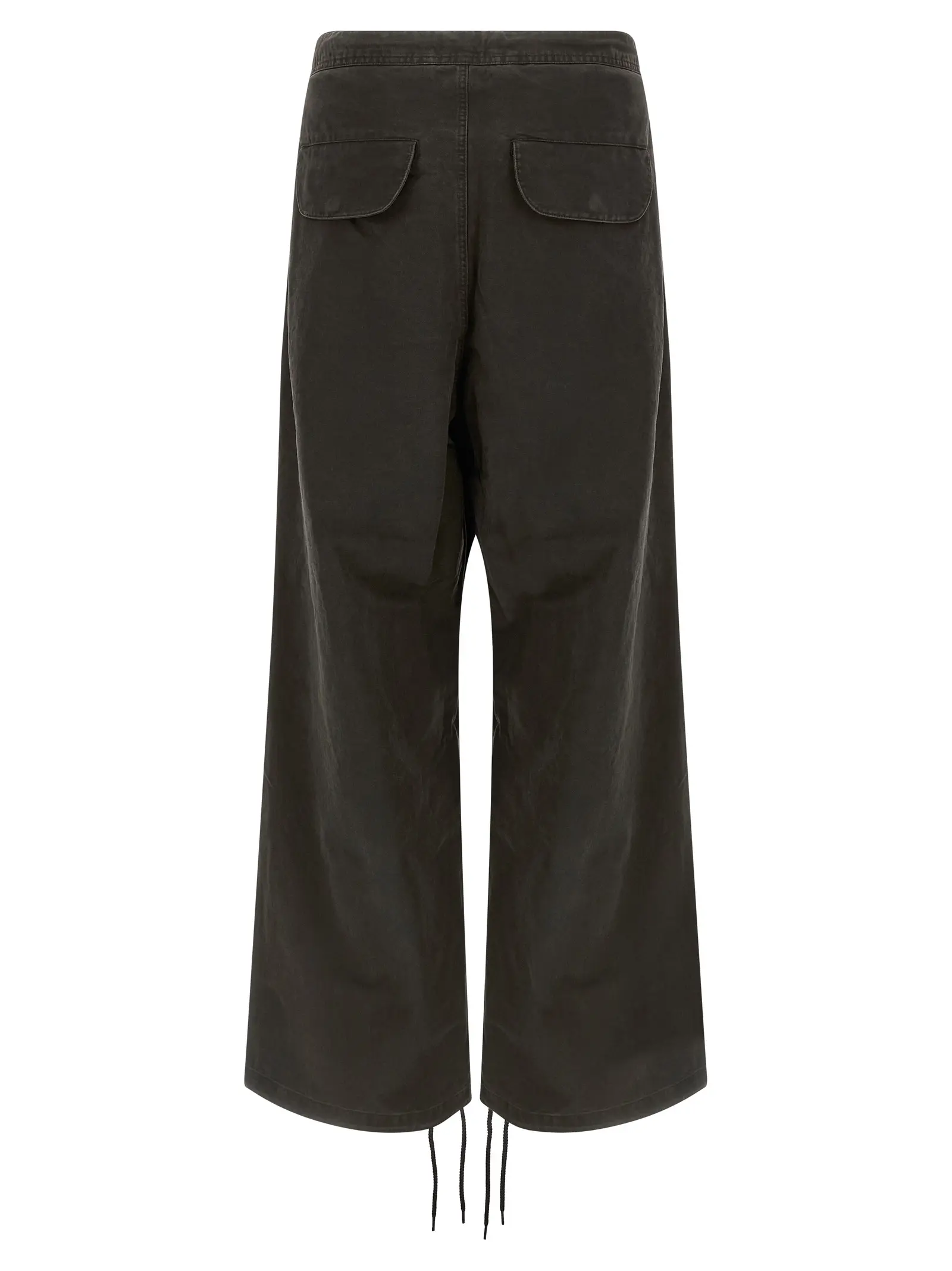 Штани виготовлені з 100% бавовни. Мають широкий і прямий крій штанин. Оснащені накладними кишенями в стилі карго. Застібаються на блискавку та передню ґудзик. Має шнурок на талії для регулювання посадки. Низ штанин обладнаний шнурком. Модель з низькою посадкою кроку. Присутні складки на передній частині.