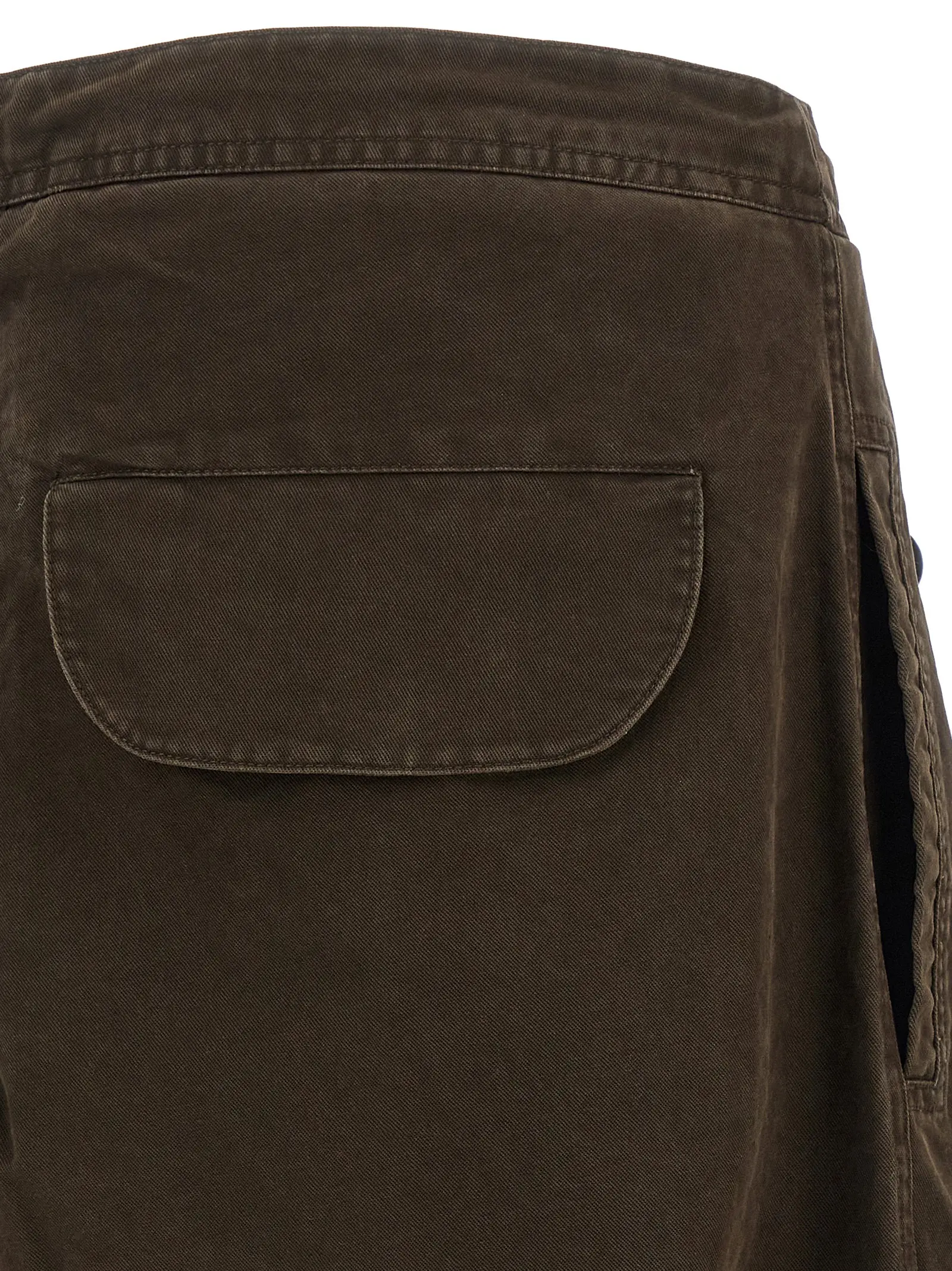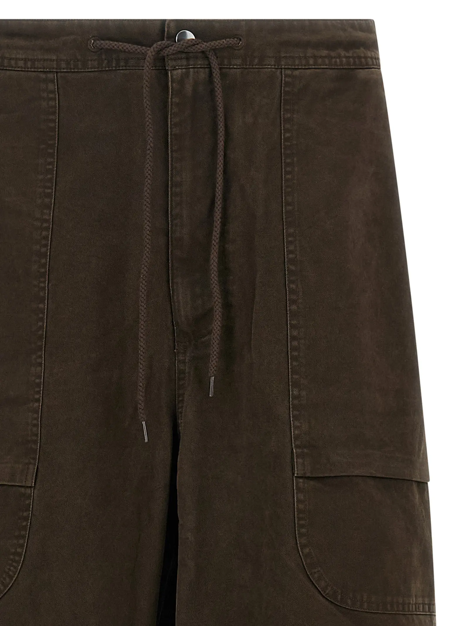 Штани виготовлені з 100% бавовни. Має широкий прямий крій штанин. Оснащені накладними кишенями в стилі карго. Застібаються на блискавку та передню кнопку. На талії є шнурок для регулювання. Низька лінія кроку. Присутні складки на тканині. Внизу штанин передбачений шнурок для регулювання обсягу.