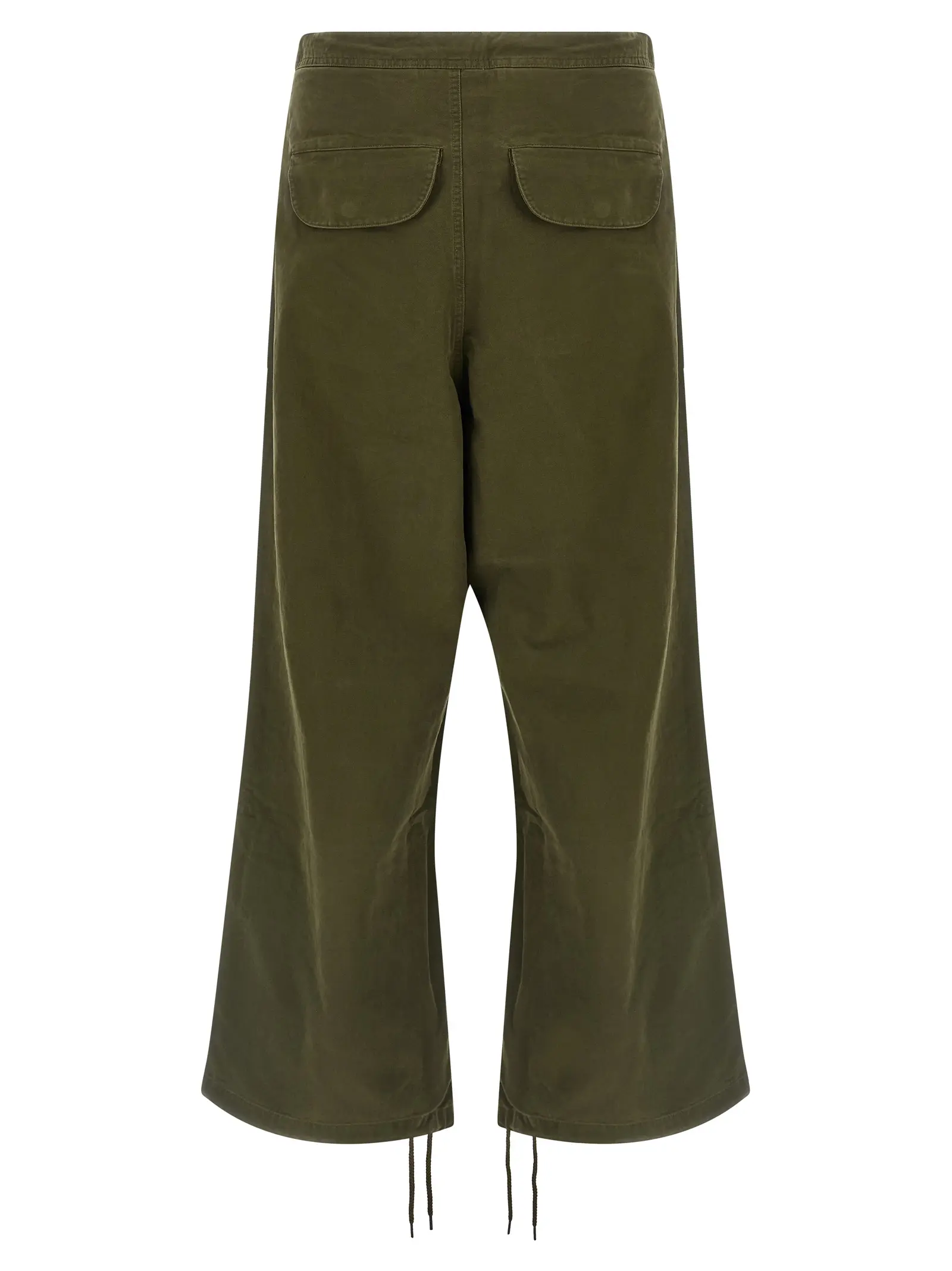 Штани виготовлені з 100% бавовни. Має широкий і прямий крій штанин. Оснащені накладними кишенями в стилі карго. Застібаються на блискавку та передню ґудзикову планку. На талії є шнурок для регулювання. Має низьку посадку кроку. Присутні складки на передній частині. Нижній край штанин регулюється за допомогою шнурка.