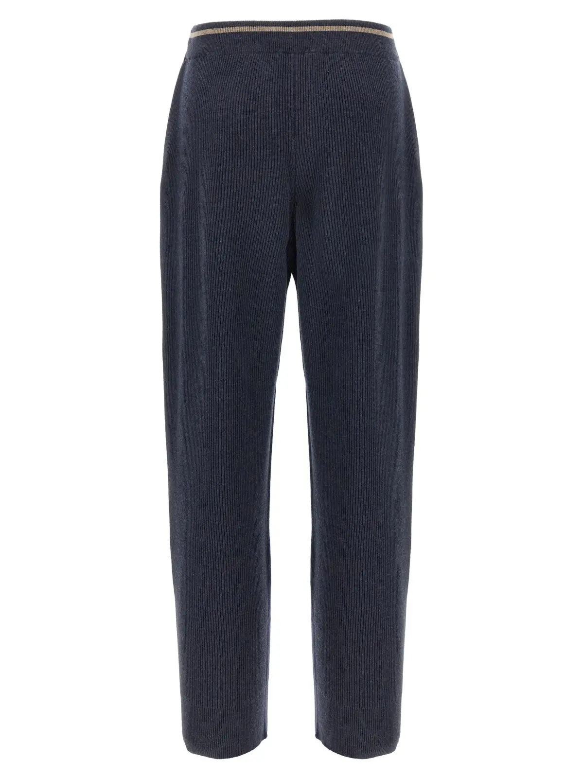 Елегантні жіночі штани синього кольору з англійської ребристої в’язки з кашеміру та шовку поєднують у собі виняткову якість, інноваційний дизайн і комфорт. Модель з прямими штанинами, регульованим еластичним поясом із зав’язками, декоративною клапанною планкою та практичними кишенями підкреслює статус і витонченість будь-якого образу, забезпечуючи універсальність і стиль.