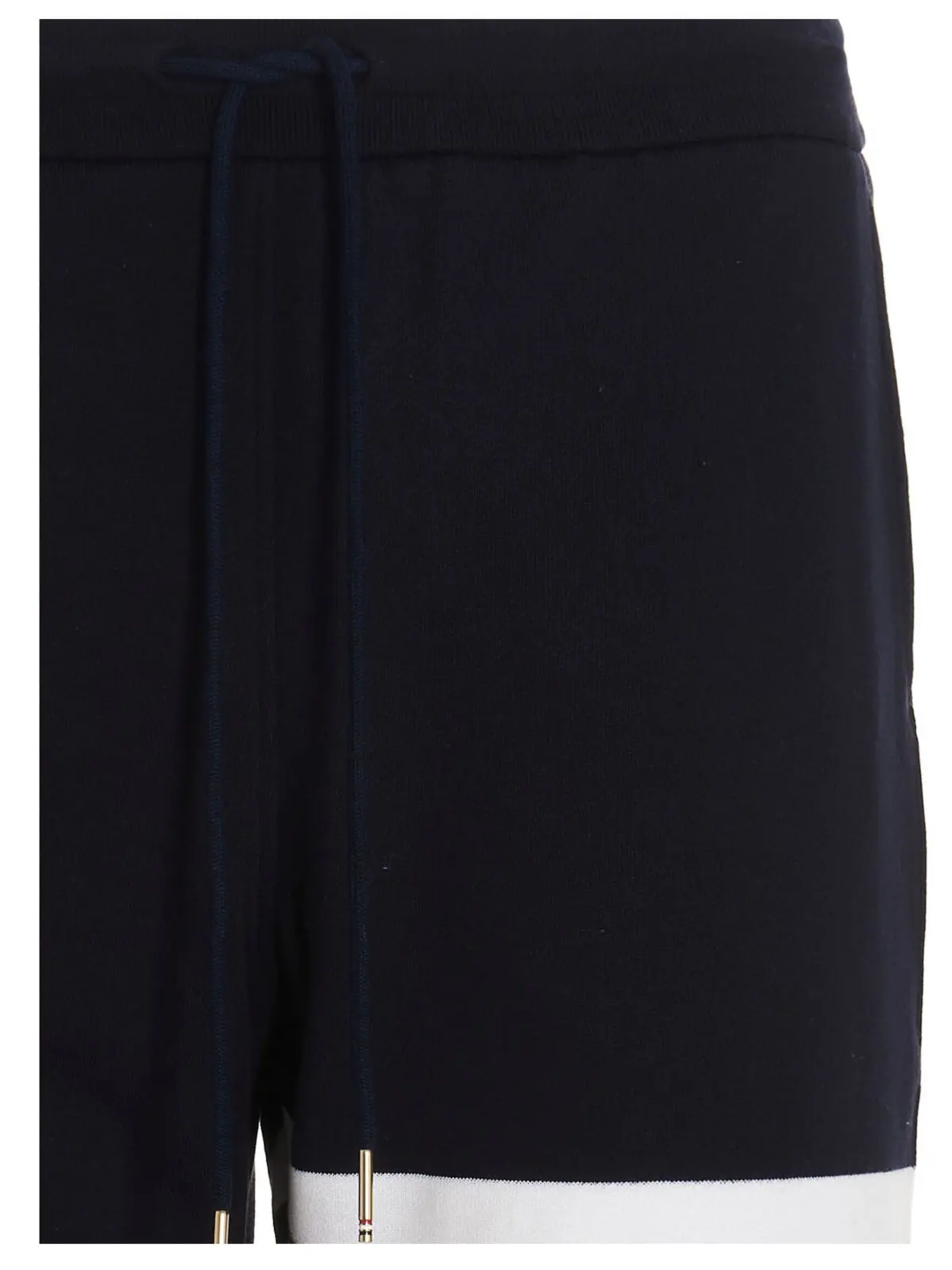 Бавовняні штани для бігу Thom Browne в синьому кольорі з еластичним поясом на шнурку, контрастними смужками і манжетами на низу штанин.