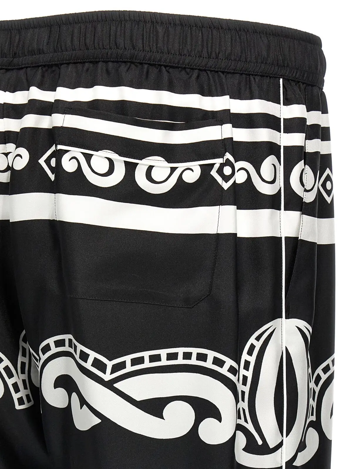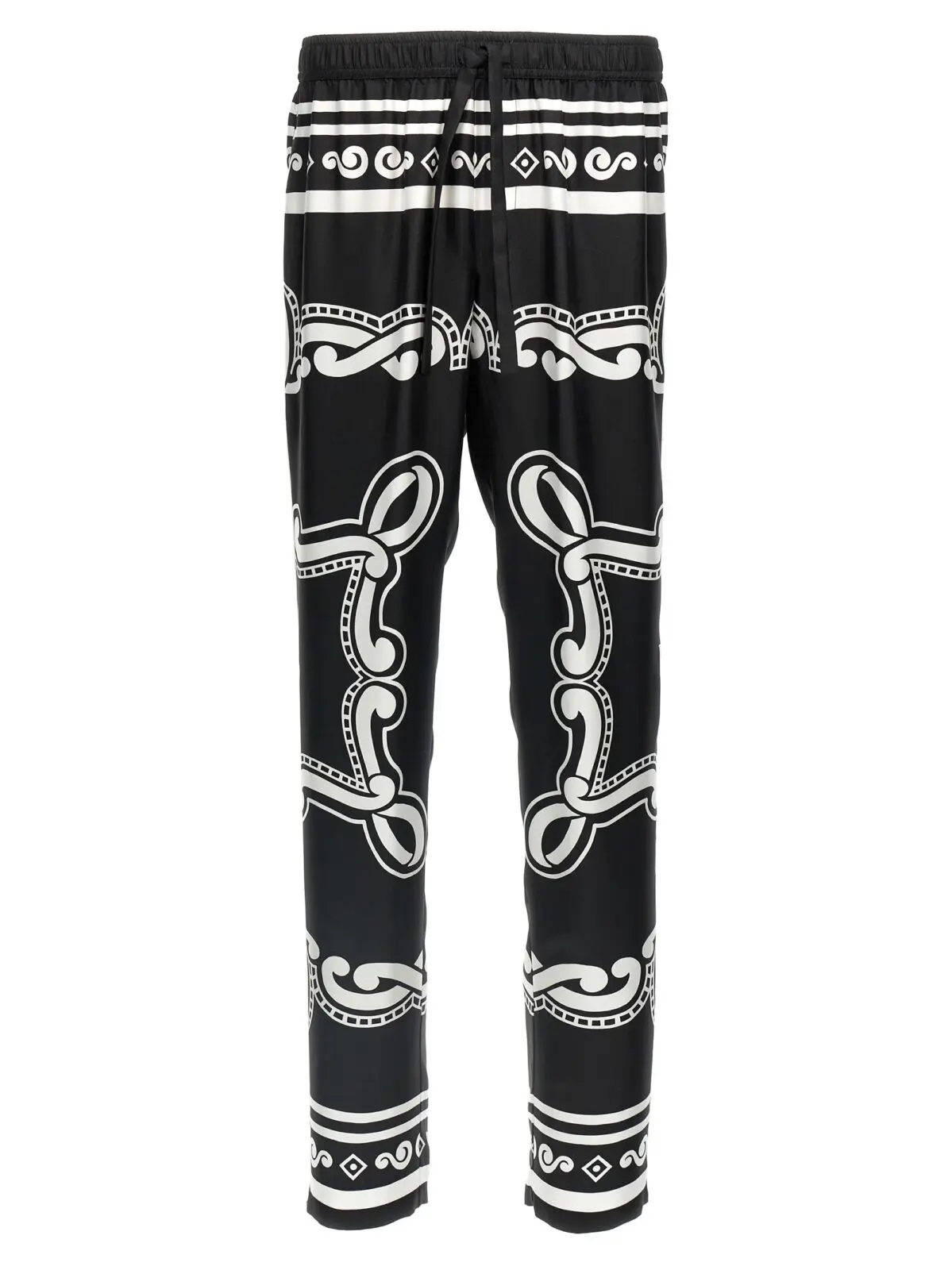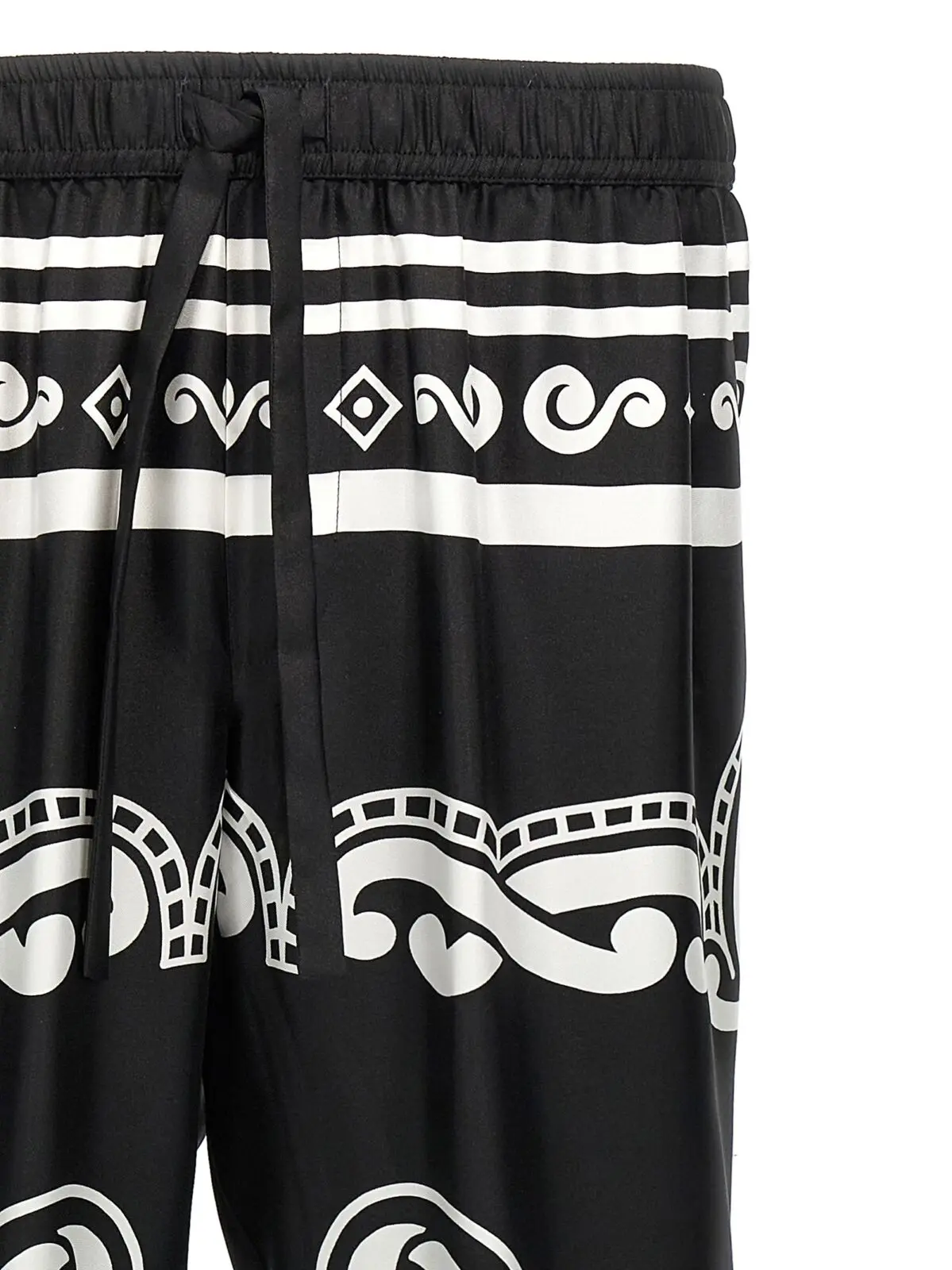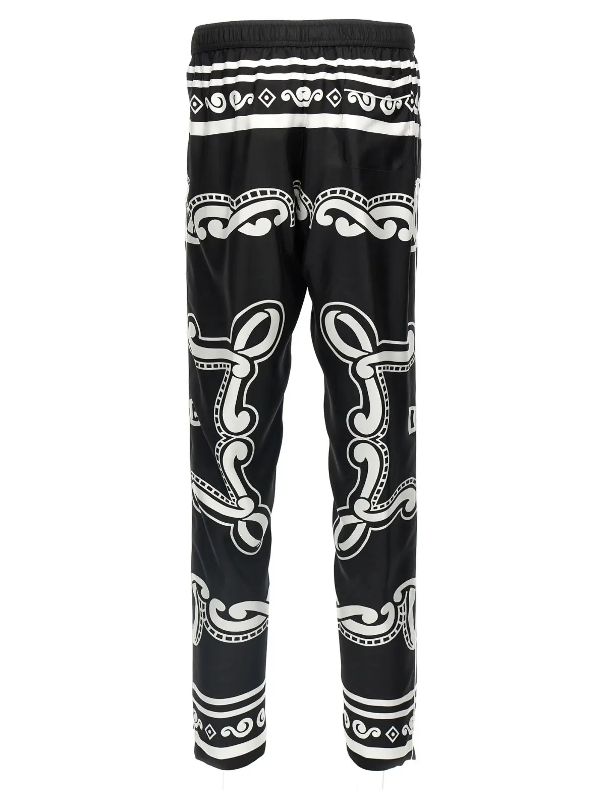 Чоловічі штани Dolce Gabbana з шовку в чорно-білому кольорі вражають витонченістю та елегантністю. Унікальний принт у стилі бандани, обрамлений контрастним кантом, надає стилю яскравого акценту. Регульований еластичний пояс забезпечує комфорт, а практичні кишені додають функціональності. Використання 100% шовку підкреслює високу якість виробу, а ручна робота робить кожну пару неповторною. Цей виріб є втіленням розкішного стилю та сучасної інноваційності, що підкреслює статус свого власника.