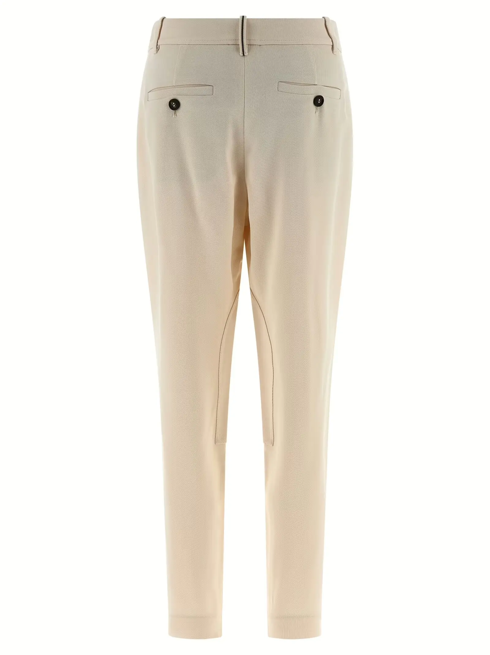 Жіночі штани Equestrian від Brunello Cucinelli виконані з візкозного твіллу з домішком вовни та еластану, поєднуючи комфорт і вишуканість. Вишуканий дизайн із подвійною защипкою на талії, застібкою на ґудзик і блискавку, а також деталлю з металу на задній петлі підкреслюють статус і неперевершений стиль для будь-яких урочистих і повсякденних образів.