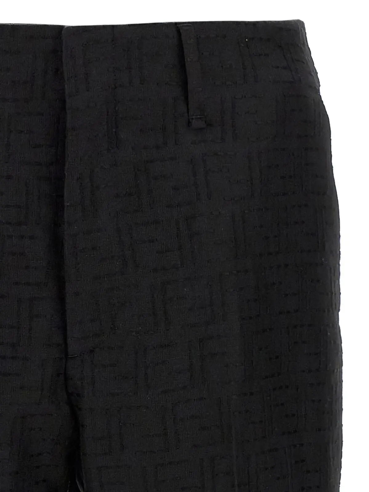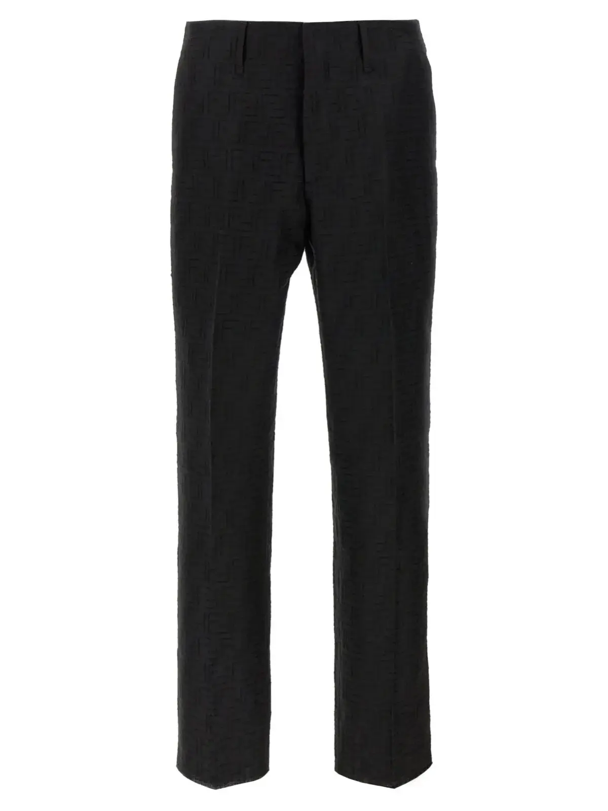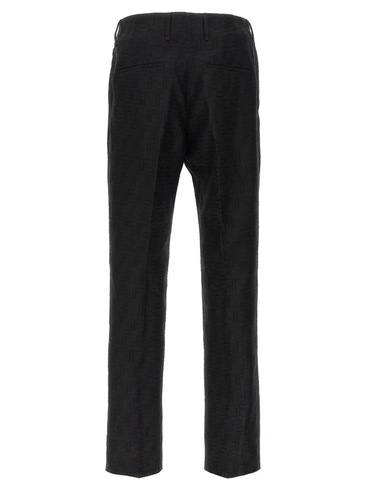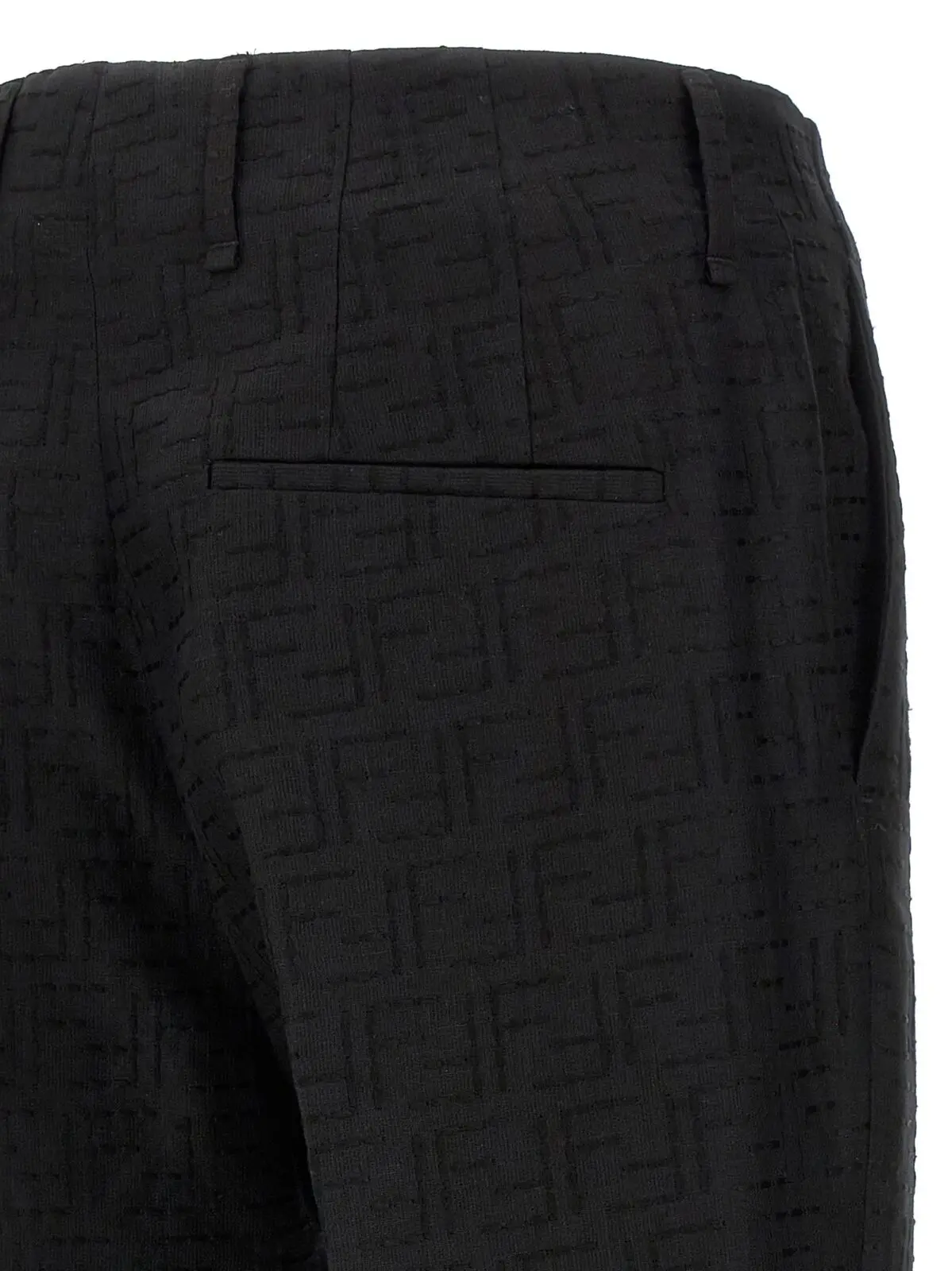Чорні чоловічі штани з жакардовим візерунком FF створені з поєднання льону та бавовни для неперевершеного комфорту та дихаючості. Прямий крій із розтягнутими защипами, застібка на блискавку з гачком і передньою кнопкою, а також функціональні кишені підкреслюють елегантність і практичність, надаючи образу статусність і сучасний стиль.
