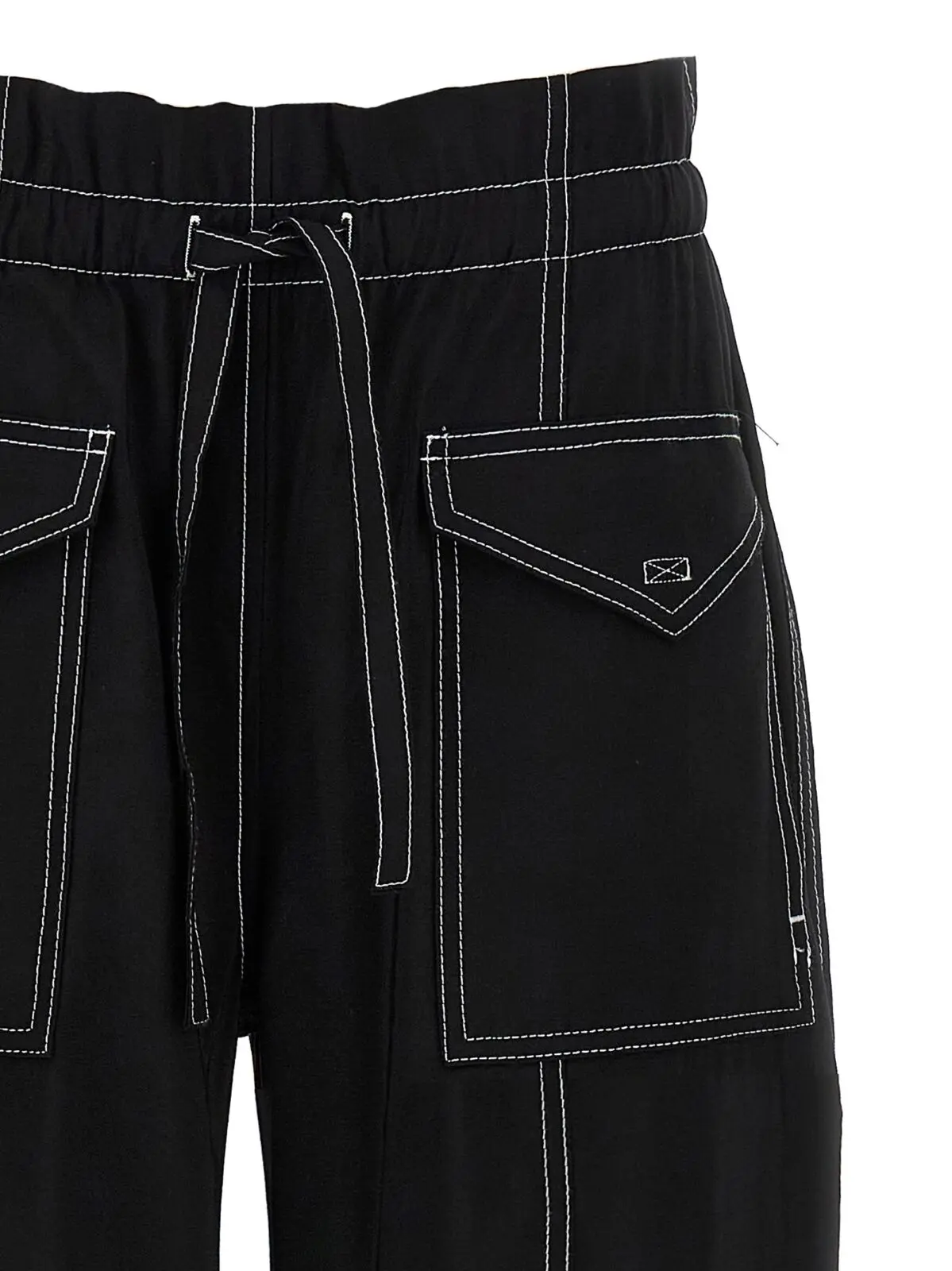 Чорні жіночі штани з високою талією виконані з інноваційної суміші віскози LENZING™ ECOVERO™ та поліестеру, що поєднує екологічність і комфорт. Елегантний прямий крій з контрастною строчкою, регульованим еластичним поясом із зав’язками та практичними кишенями підкреслюють універсальність і вишуканий стиль цього преміального виробу.