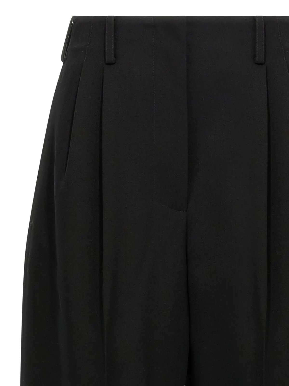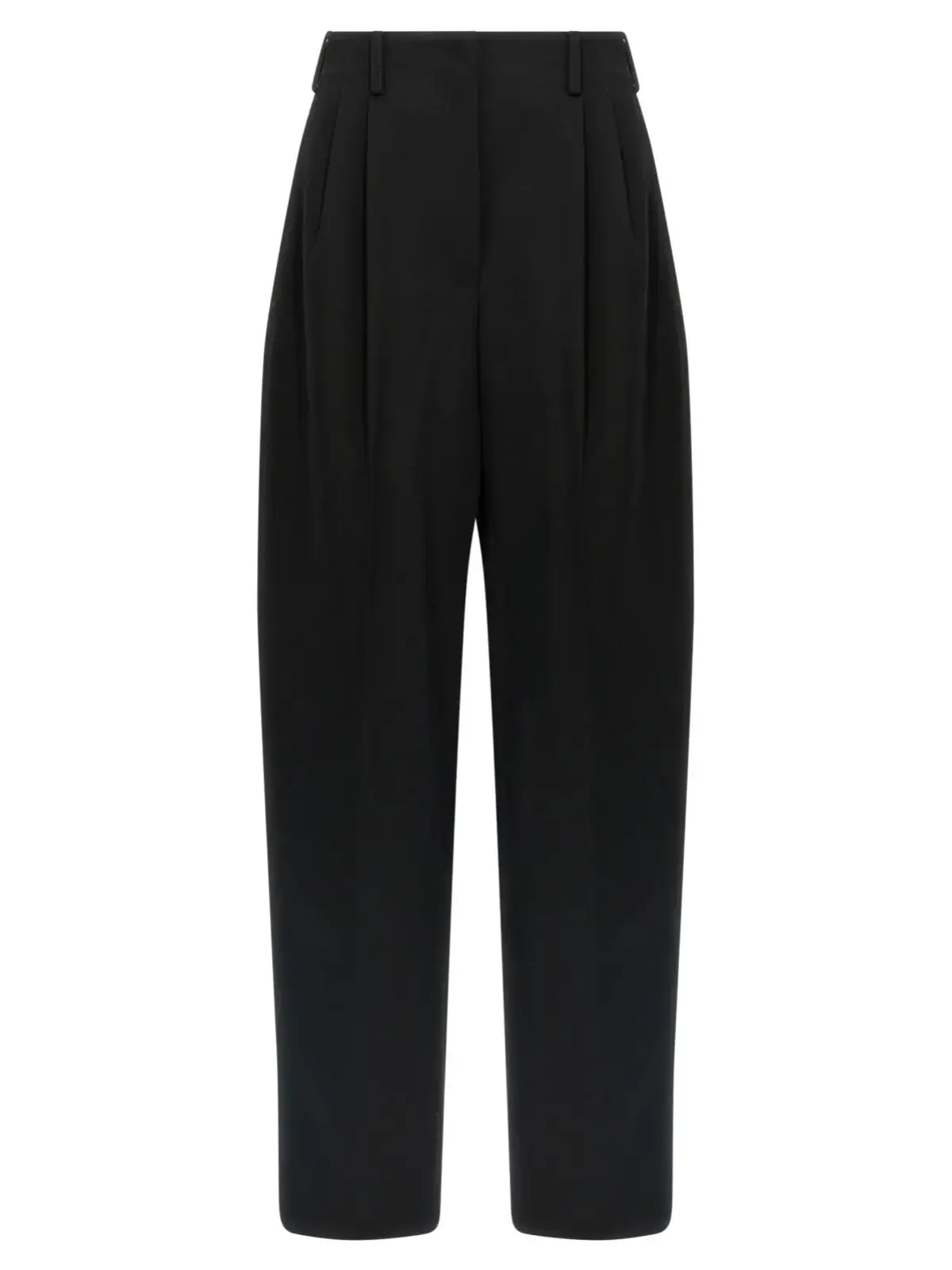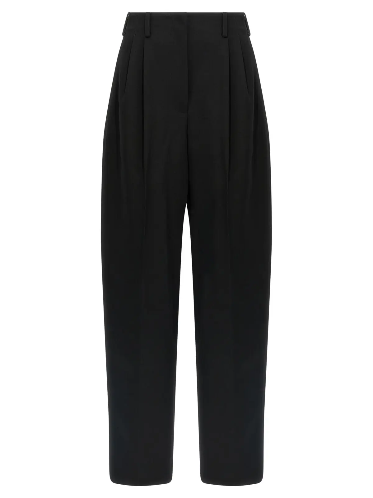 Чорні жіночі штани Givenchy з низькою посадкою виготовлені з високоякісної вовни, що забезпечує комфорт і довговічність. Елегантний дизайн з подвійною передньою складкою, широкими штанинами та витонченими петлями для ременя підкреслює статус і вишуканий стиль, поєднуючи інноваційність та універсальність.