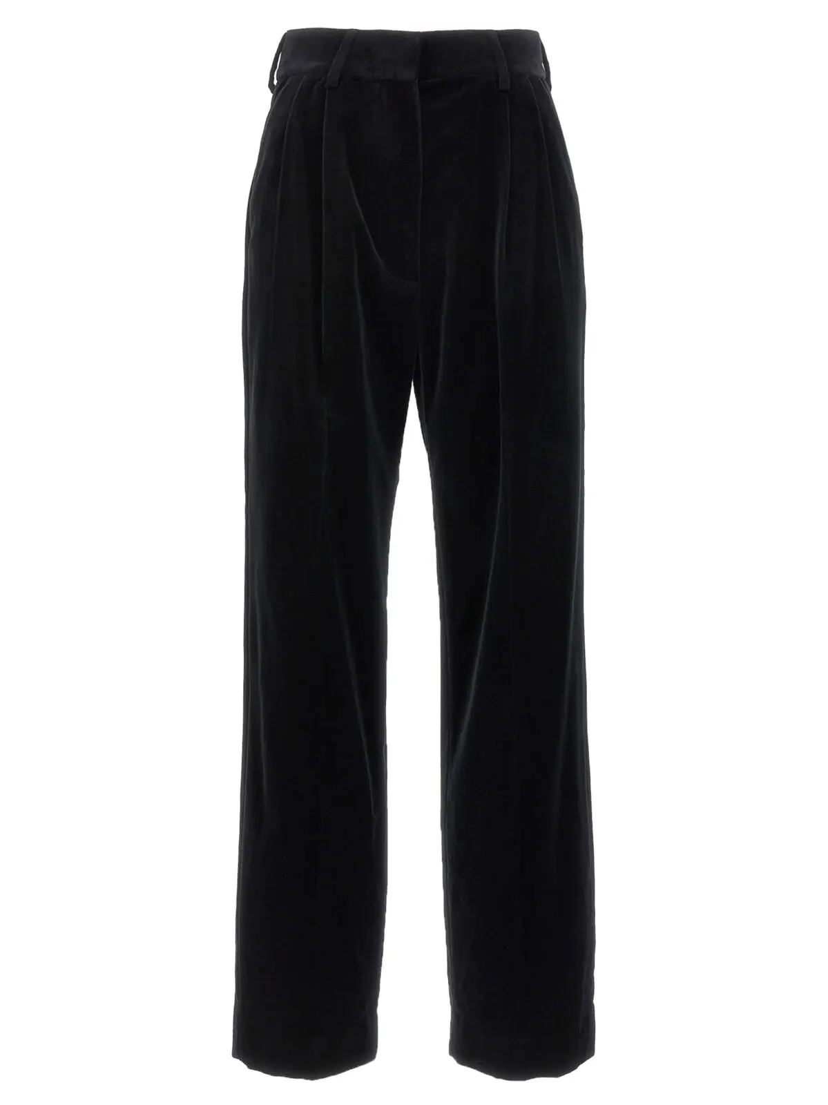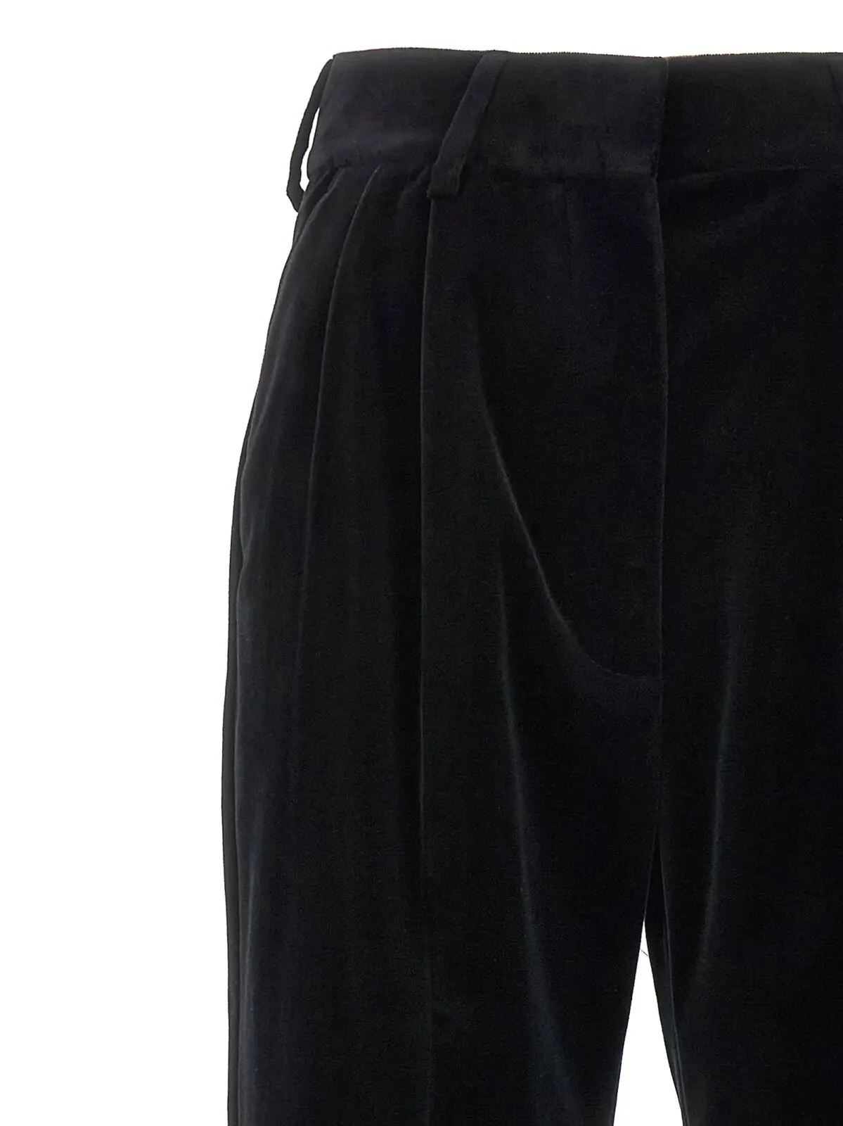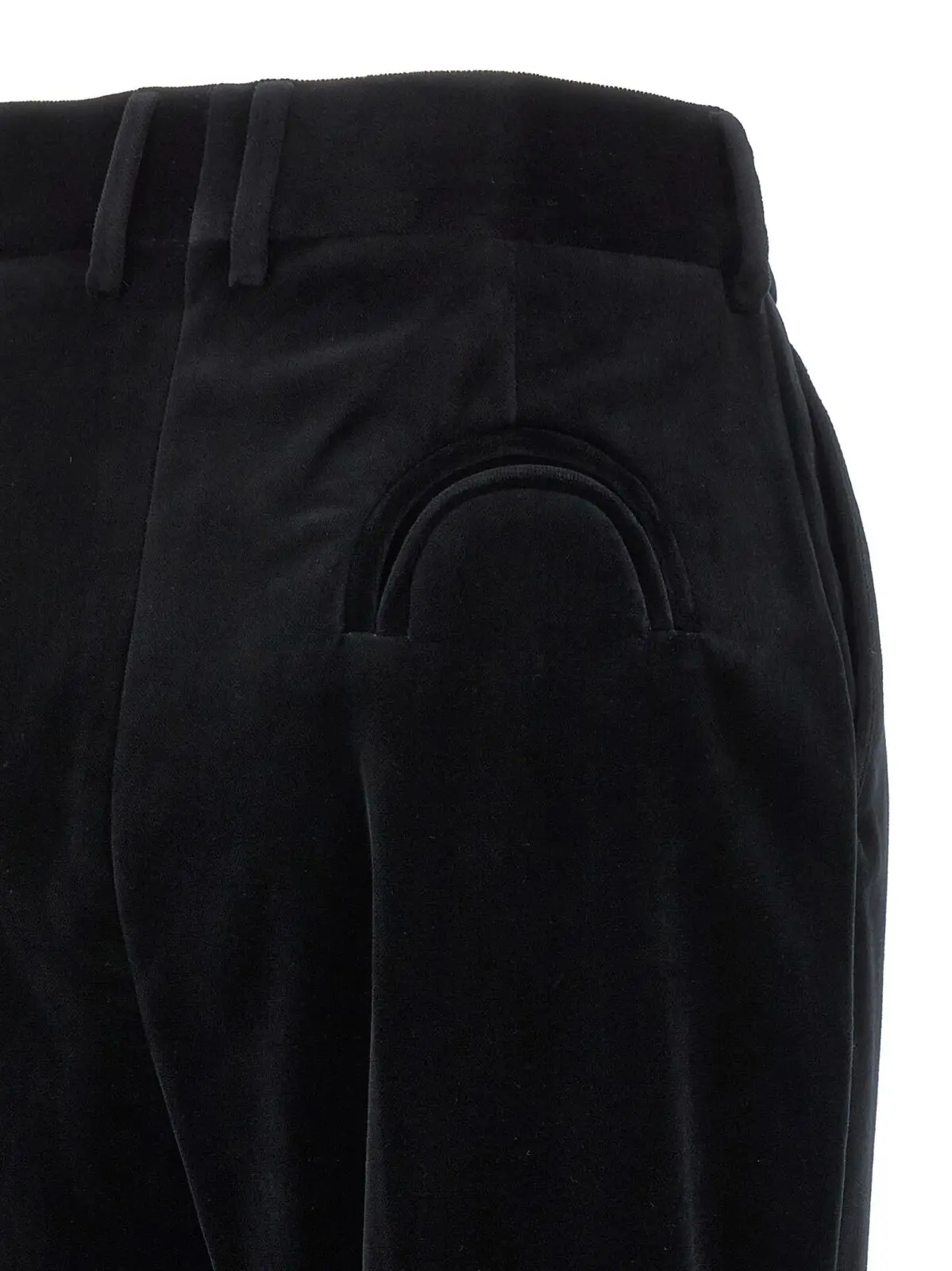 Чорні жіночі штани Jealousy Blazé Milano виготовлені з високоякісної 100% бавовни з гладкого оксамиту, що забезпечує комфорт і елегантність. Висока посадка, прямий крій із виточками та витягнутими складками підкреслюють стрункість силуету, а функціональні кишені та застібка на блискавці з гачком і передньою кнопкою додають практичності. Цей виріб поєднує інноваційний дизайн і універсальність, створюючи неперевершений стиль і статус для впевнених у собі жінок.