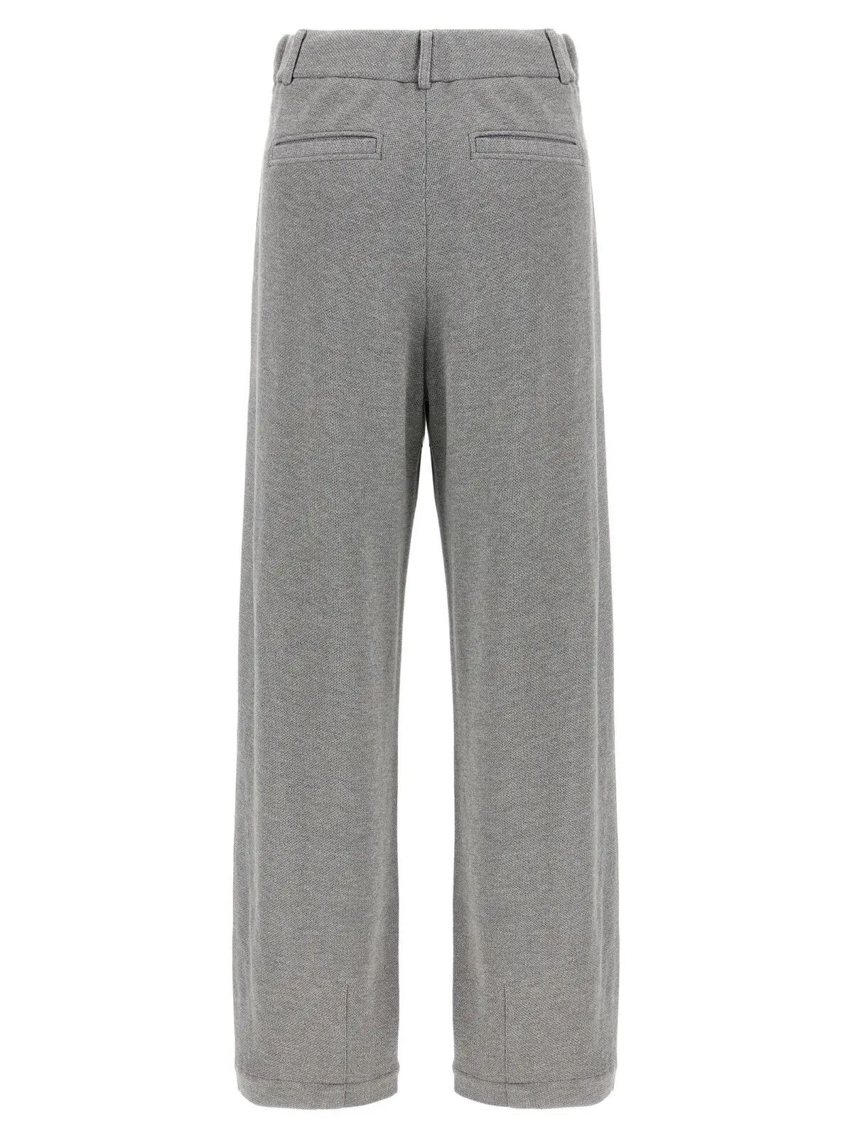 Вишукані жіночі штани Lamé Brunello Cucinelli виготовлені з інноваційної суміші бавовни, віскози та поліестеру з ламе-плетінням, що надає виробу благородного сріблястого відтінку. Модель із високою талією, плісе, широкими прямими штанинами і функціональними кишенями поєднує комфорт, стиль і бездоганну якість, підкреслюючи статус і елегантність власниці.