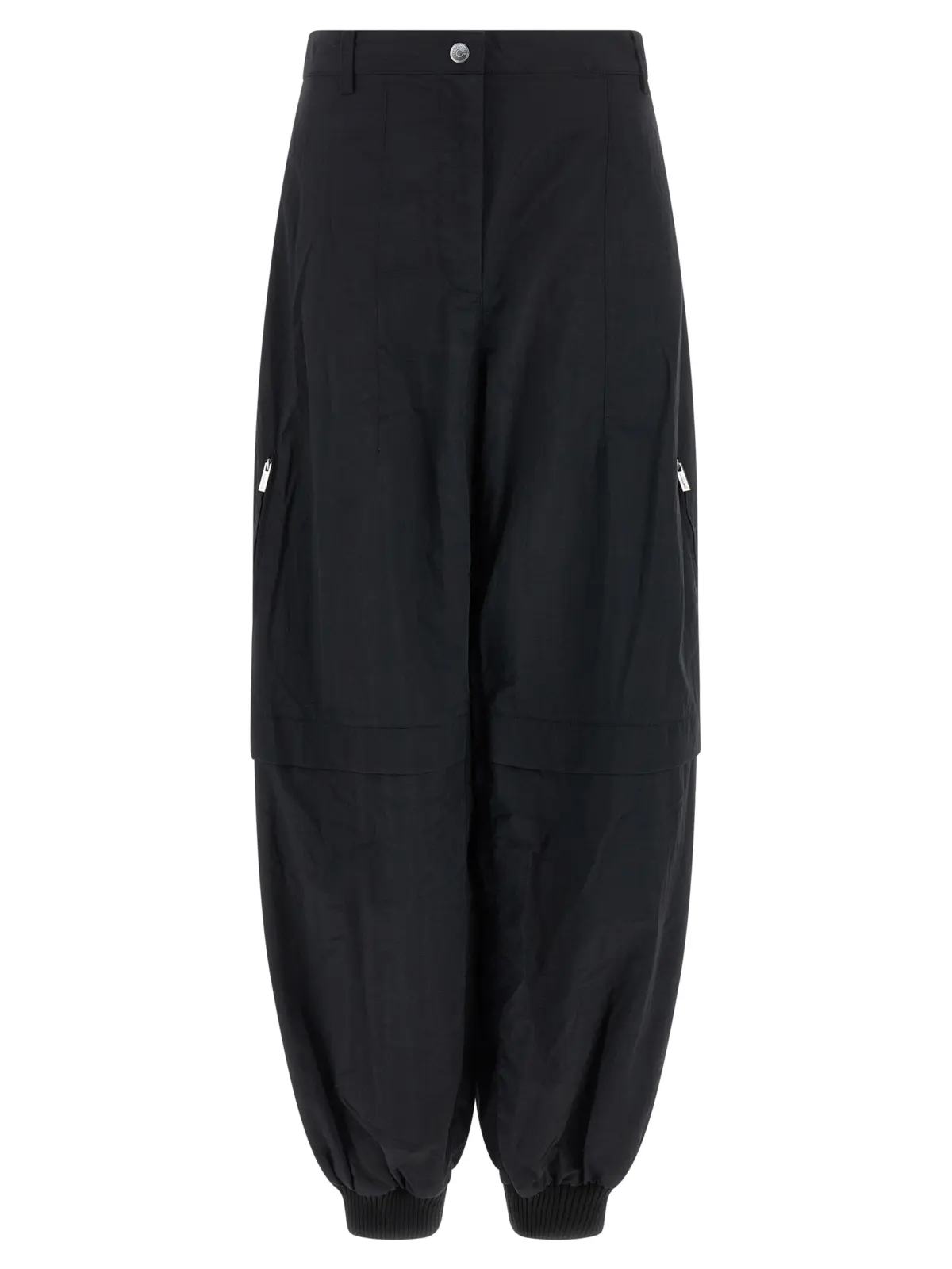 Чорні штани Le Cargo Ovalo виготовлені з високоякісного нейлону з додаванням поліуретану для ідеальної посадки та комфорту. Широкий крій у поєднанні з еластичними трикотажними манжетами створює унікальний силует, що підкреслює стиль і статус. Функціональні бічні кишені та надійна застібка на блискавку і ґудзик забезпечують зручність і практичність, роблячи цей виріб універсальним вибором для сучасної модниці, що цінує інновації та елегантність.