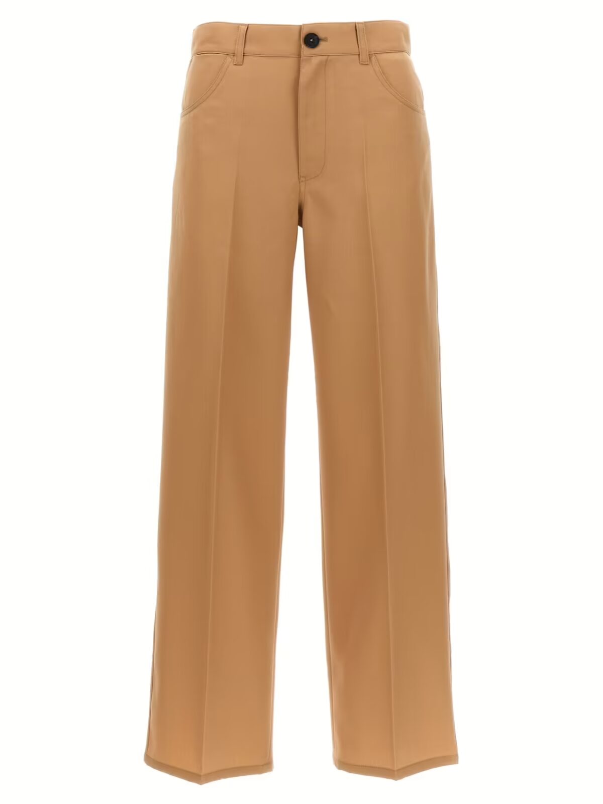 Штани Jil Sander з вільними штанинами з вовняного габардину, бежевого кольору, призначені для жінок. Вони мають застібку на гудзик та блискавку, а також п’ять кишень. Виготовлені з 100% вірджинської вовни.