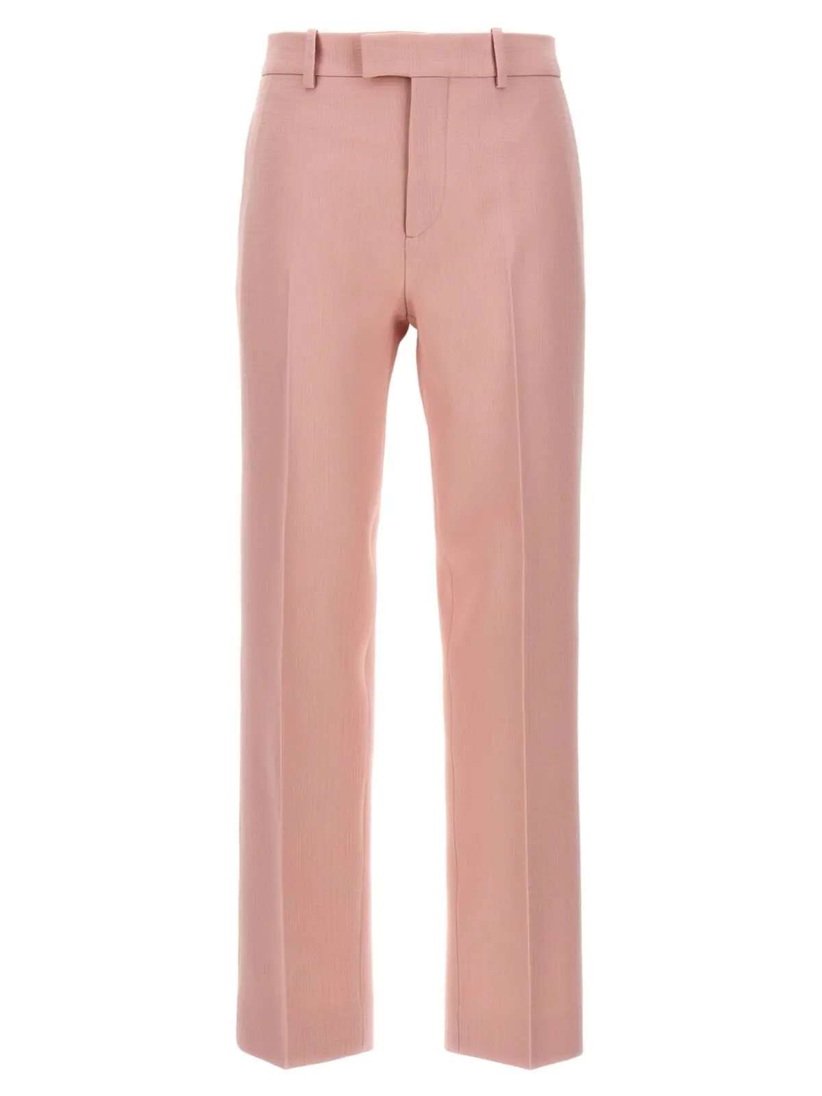Жіночі штани на замовлення від Burberry. Рожевого кольору, виготовлені з 100% вершкової вовни з мікротекстурою. Мають застібку на ґудзик, гачок та блискавку, а також бічні кишені.