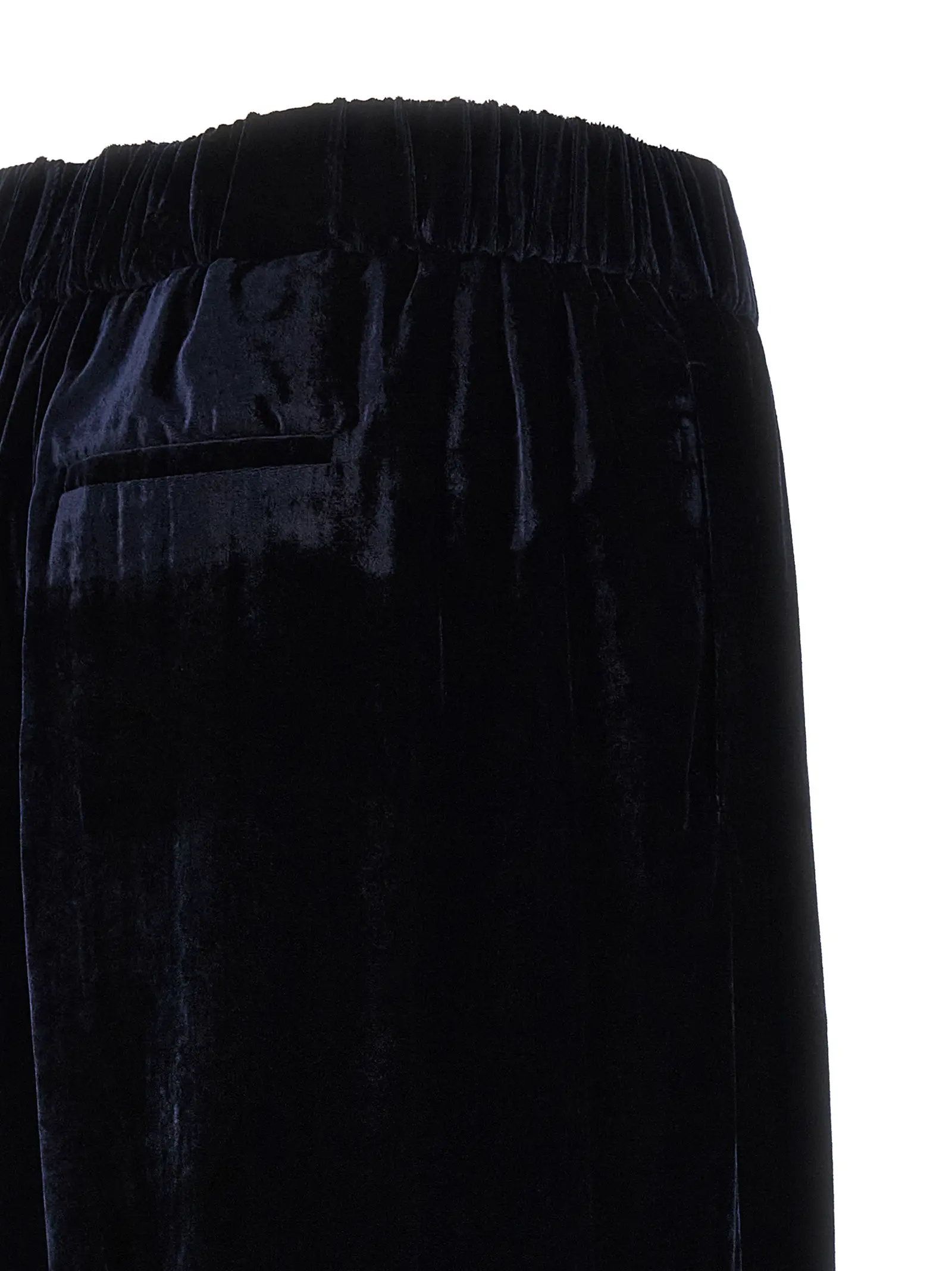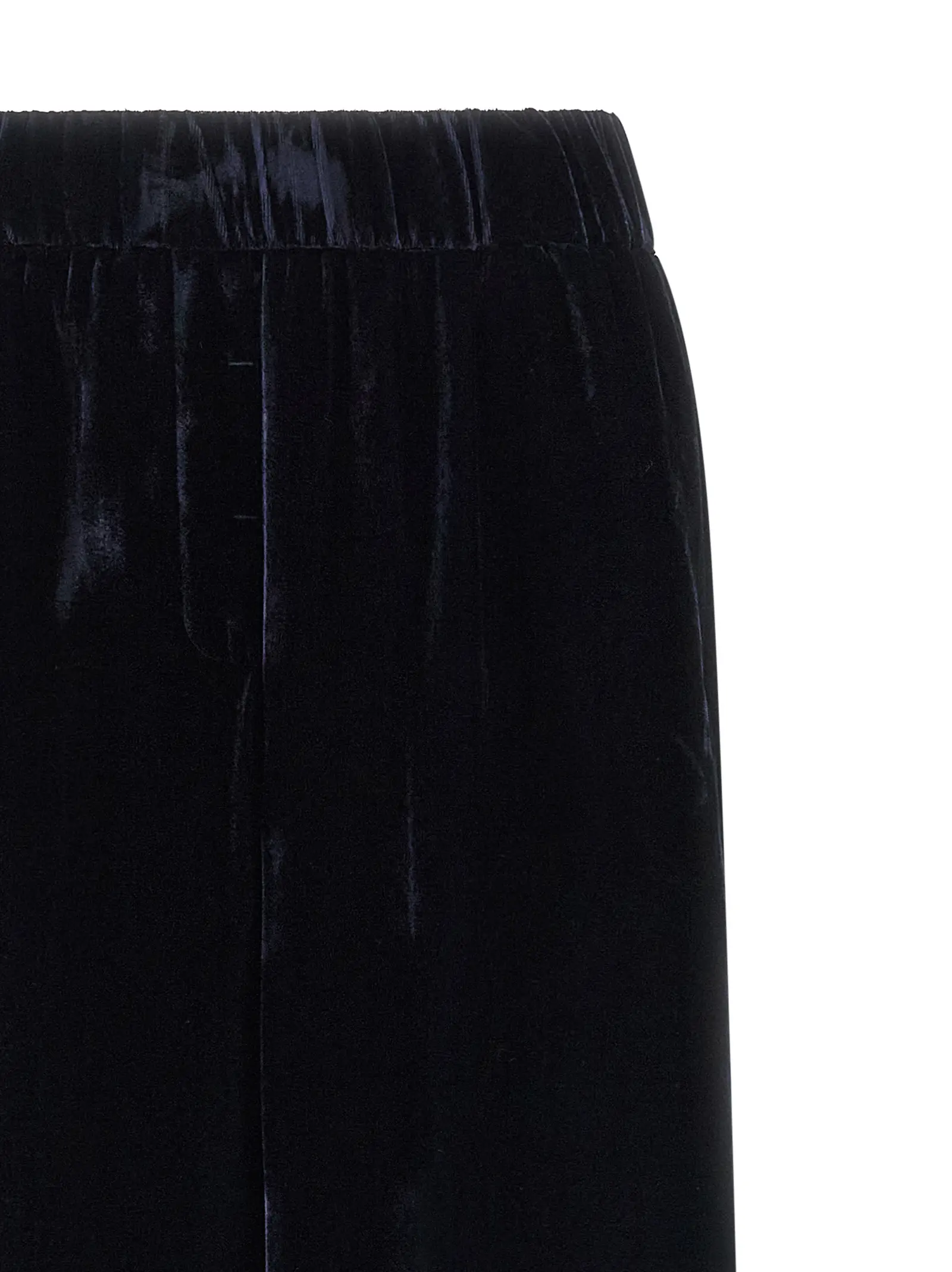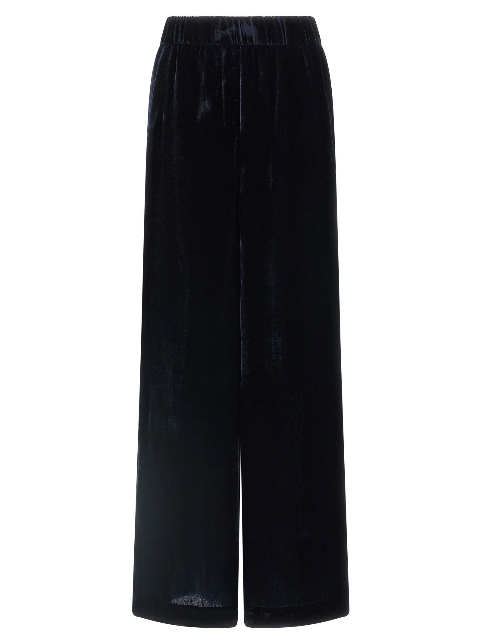 Вишукані жіночі штани з оксамиту насиченого синього кольору, виконані з інноваційної суміші віскози та поліаміду, що забезпечує комфорт і довговічність. Широкий прямий крій, еластичний пояс і практичні кишені поєднують стиль і функціональність, підкреслюючи статус і витонченість образу.