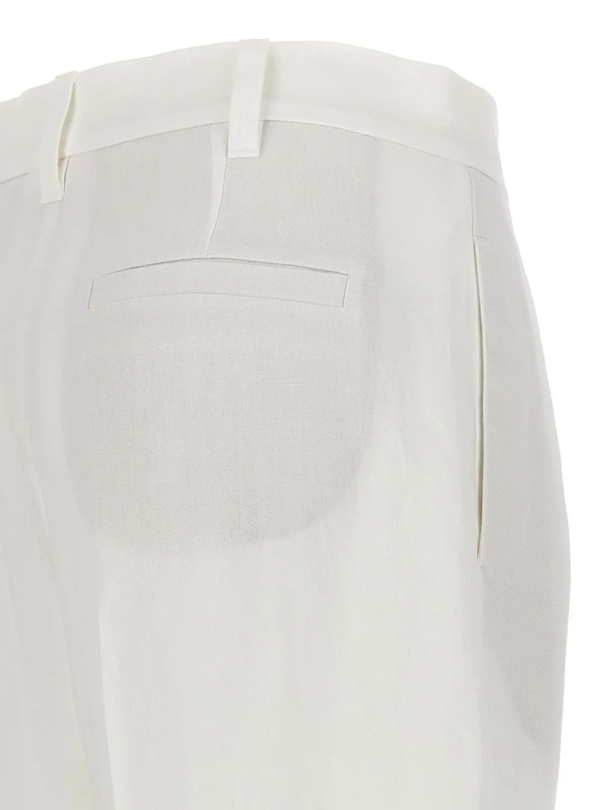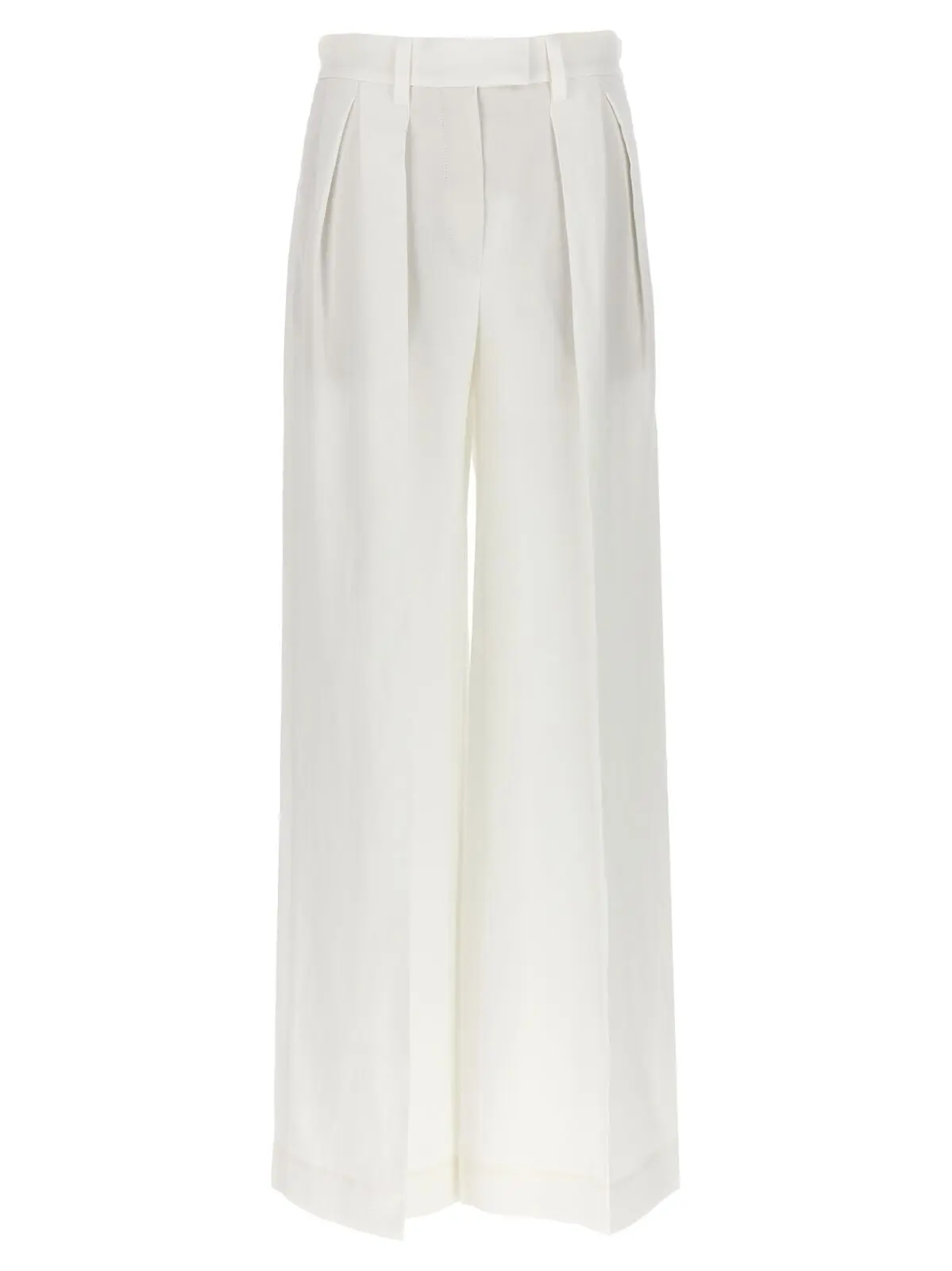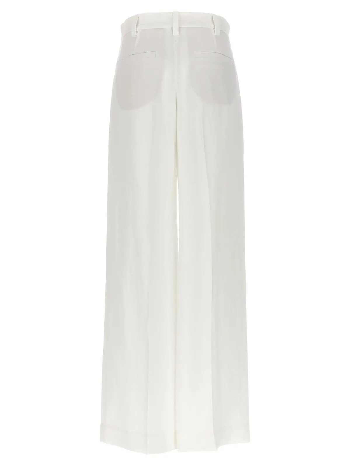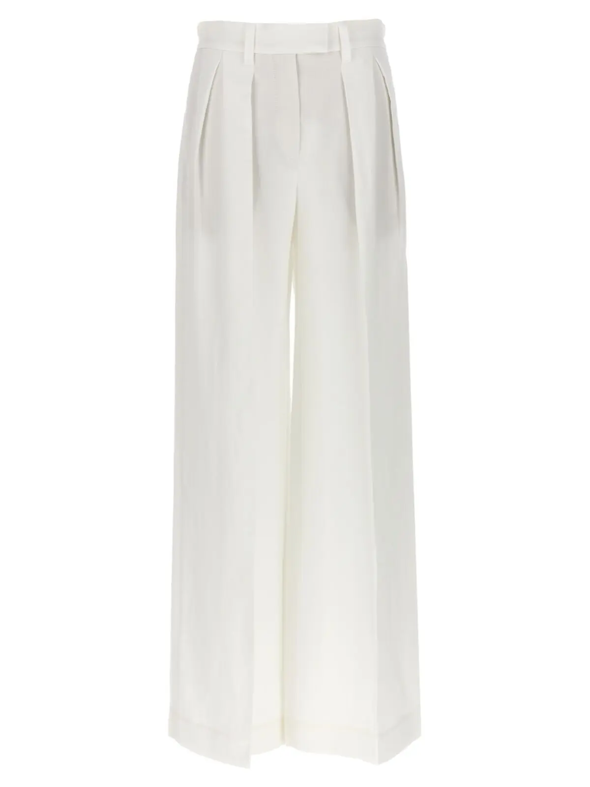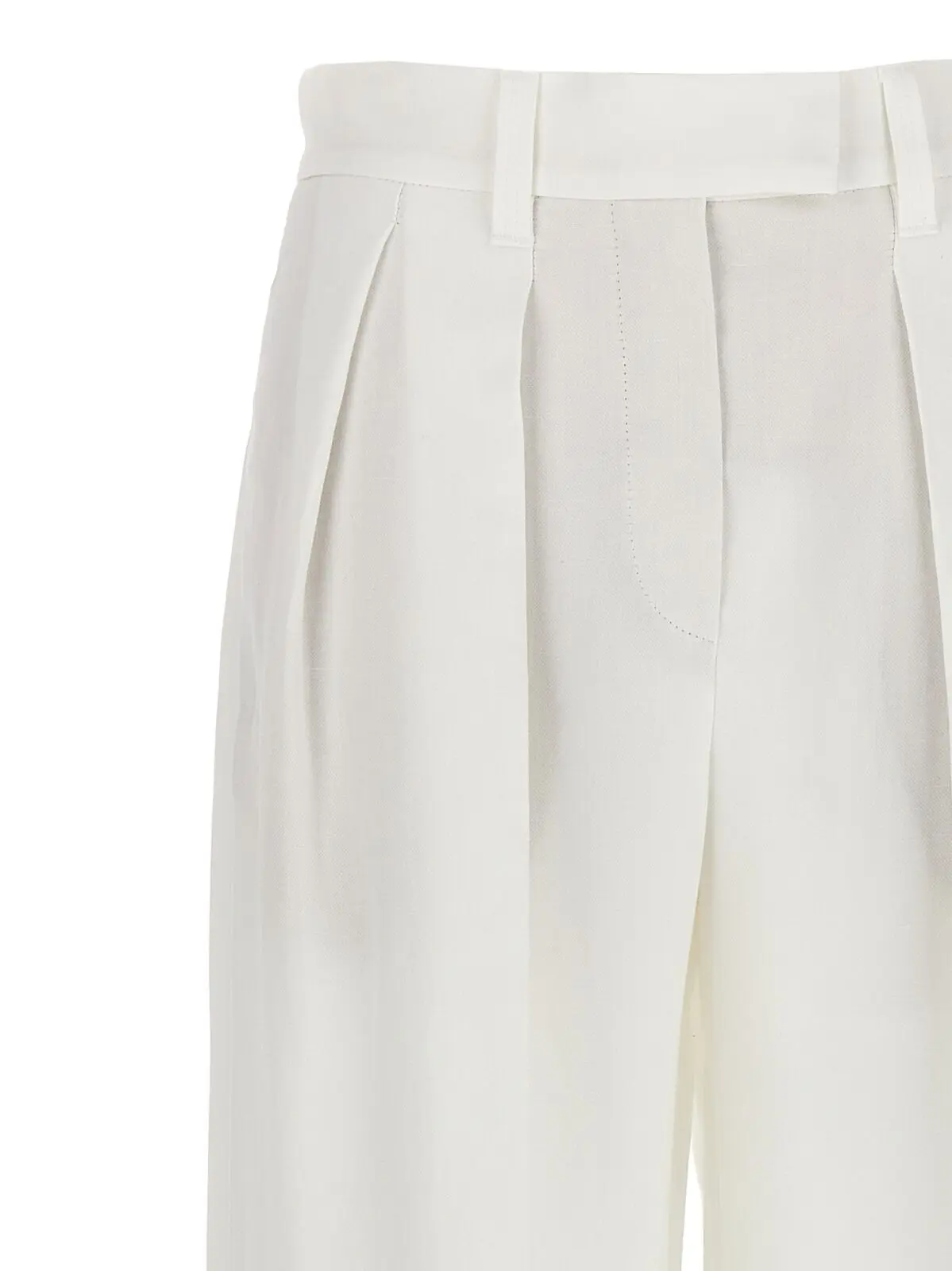 Елегантні білі штани палаццо від Brunello Cucinelli, виготовлені з легкої суміші віскози (73%) та льону (27%). Модель виконана з підтяжками та має чіткі складки на нозі, що додає вишуканості кожному вашому кроці.