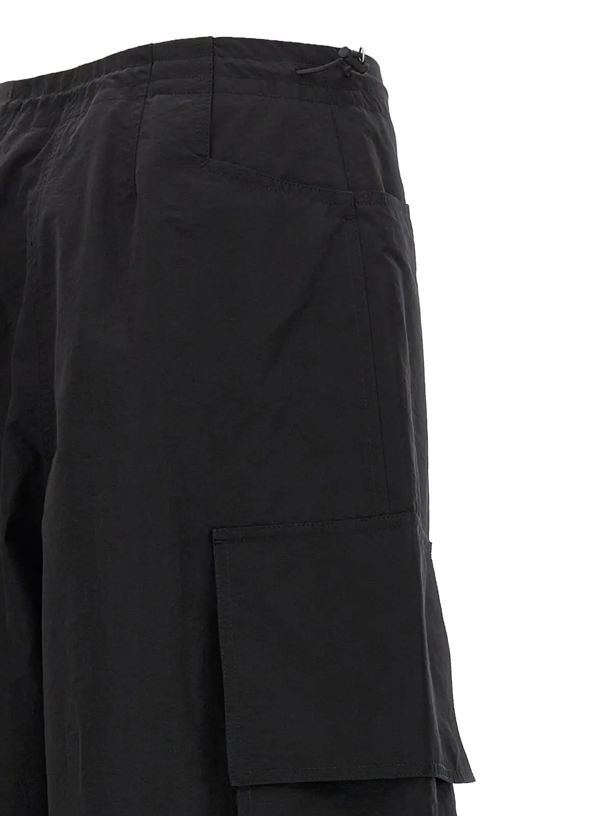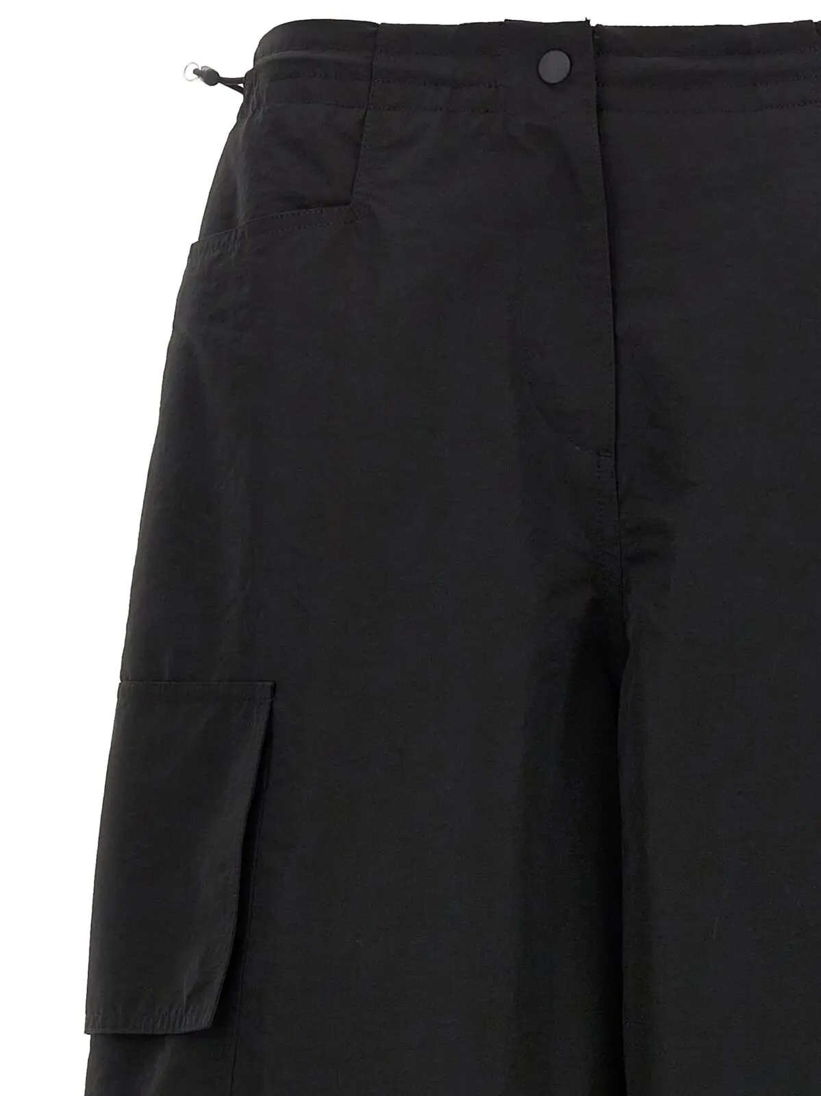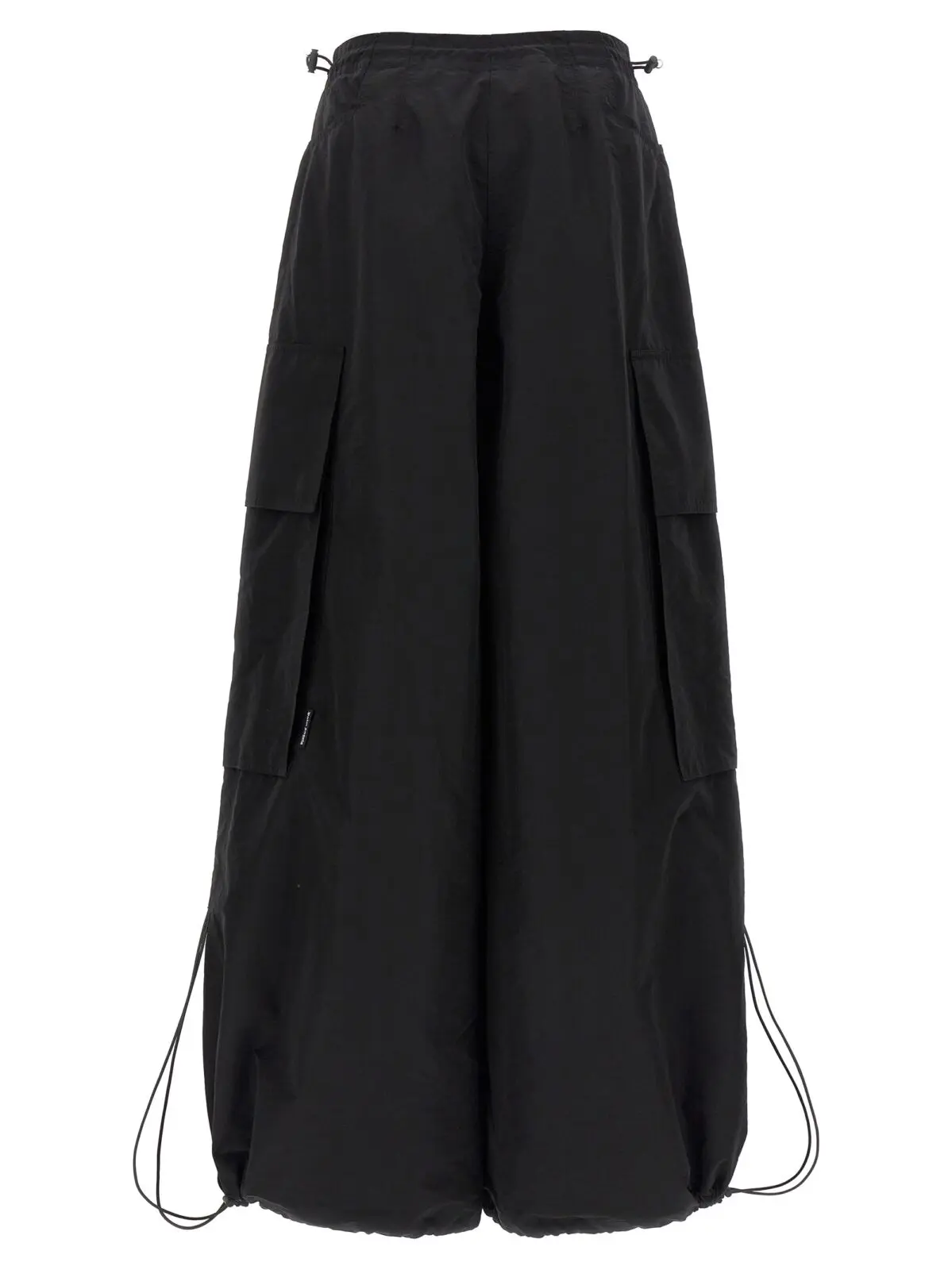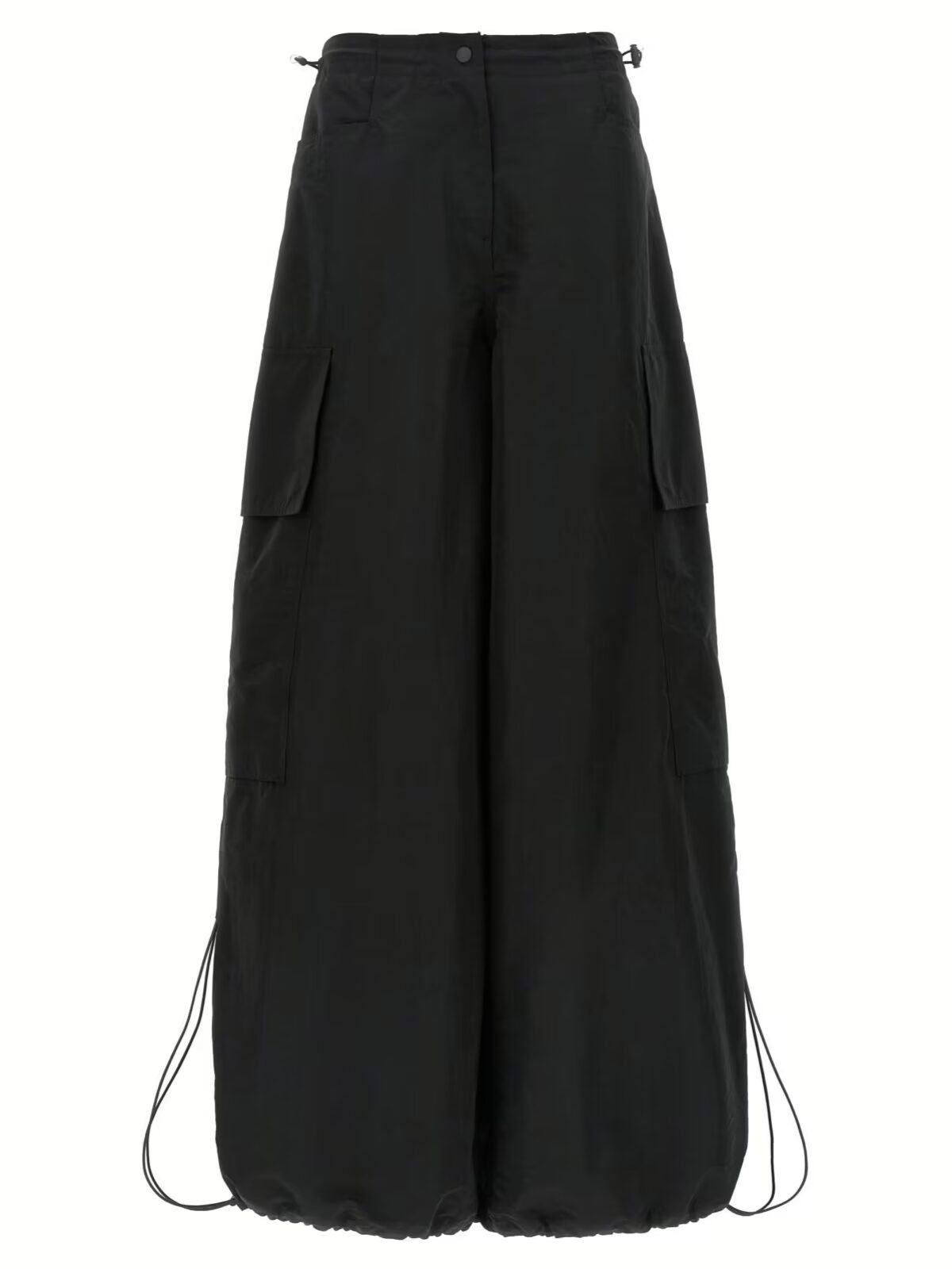 Жіночі чорні штани-парашути від Palm Angels, виготовлені з нейлону, оснащені замком-блискавкою та кнопкою, регульованим еластичним шнурком на талії, кишенями та регульованими еластичними манжетами на шнурку. Склад: 59% поліамід, 41% поліестер.