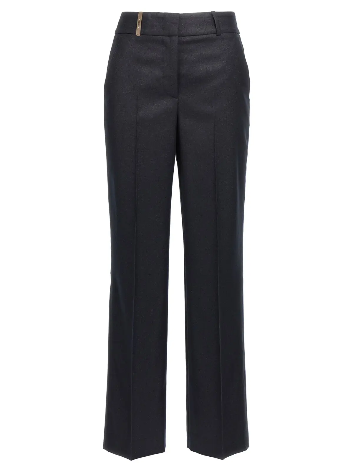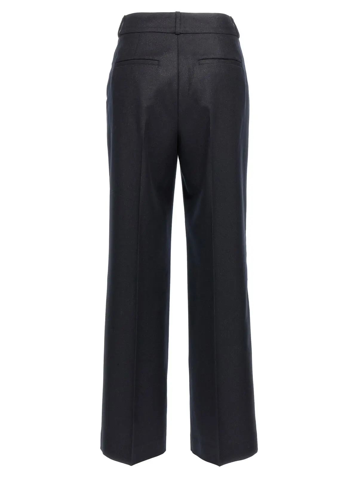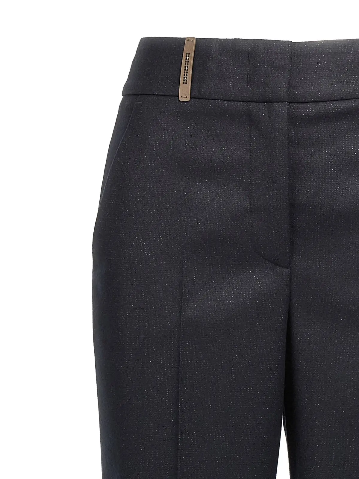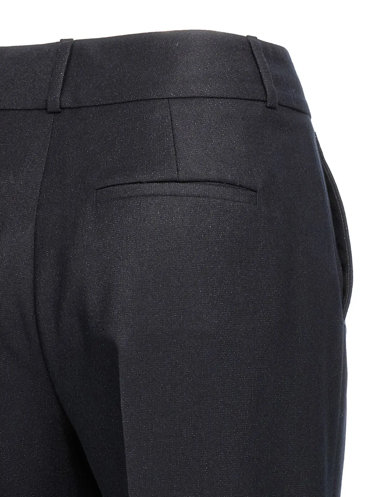 Вишукані жіночі штани з фланелі з вовни virgin wool синього відтінку з додаванням люрексових ниток, що надають м’який блиск. Прямий крій, витончені стрілки та продумана застібка забезпечують ідеальну посадку і комфорт. Цей ексклюзивний виріб поєднує інноваційність і універсальність, підкреслюючи статус і бездоганний стиль.