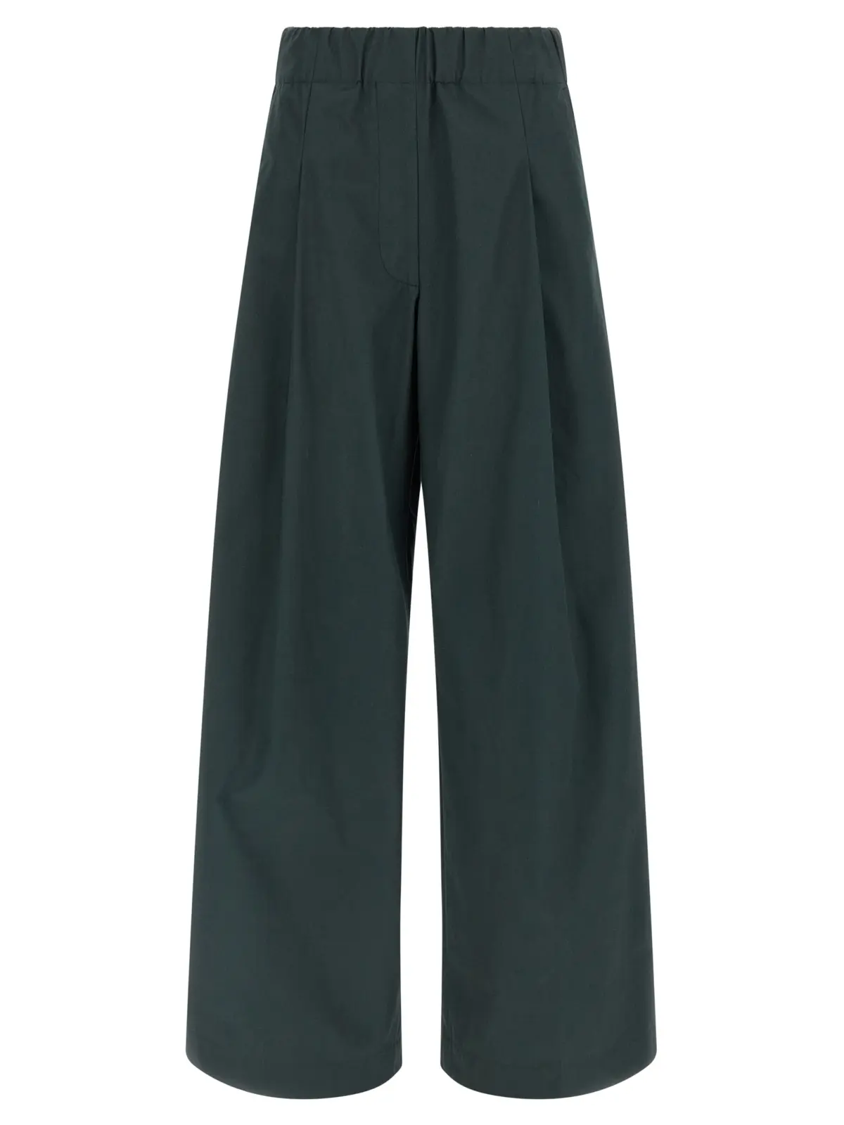 Зелені жіночі штани виготовлені з високоякісної 100% бавовни, що забезпечує комфорт і довговічність. Високий посад, широкі прямі штанини та еластичний пояс поєднують стиль і функціональність, а декоративні шпильки і клапан у техніці trompe l’oeil додають інноваційного шарму, підкреслюючи статус і вишуканий смак.