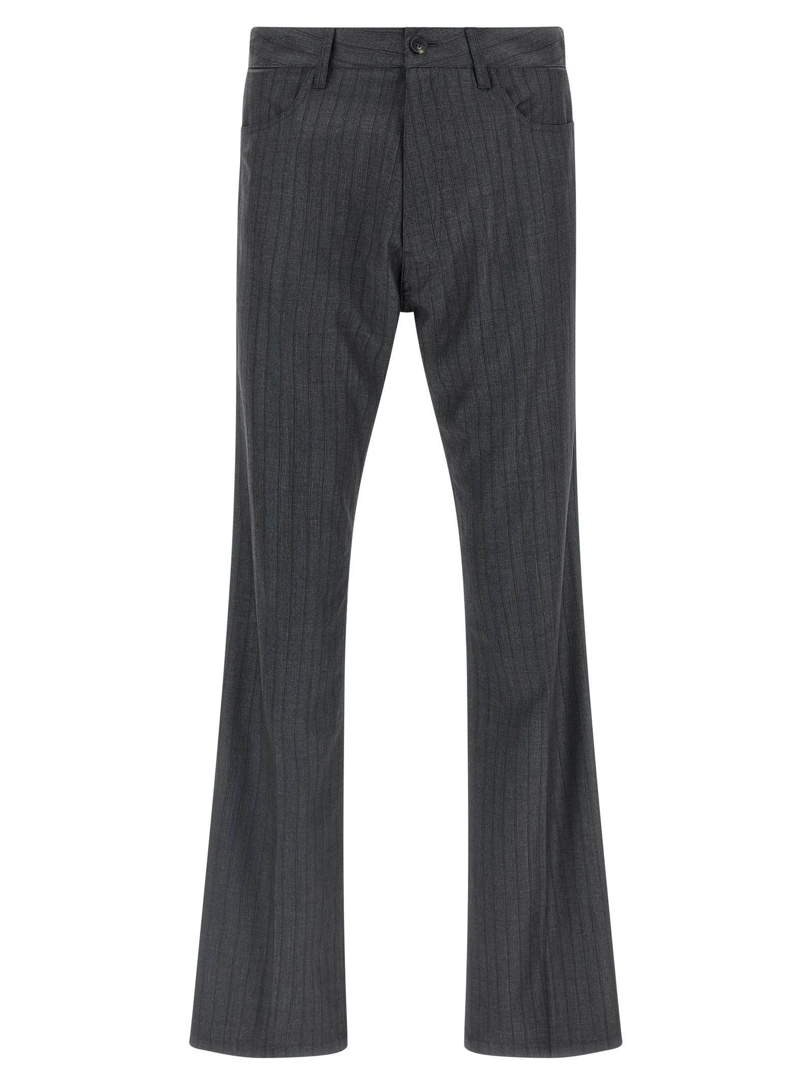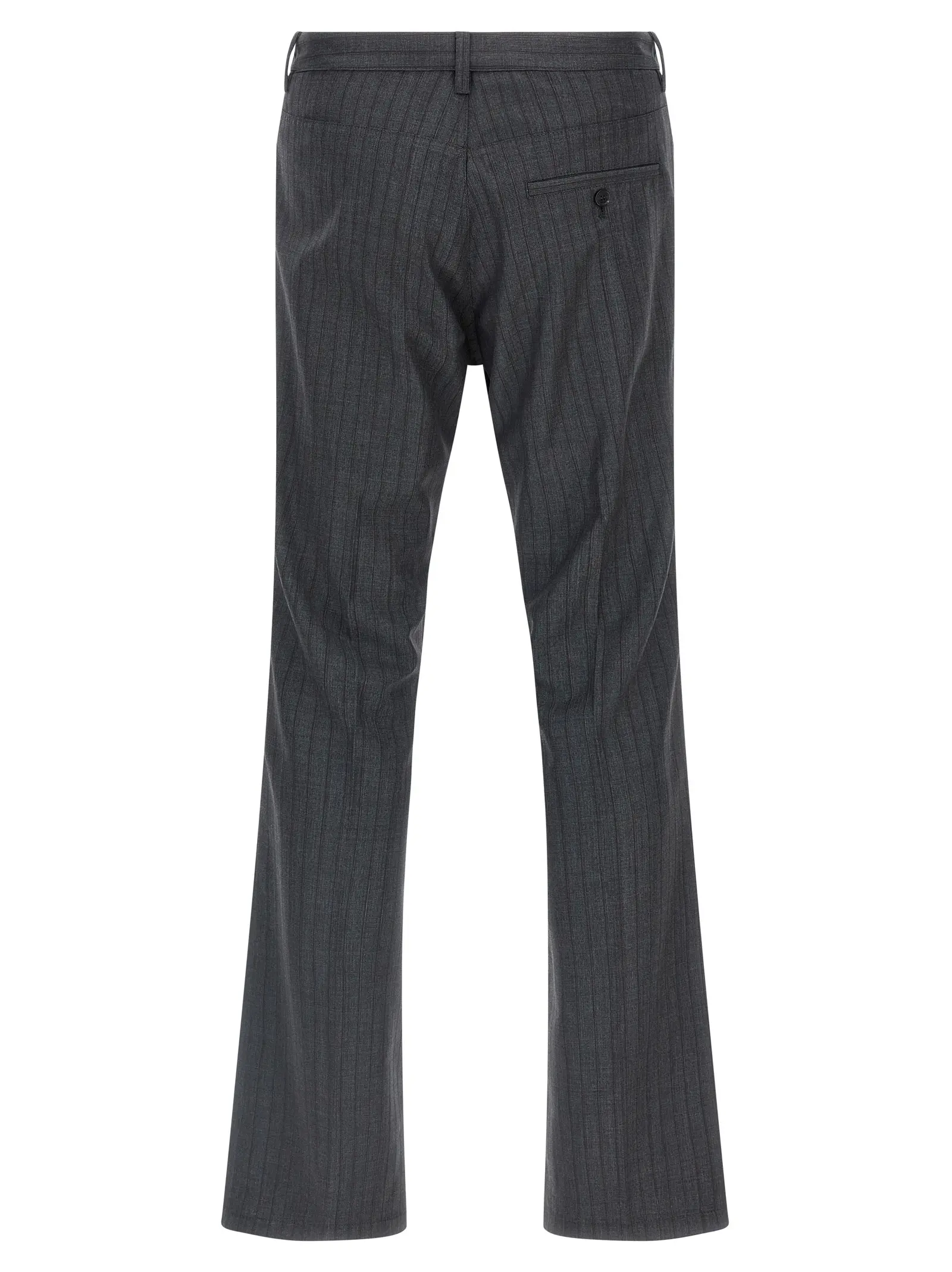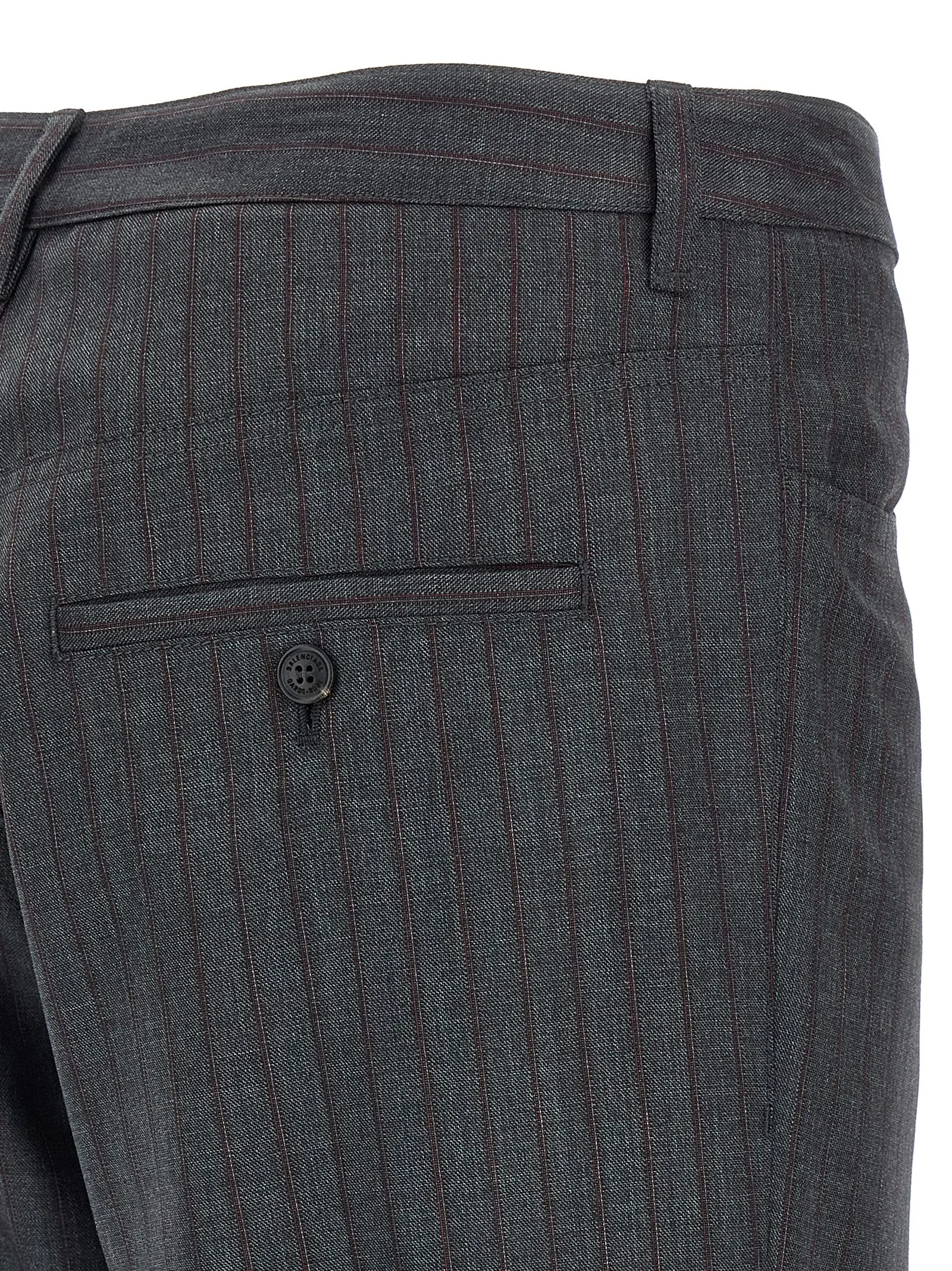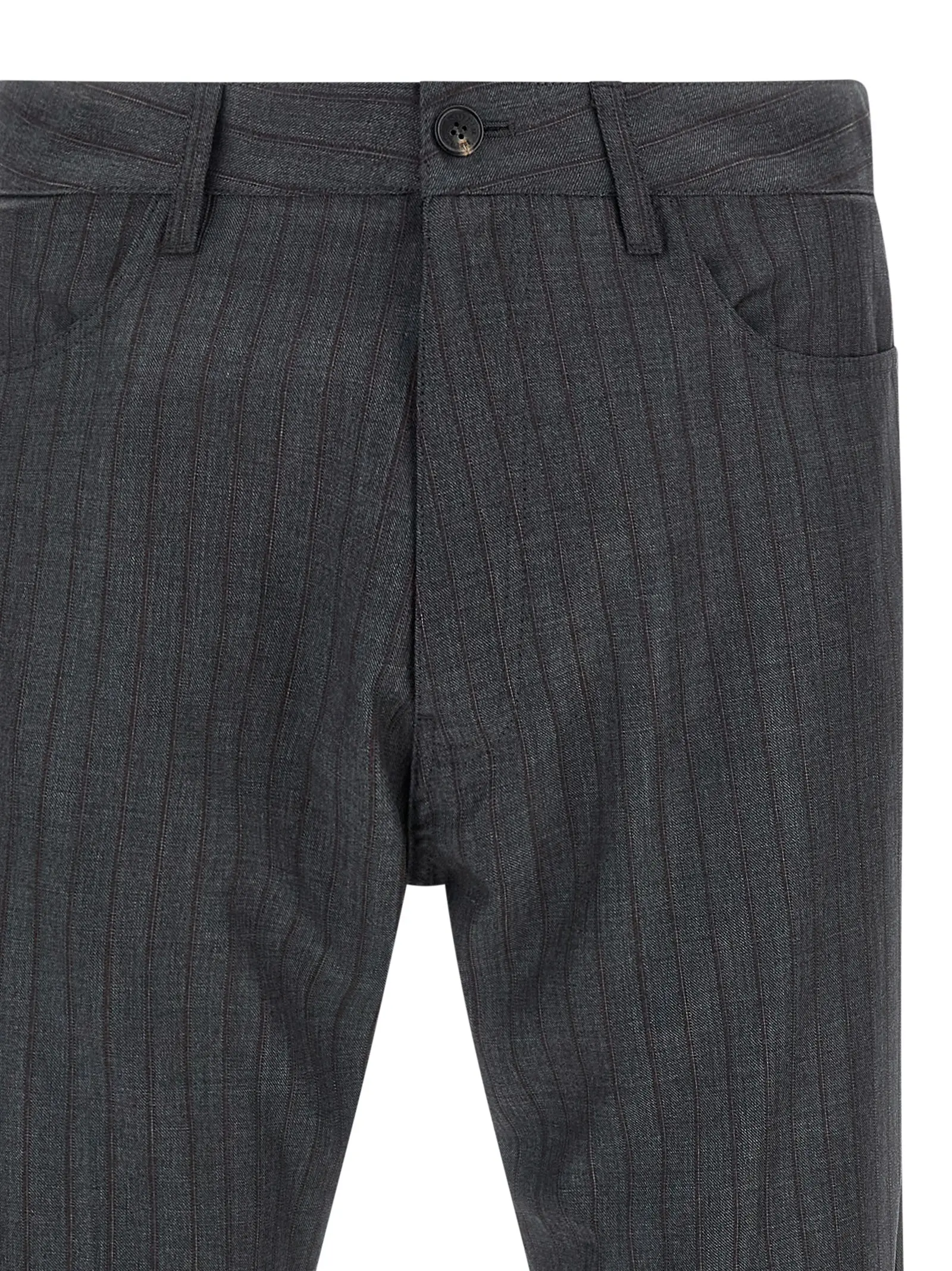 Штани виготовлені з 100% вовни першого сорту. Модель має прямі штанини. Присутній розтягнутий складчастий елемент. Застібаються на блискавку та фронтальну кнопку. Оснащені кишенями. Має візерунок у вигляді тонких смужок.