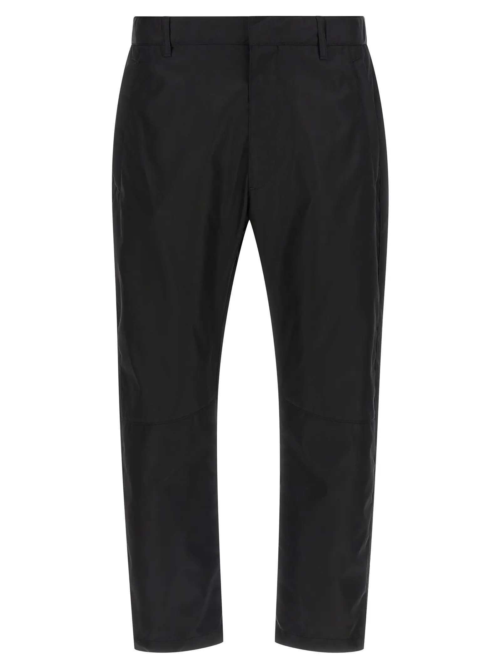 Виготовлений із регенерованого нейлону матеріал дарує друге життя пластику, вилученому з океанічних глибин та рибальських сіток. Прямий крій гармонійно доповнюється еластичним поясом ззаду та застібкою на блискавку з гачком. Лаконічний дизайн завершує емальований металевий трикутник, розташований на задній частині. Стяжки внизу штанин дозволяють легко змінювати об’єм, створюючи особливий настрій. Практичні кишені додають функціональності цій технологічній моделі з переробленого поліаміду.