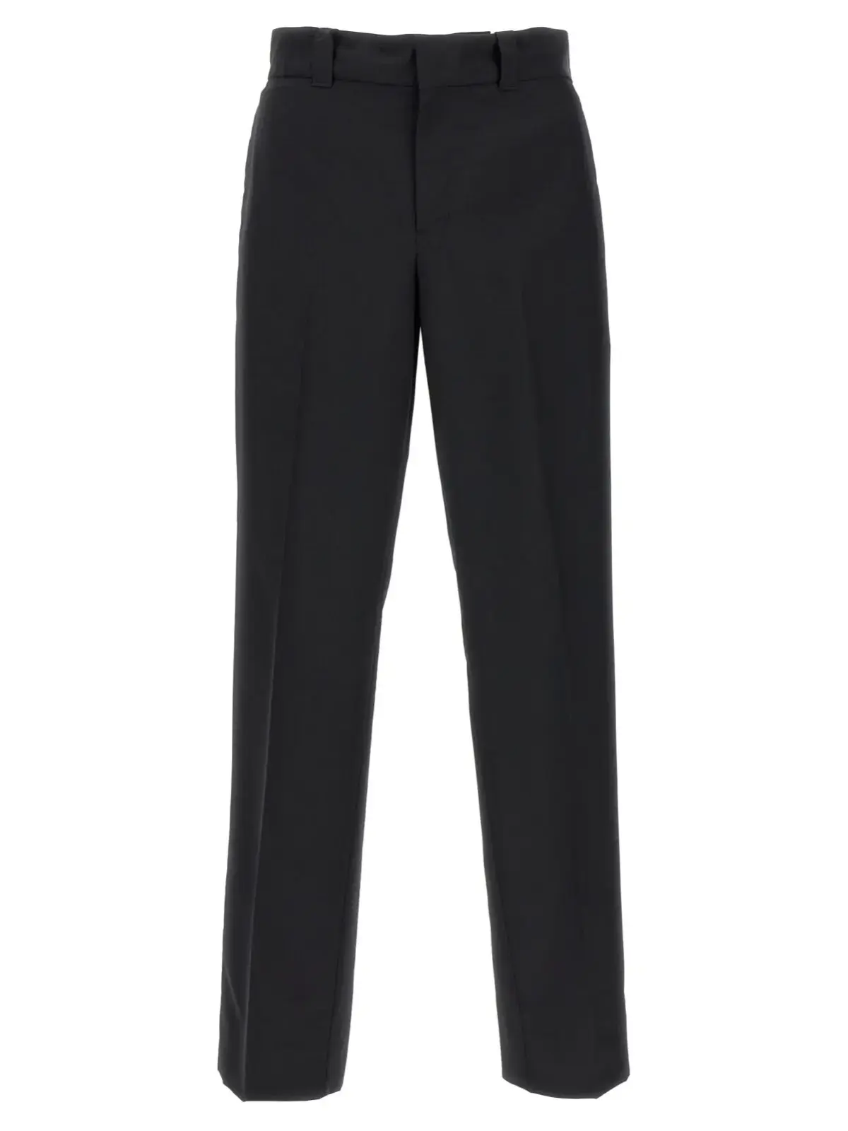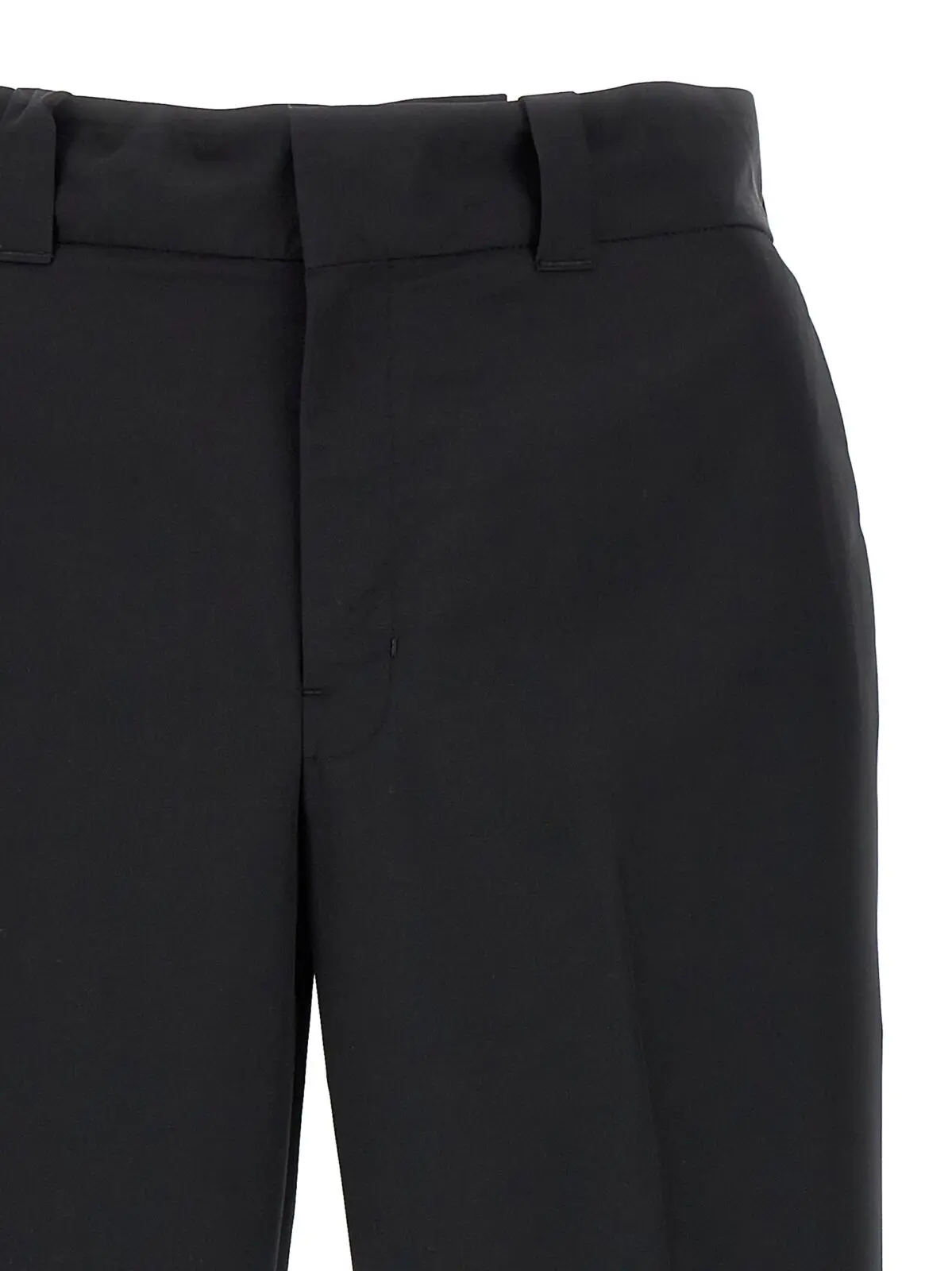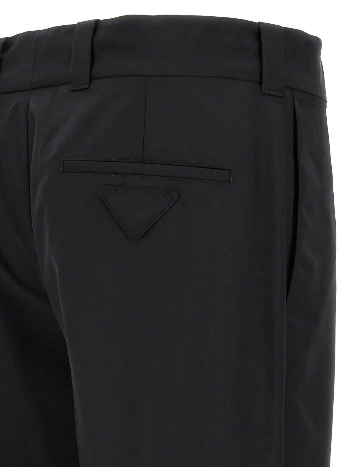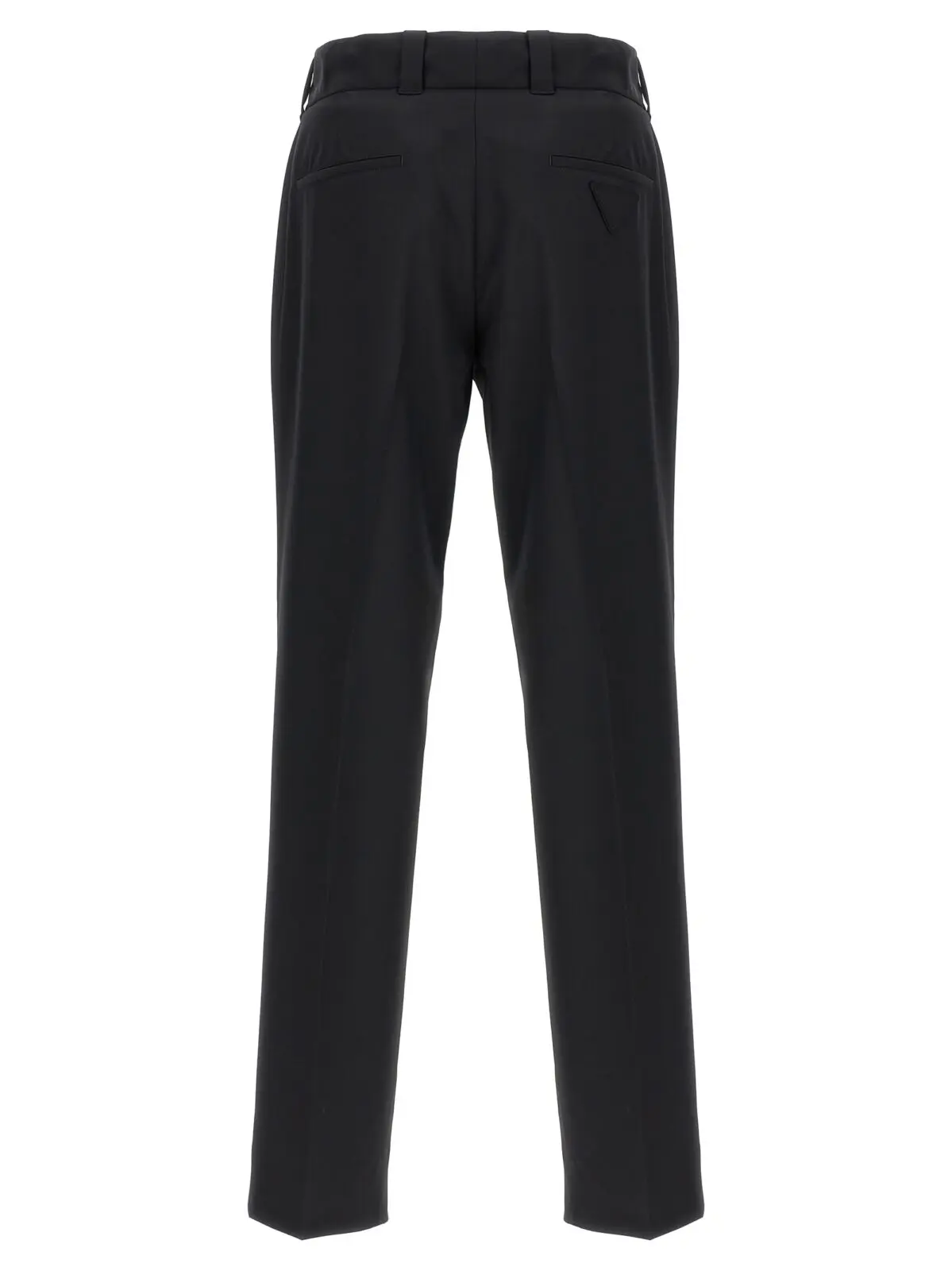 Ці чорні чоловічі штани Prada, виготовлені з високоякісної вовняної суміші, поєднують елегантність і комфорт. Дизайн з прямими штанинами та витонченими складками підкреслює стиль, а регульований шнурок на поясі забезпечує ідеальну посадку. Тонко виконаний трикутний логотип на задній частині додає нотки витонченості. Цей виріб не лише демонструє статус, але й відзначається інноваційним підходом до моди, що робить його універсальним вибором для будь-якої події.