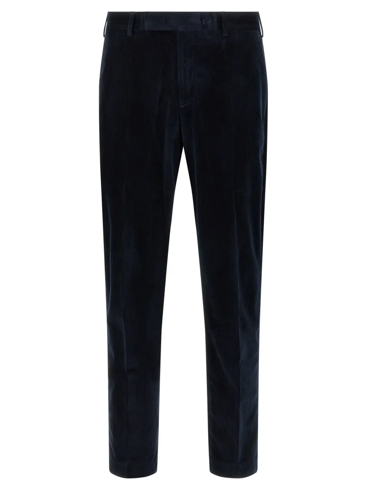 Чоловічі штани з вельвету синього кольору, виконані з високоякісної бавовни з додаванням еластану для комфорту та ідеальної посадки. Еластичний пояс, класична застібка на ґудзик і прямий крій з витонченими складками створюють стильний та універсальний образ, що підкреслює статус і бездоганний смак.