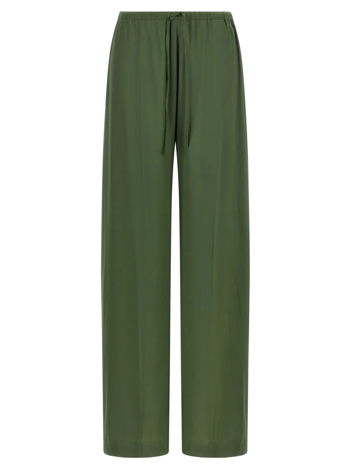 Ці зелені жіночі штани виготовлені з розкішного поєднання 94% шовку та 6% еластану, що забезпечує неперевершений комфорт і легкість. Еластичний пояс з регульованим шнурком і широкий крій штанин створюють вишуканий силует, доповнений витонченою розтягнутою складкою. Стильний і функціональний дизайн підкреслює статусність і сучасний смак, ставши ідеальним вибором для впевнених у собі жінок, які цінують якість та інновації.