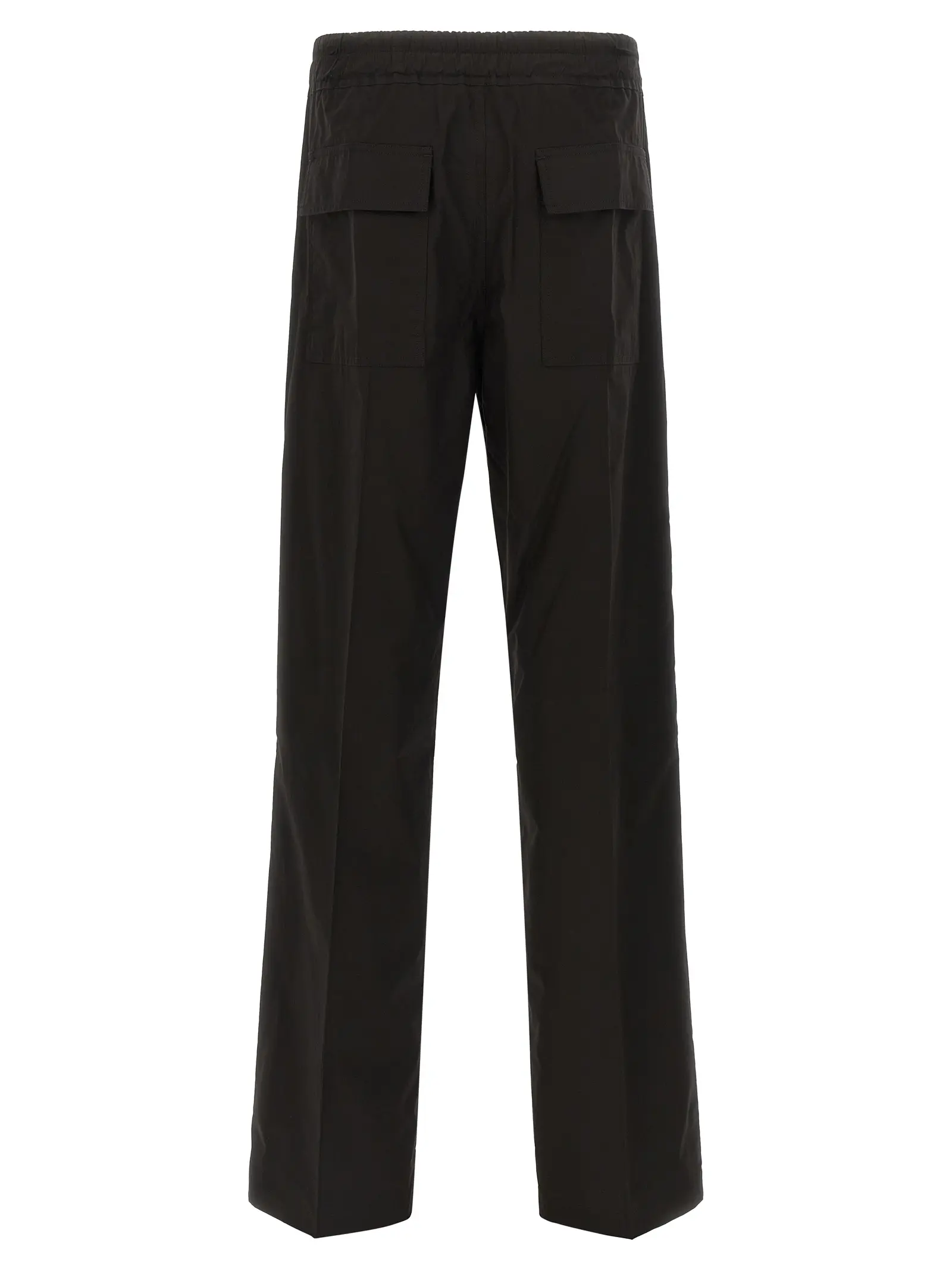 Висока посадка на еластичному поясі з регульованим шнурком задає розслаблений ритм, який врівноважується суворими запрасованими стрілками. Натуральна бавовна робить широкі прямі штанини структурними, а ґудзики на гульфику та зручні кишені додають крою функціональності. Такий силует виглядає водночас впевнено й невимушено, створюючи виразний об’єм завдяки щільній матовій фактурі полотна.