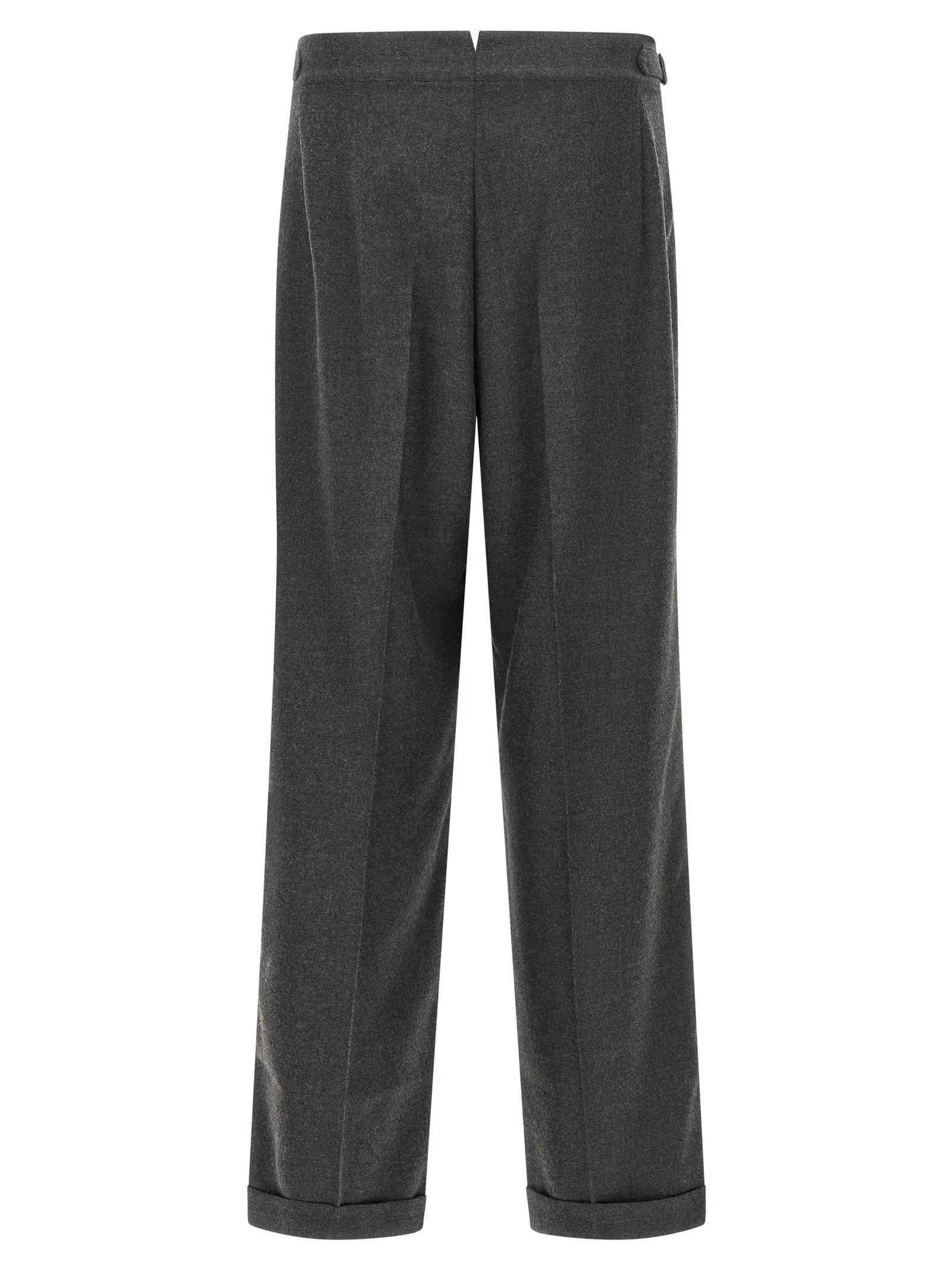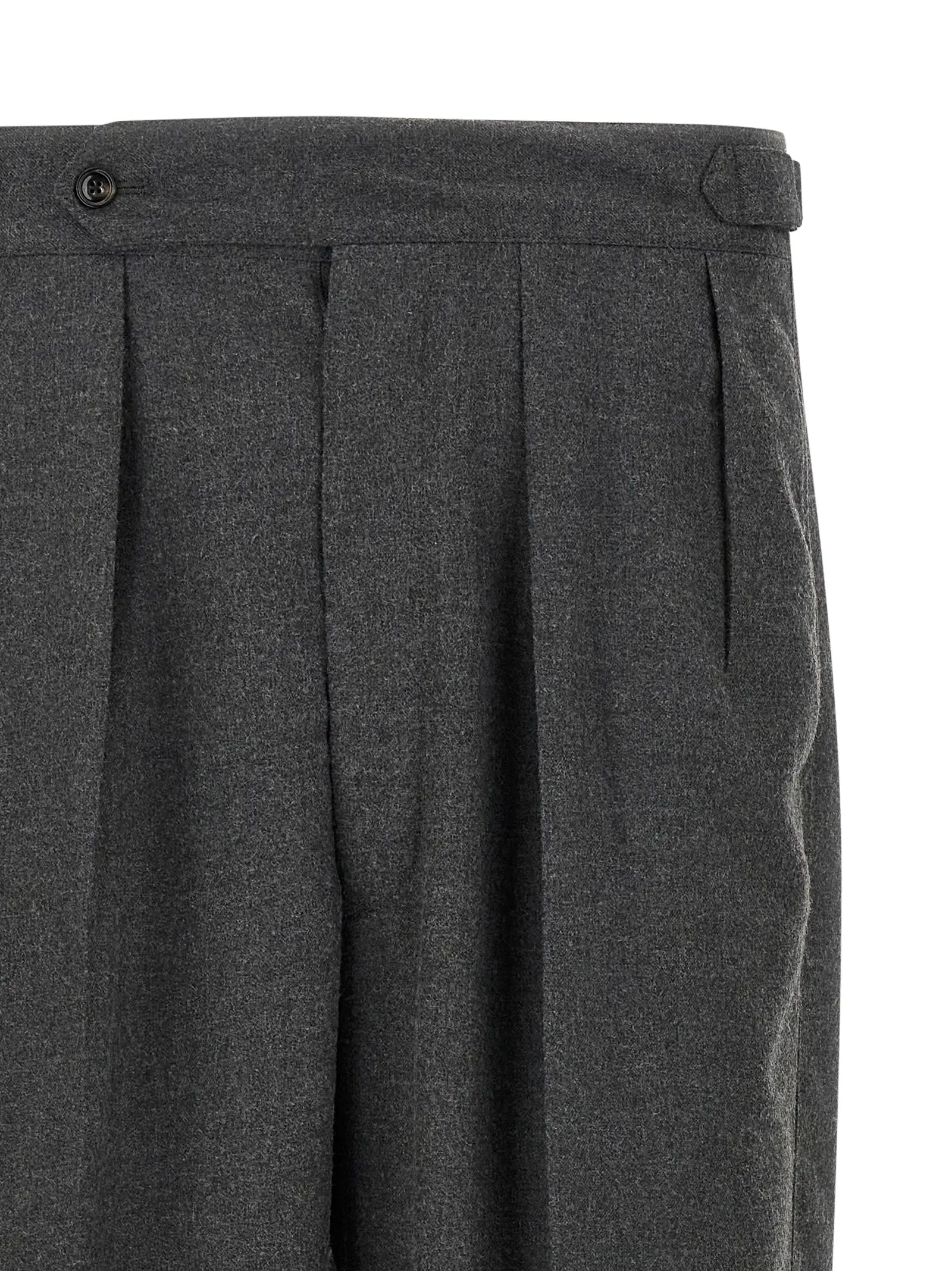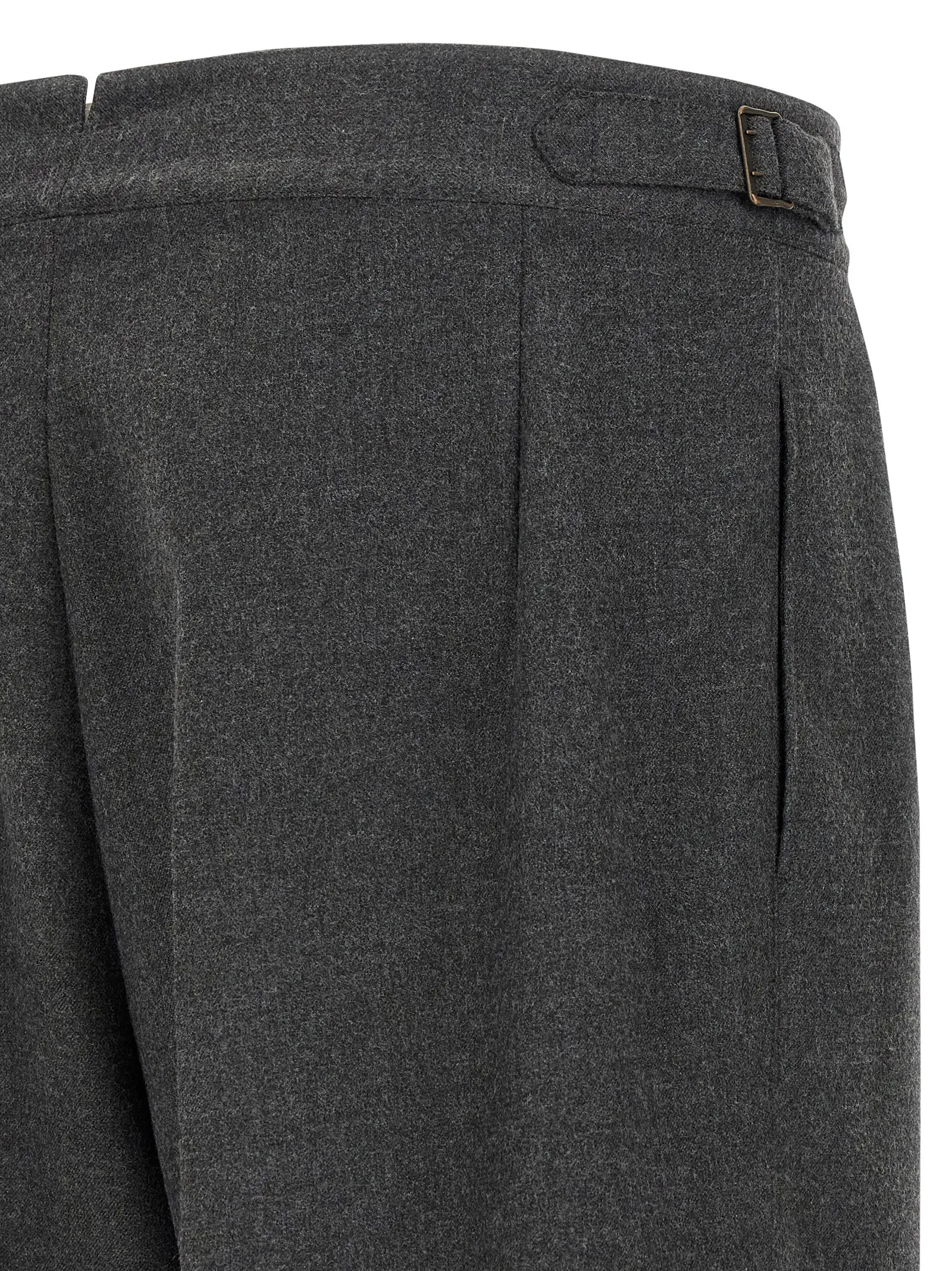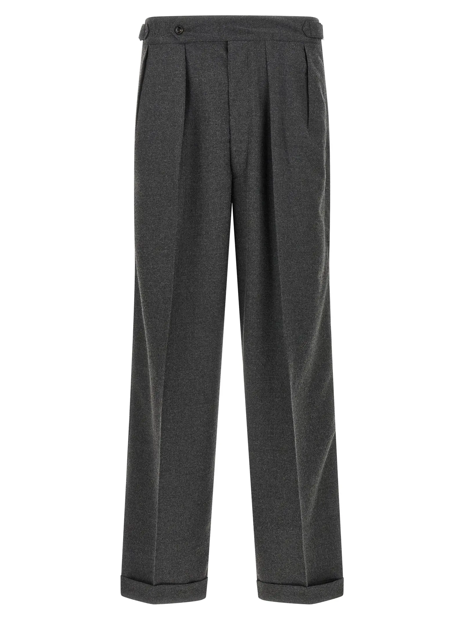 Штани з віскозної суміші з меланжевим ефектом. Застібаються на передні ґудзики. Має регульовані ремінці на талії. Оснащені шпильками. Мають розтягнуту складку. Прямий крій штанин. Низька посадка. Є кишені. Край штанів з відворотом. Склад тканини 65% поліестер, 35% віскоза.