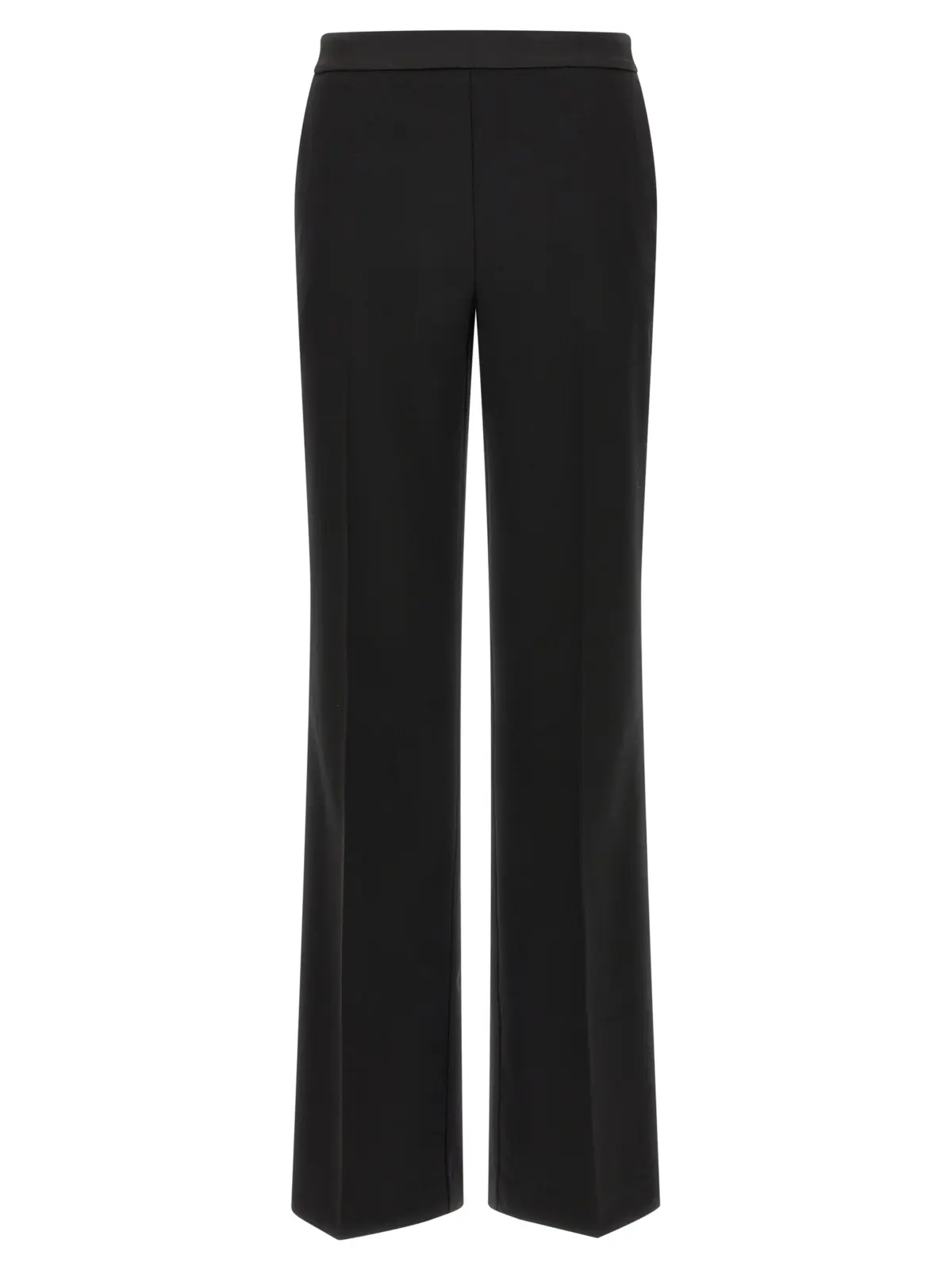 Штани з тканини твіл з вовною та віскозою. Талія з атласною деталлю. Бічна застібка на блискавку. Наявні кишені. Розтягнута складка. Трохи розкльошені штани. Металевий логотип у вигляді овала ззаду. Склад тканини включає поліестер, вовну, віскозу та еластан.