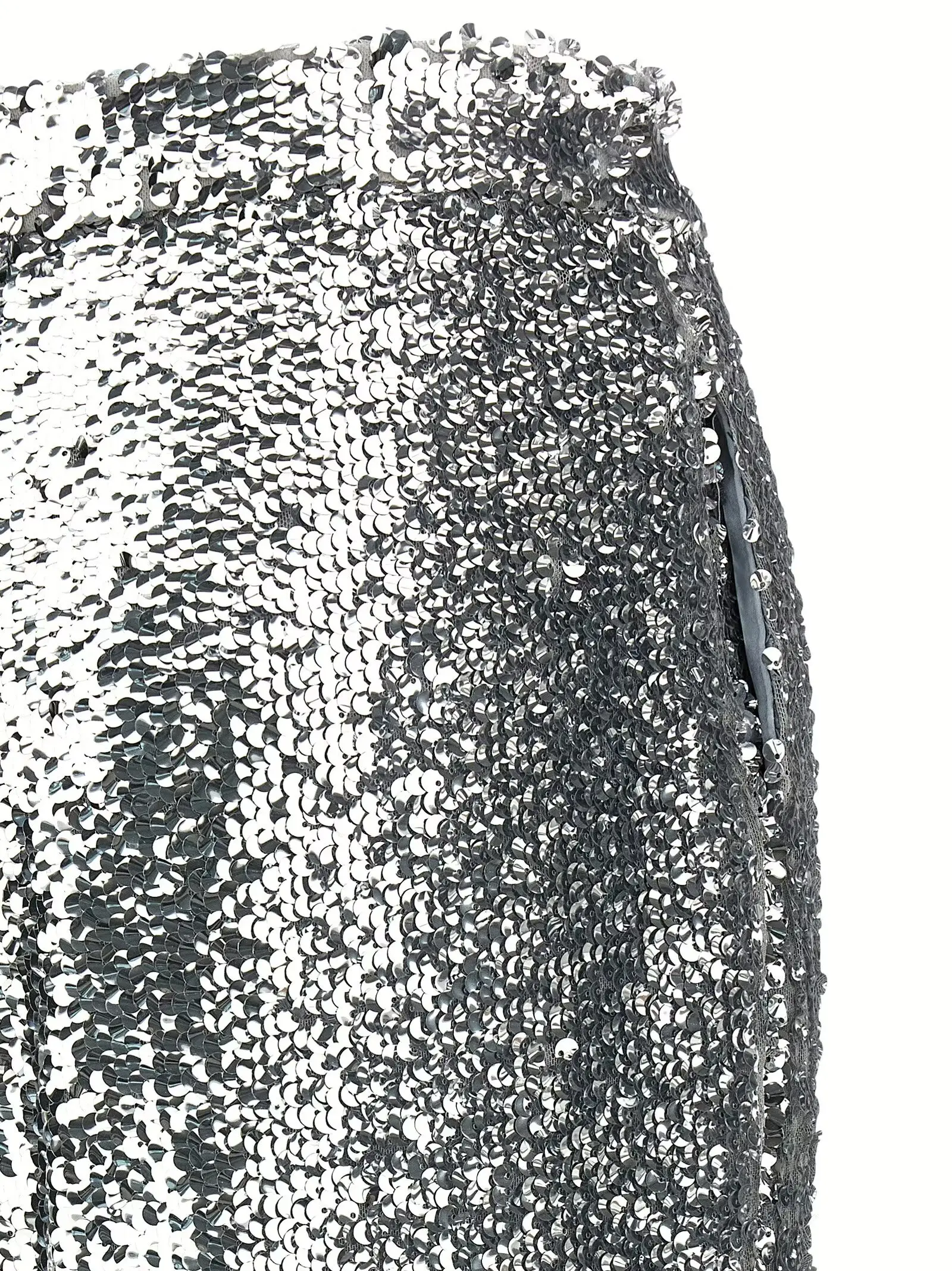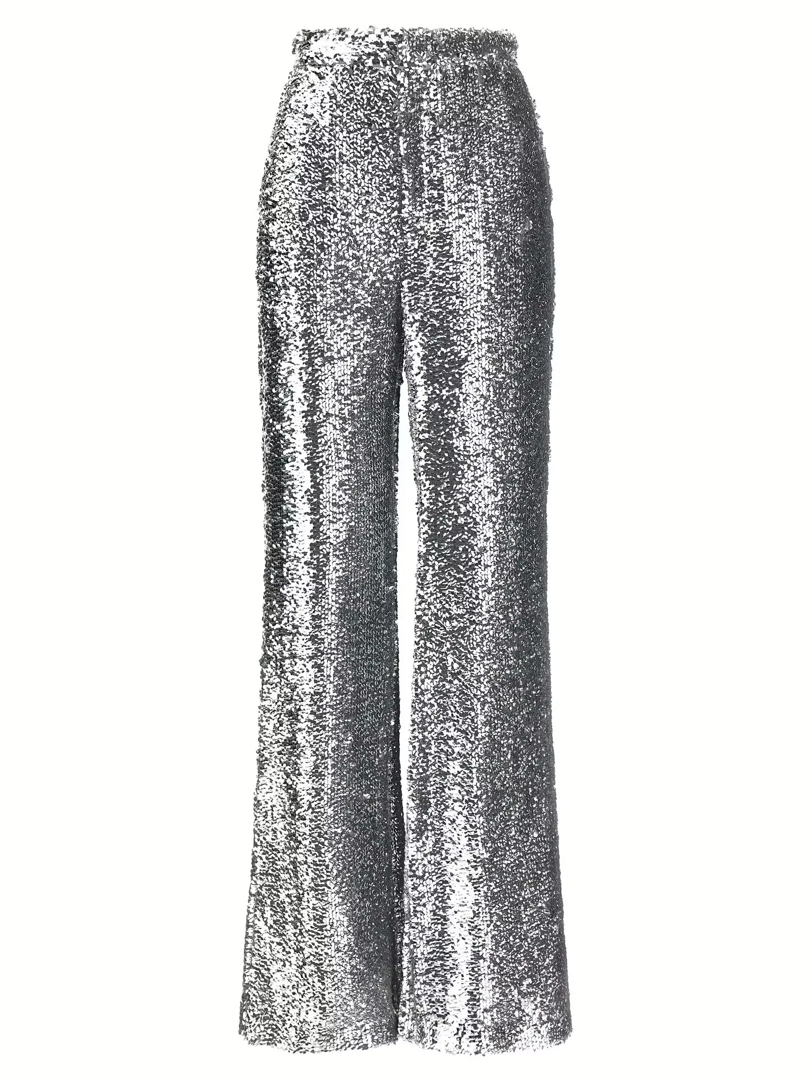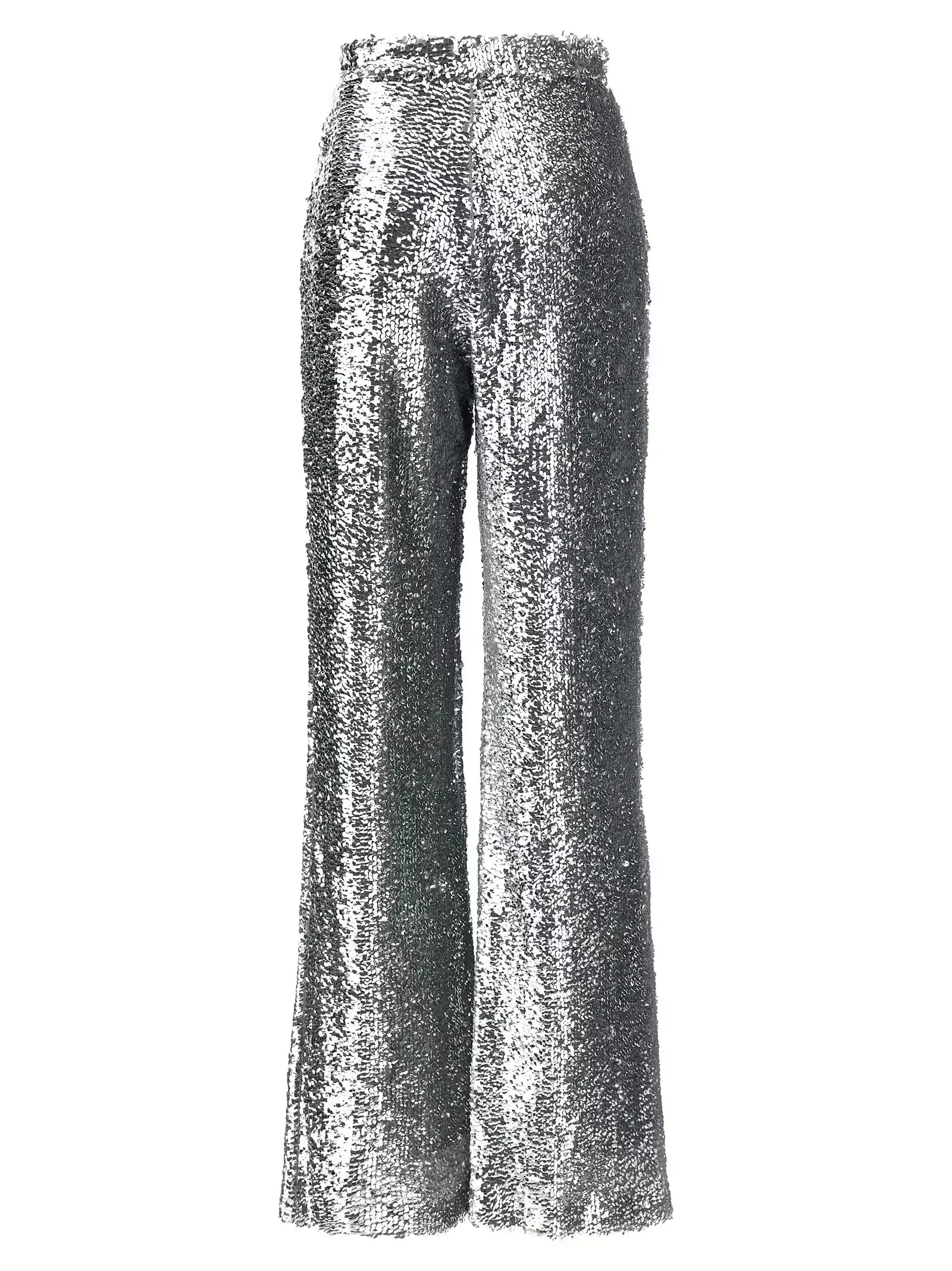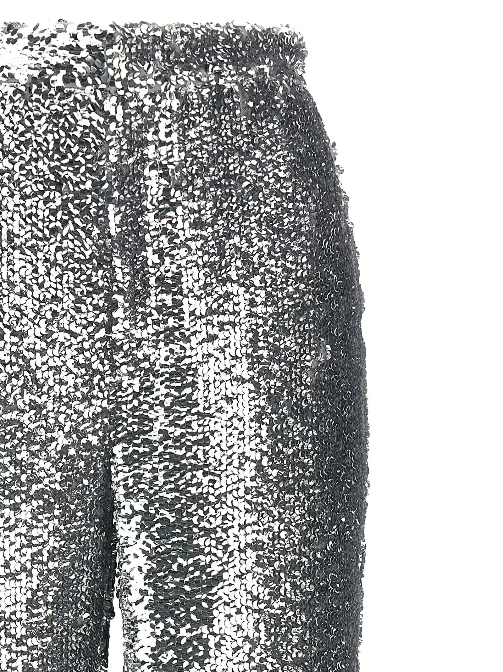 Штани Sequin Giuseppe Di Morabito виконані з високоякісного поліестеру з додаванням еластану, що забезпечує ідеальну посадку та комфорт. Вишуканий сріблястий відтінок з паєтками надає виробу неперевершеного блиску, а висока талія і прямий крій підкреслюють жіночність і стиль, створюючи універсальний образ для будь-яких урочистих подій.