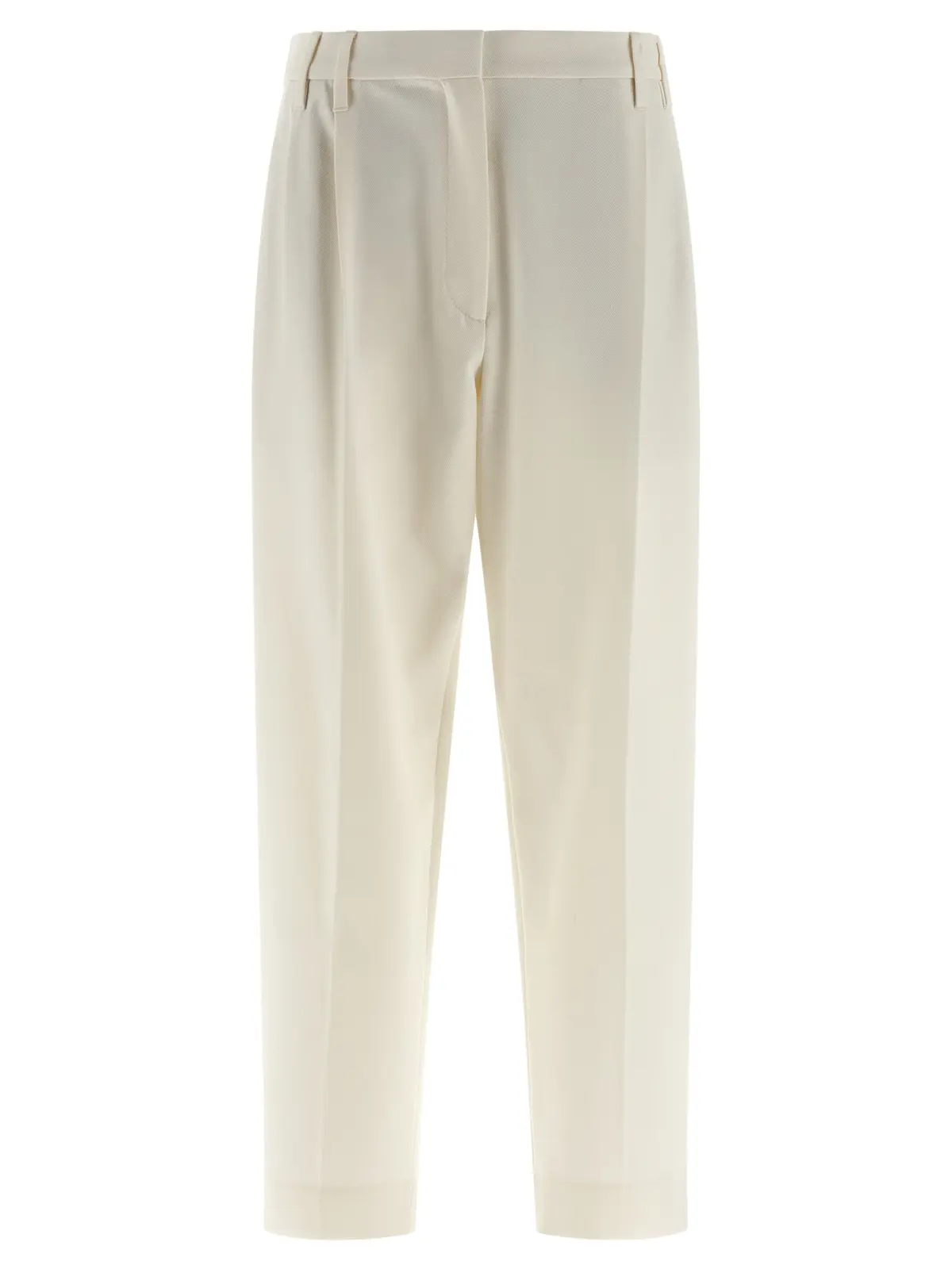 Білі жіночі штани Slouchy виготовлені з еластичного бавовняного матеріалу високої якості, що забезпечує комфорт і витончену посадку. Елегантний дизайн з розширеною складкою, двома передніми пінсерами та функціональними кишенями підкреслює універсальність і сучасний стиль виробу. Застібка на гачок, ґудзик і блискавку гарантує надійність, а деталь ззаду додає особливого шарму, створюючи бездоганний образ для будь-якого випадку.