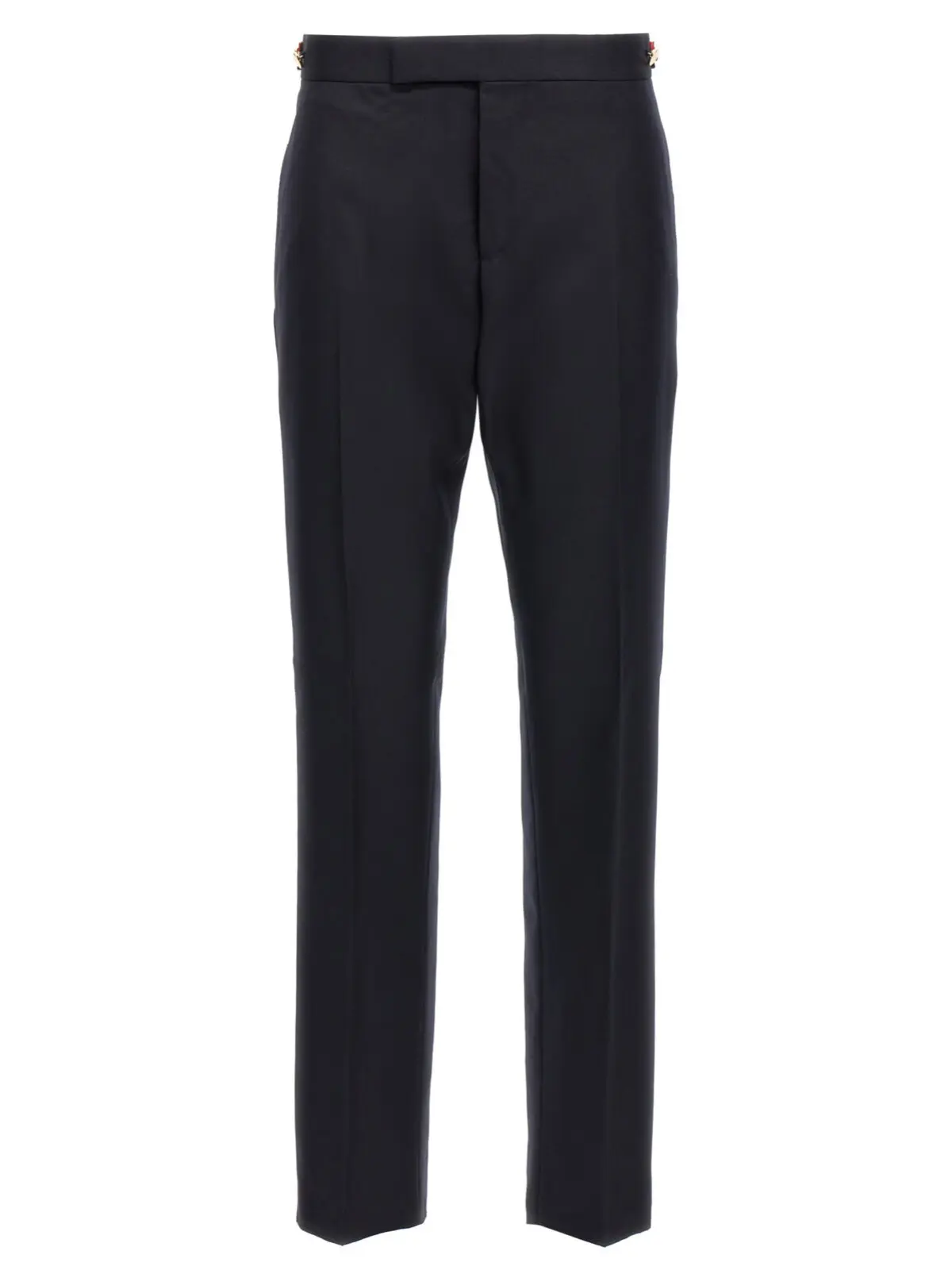 Штани Thom Browne виконані з високоякісної вовняної твілової тканини, що забезпечує комфорт і елегантний вигляд. Модель з низькою талією має класичну застібку на гудзик і гачок, бокові кишені та деталі в стилі 4bar, які підкреслюють унікальність дизайну. Прямий крій з центральною складкою надає виробу строгості та універсальності, що дозволяє поєднувати їх з різними стилями. Цей елемент гардеробу стане ідеальним вибором для сучасного чоловіка, який цінує якість, інновації та статусний вигляд.