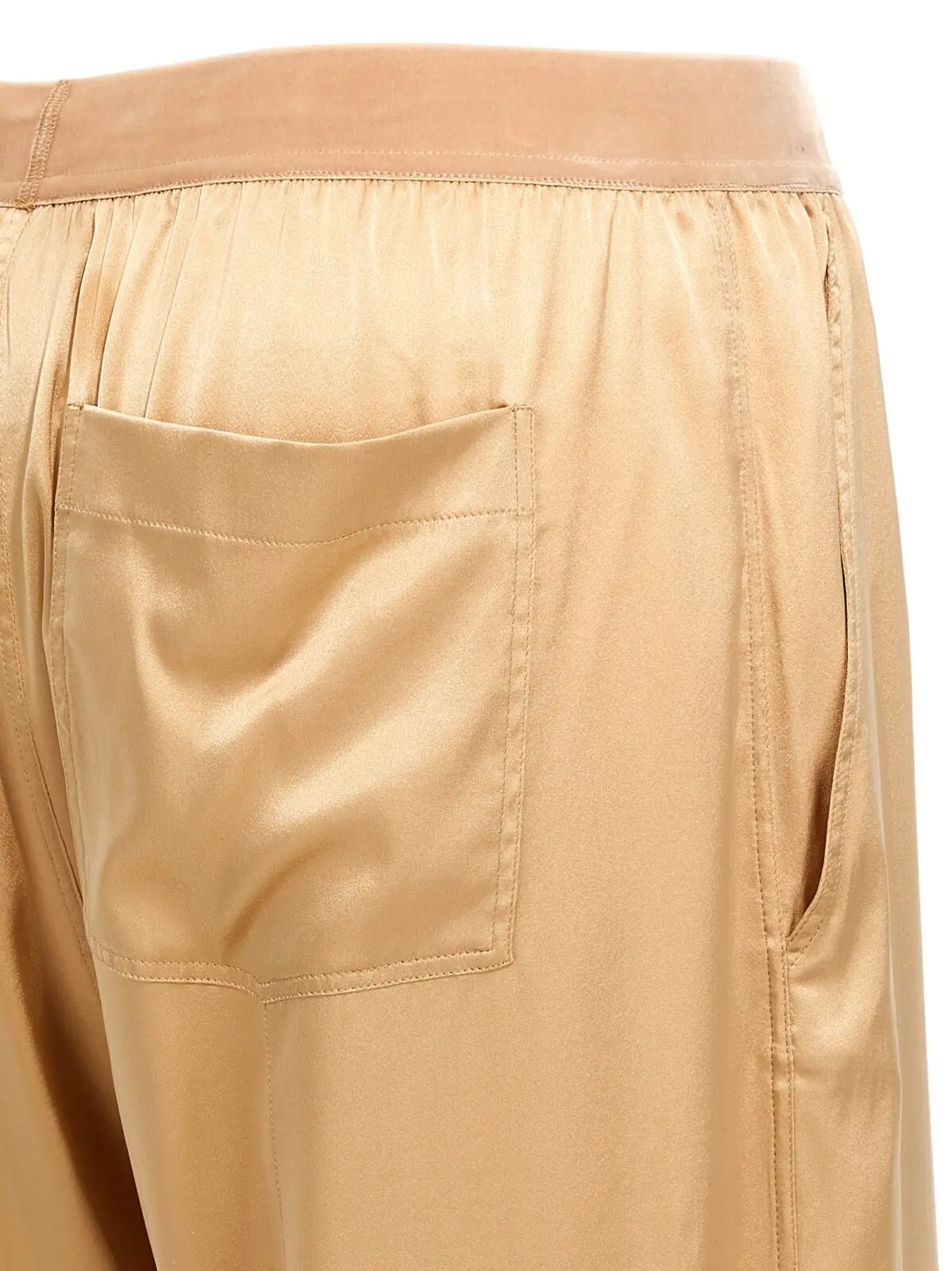Елегантні жіночі штани з бежевого шовку з додаванням еластану, виконані в стилі піжами з прямими штанинами, поєднують комфорт та розкіш. Вишуканий дизайн доповнений оксамитовою еластичною талією з логотипом і практичними кишенями, що підкреслює статус і бездоганний стиль.