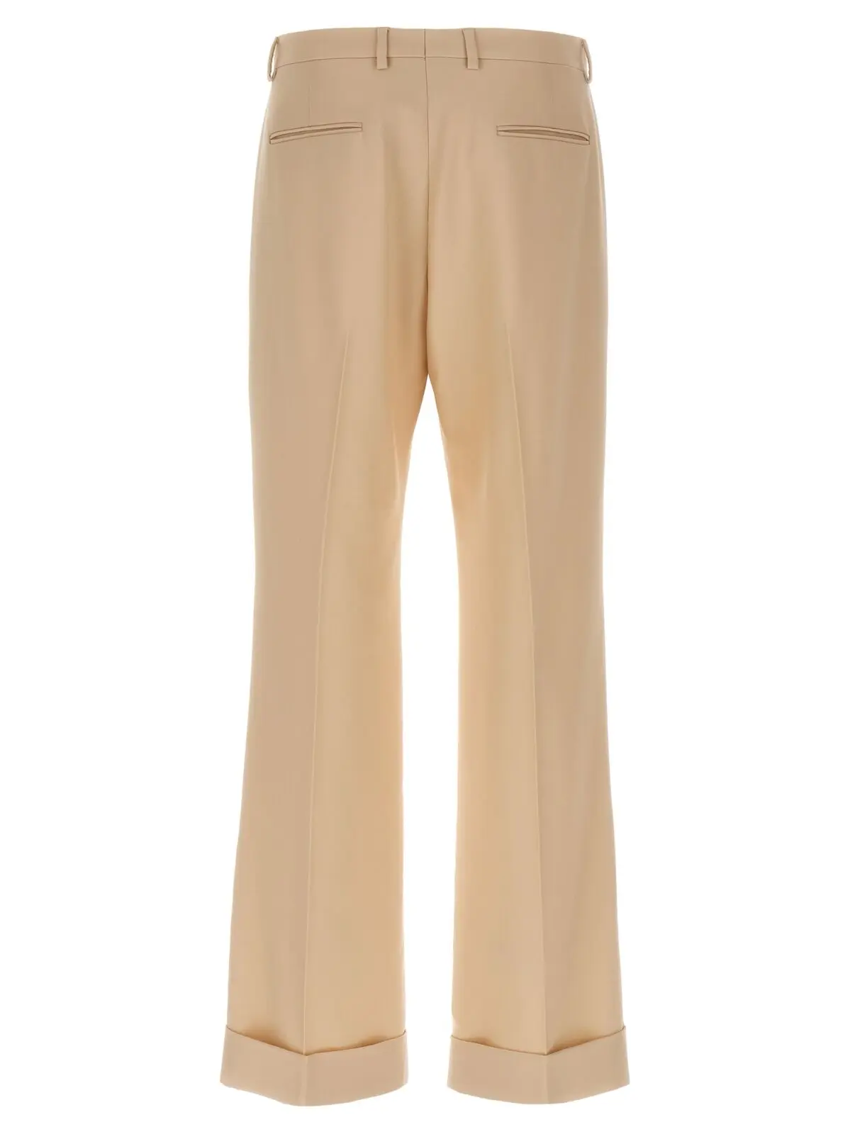 Класичні чоловічі штани Valentino Garavani з бежевого вовняного габардину преміум якості, з передньою складкою та злегка розширеним кроєм біля манжетів. Вишуканий дизайн із застібкою на ґудзик і гачок підкреслює статус і бездоганний стиль, забезпечуючи комфорт і універсальність для офіційних подій.